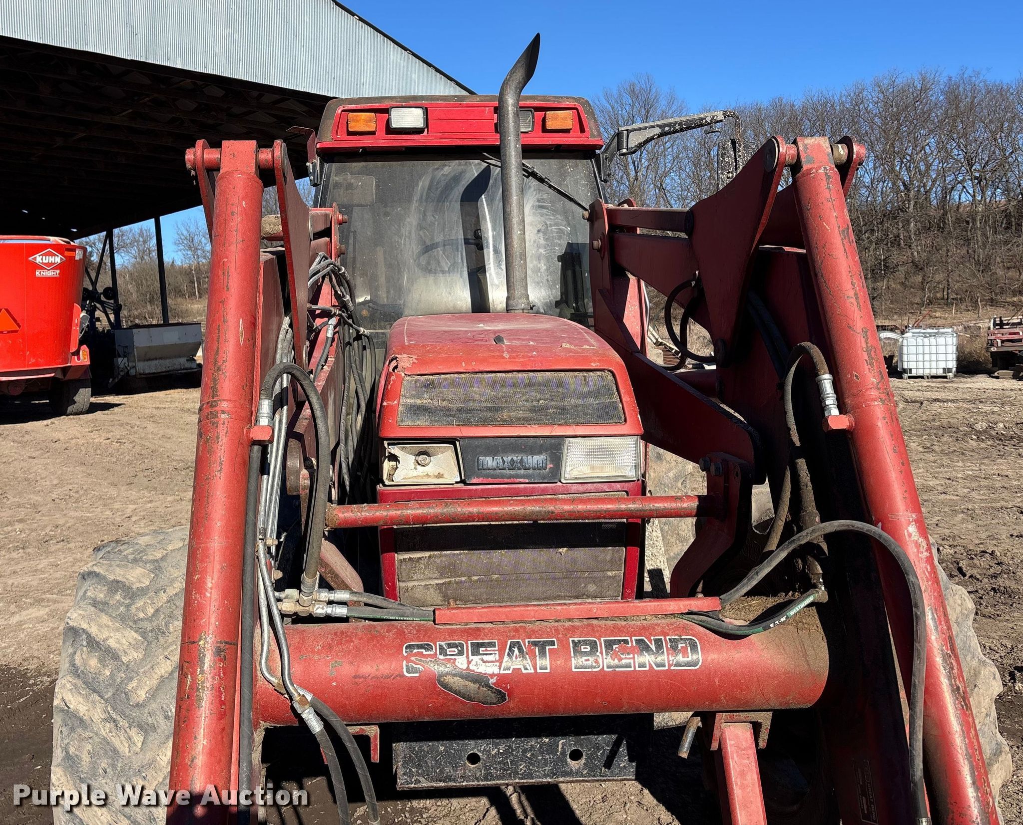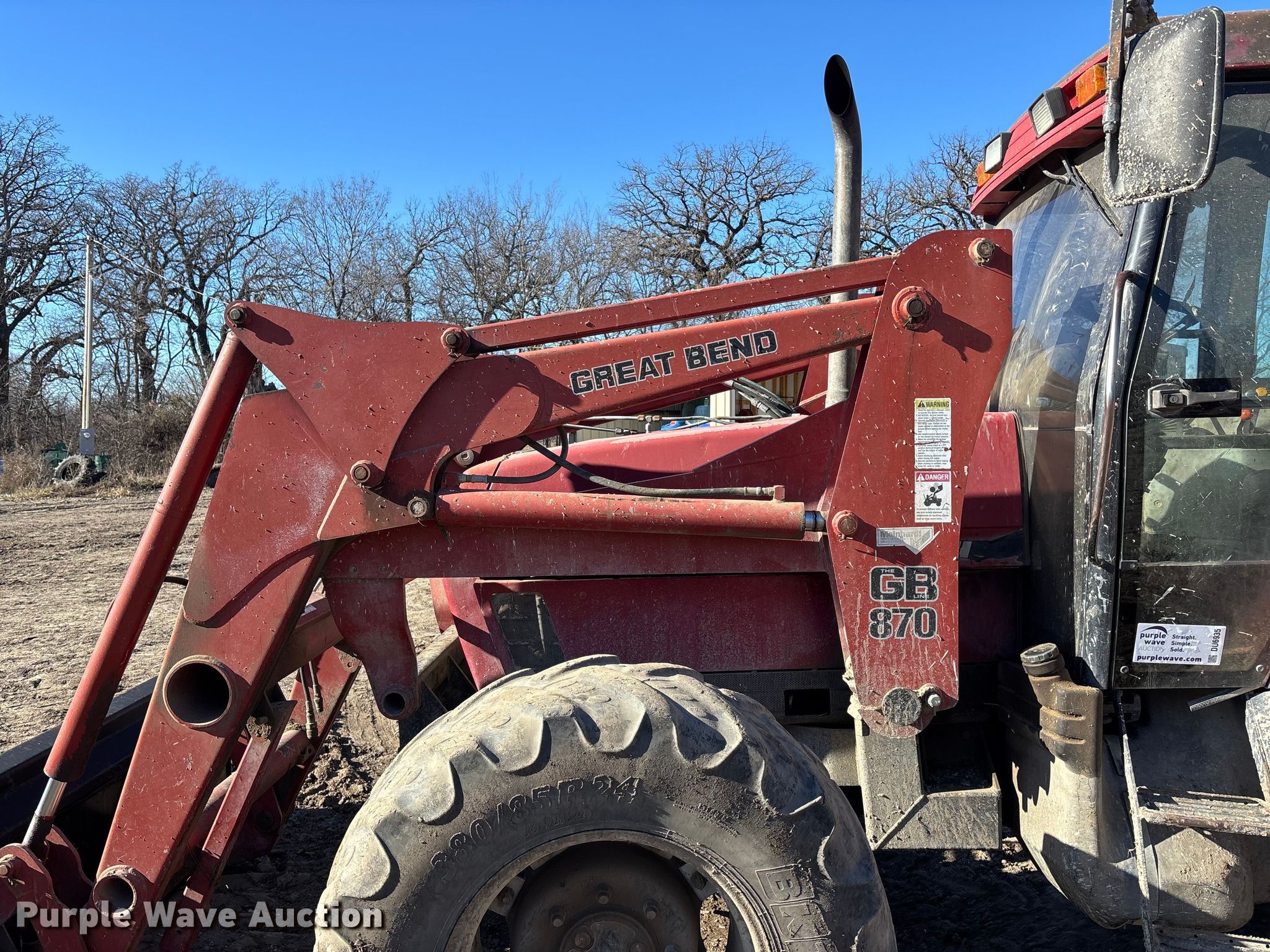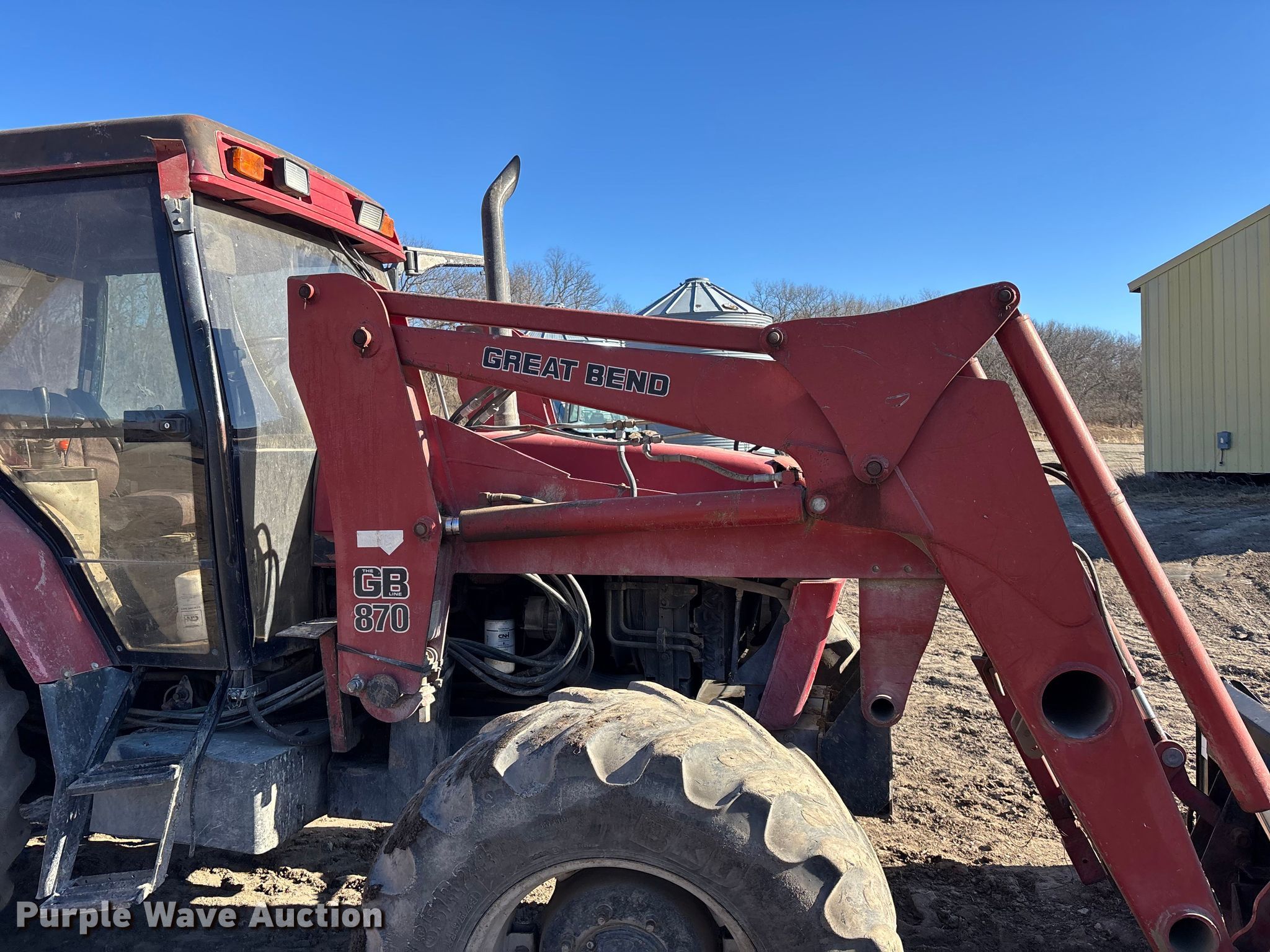 1996 Case IH 5240 MFWD tractor. Hours: 12,622 on meter, Miles or hours may vary, unit still in use, Serial: JJF1059027. Engine Cylinders: 6, Fuel type: Diesel. Transmission Powershift, 16F - 4R, Differential lock. Operators station AC, Heat. Features PTO: 540, Three point, Seven pin outlet, Hydraulic remote sets Front: 1, Rear: 3, Loader Great Bend 870, Quick attach, Controls: Two-lever, Bucket Width: 84", Bucket Width: 8', Hoelsher small square bale pickup Bale capacity: 10, Hydraulic spike Widths: 6', 7'.. Tires Front: 380/85R24, Rear: 480/80R38. Kenny. Westmoreland, KS 66549