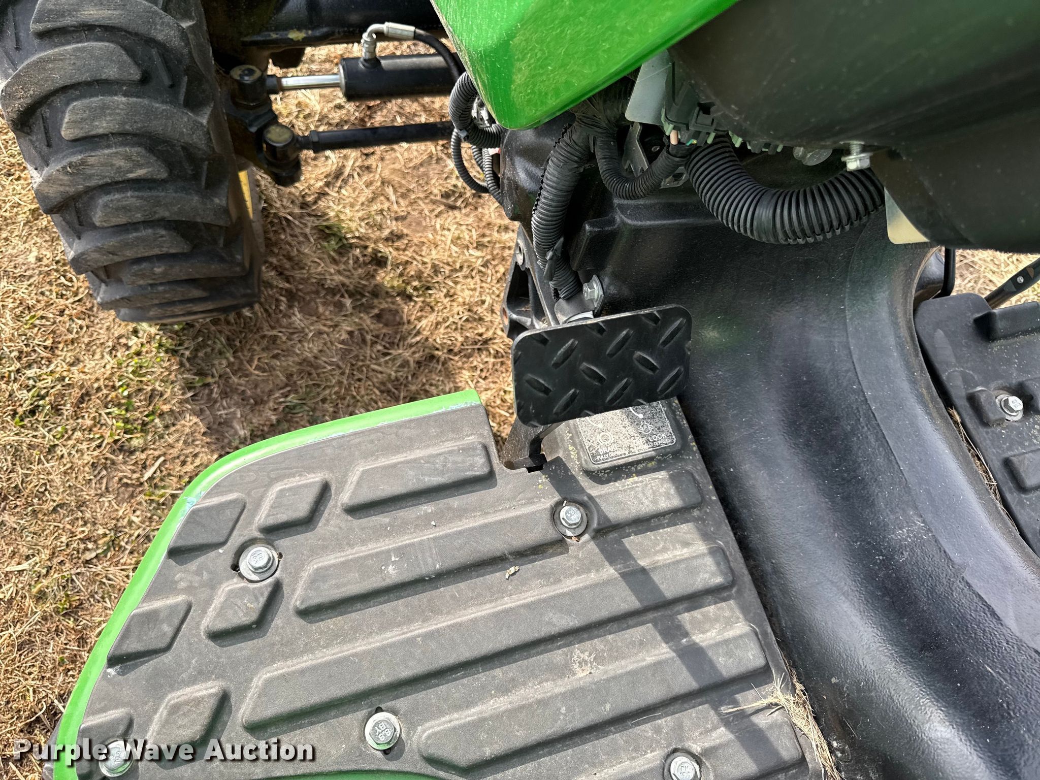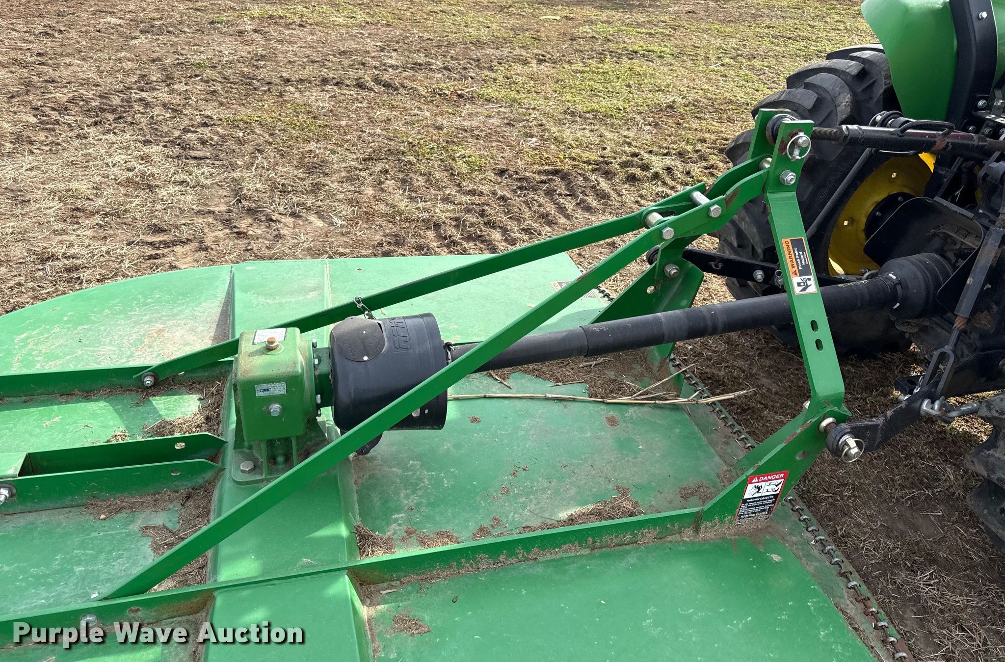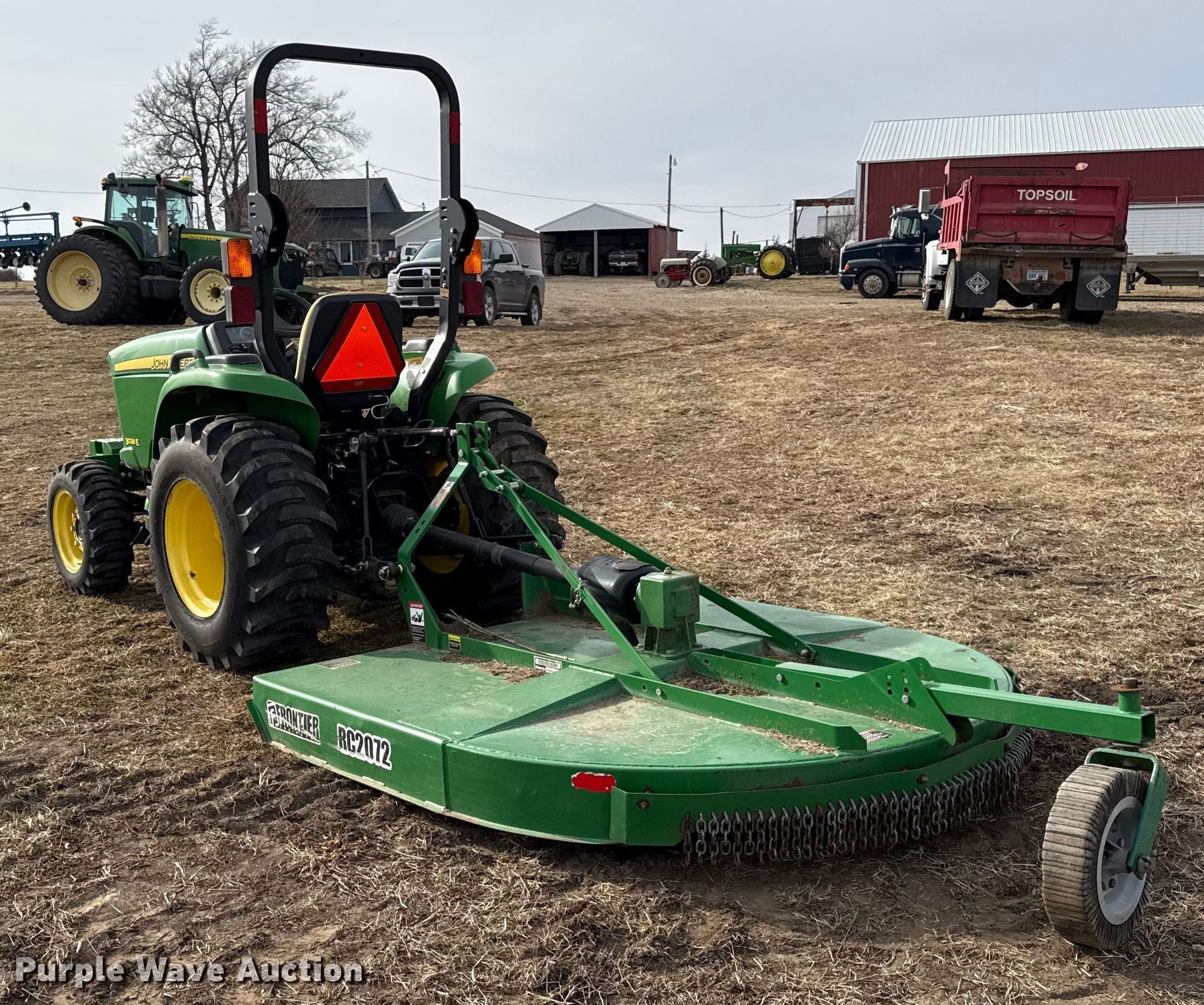 2015 John Deere 3038E MFWD tractor. Hours: 235 on meter, Serial: 1LV3038EKFH714664. Engine Yanmar, Displacement: 1.5L, Cylinders: 3, Fuel type: Diesel. Transmission Hydrostatic, Differential lock. Features PTO: 540, Three point Top link, Frontier RC2072 rotary mower Width: 72". Tires Front: 25x6.50-14, Rear: 15-19.5. Notes Jump start required during on-site data collection. Council Grove, KS 66846