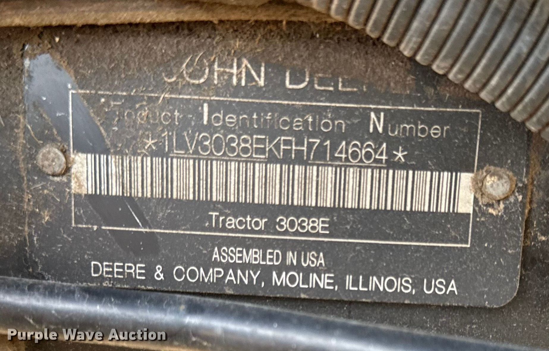 Purple Wave is selling a used Tractor in Kansas. This item is a 2015 John Deere 3038E MFWD tractor with the following: Hours: 235 on meter, Serial: 1LV3038EKFH714664