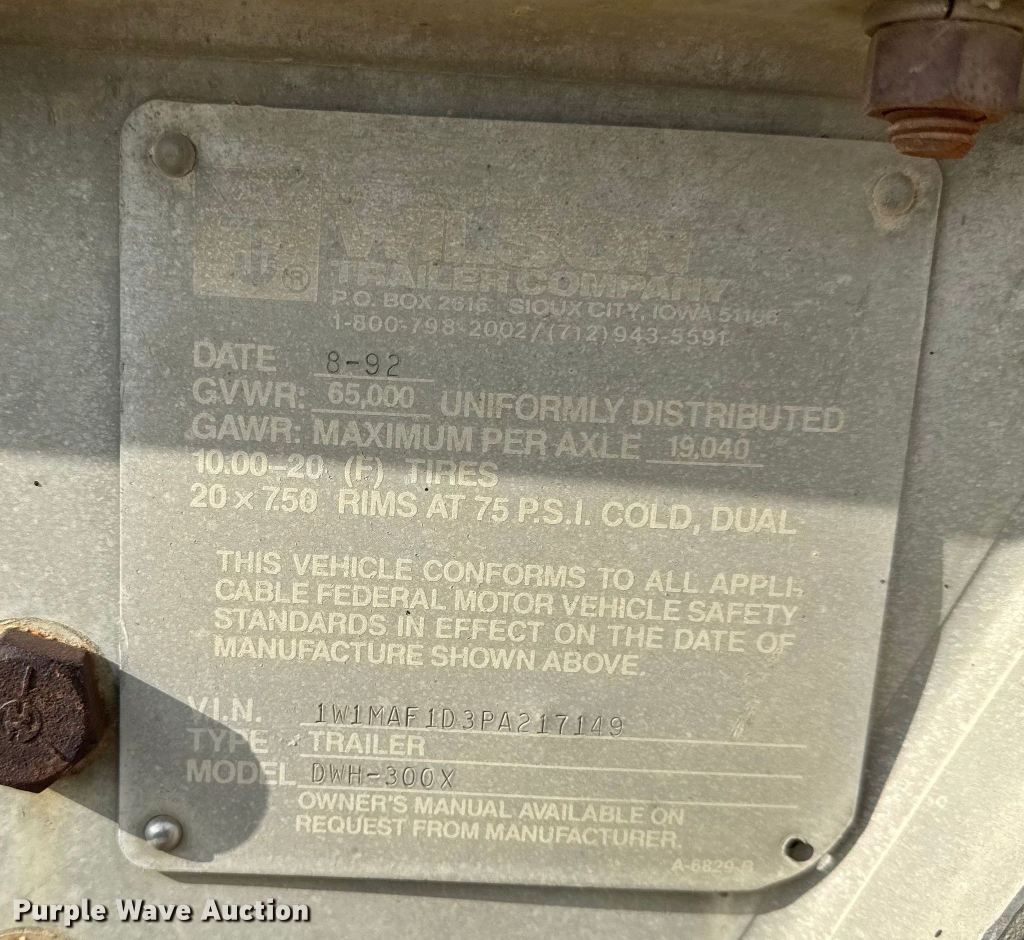 Purple Wave is selling a used Grain or Commodity Trailer in Kansas. This item is a 1993 Wilson Pacesetter grain trailer with the following: VIN: 1W1MAFID3PA217149