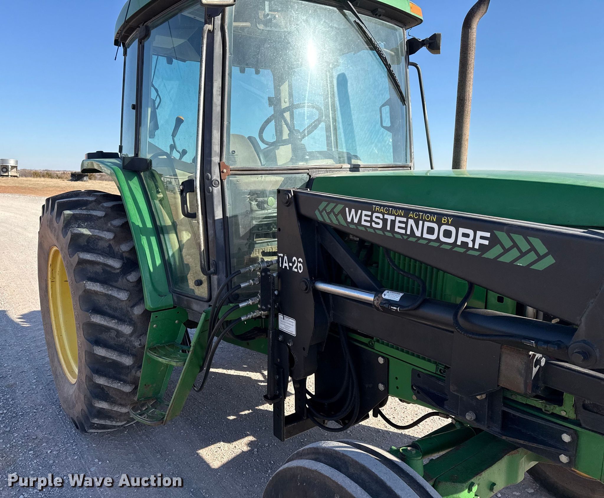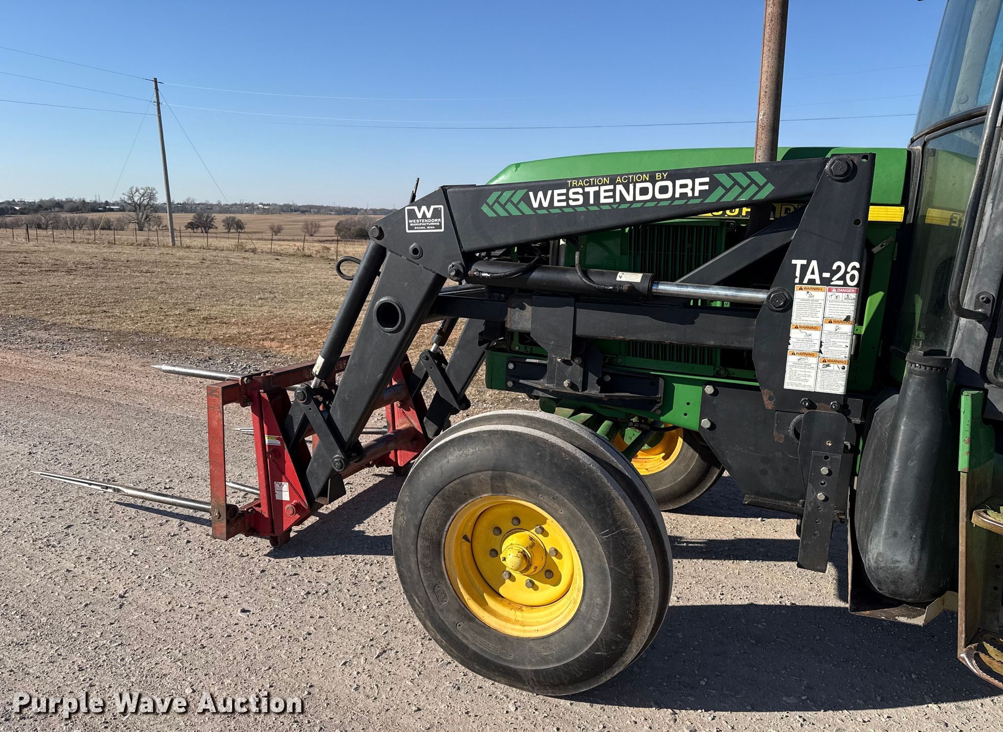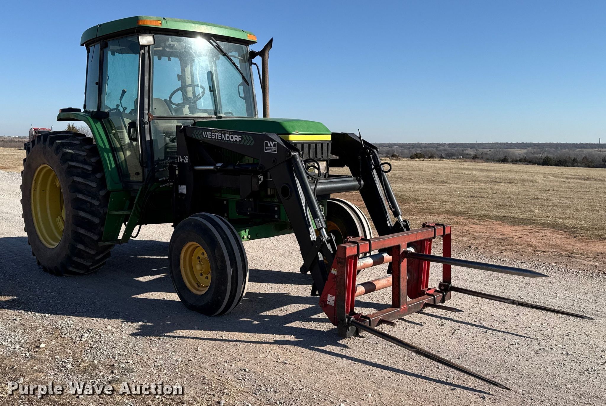 John Deere 6405 tractor. Hours: 2,396 on meter. Engine John Deere 4045TL062, Serial: CD4045T672592, Displacement: 4.5L, Cylinders: 4, Fuel type: Diesel. Transmission Synchro, 12F - 4R, Differential lock. Operators station AC, Heat. Features PTO: 540, Three point, Seven pin outlet, Hydraulic remote sets Rear: 2, Loader Westendorf TA-26, Bale spear, Controls: Two-lever, Bucket Width: 72".. Tires Front: 10.00-16, Rear: 18.4-34. Notes Heater block disconnected. Blanchard, OK 73010