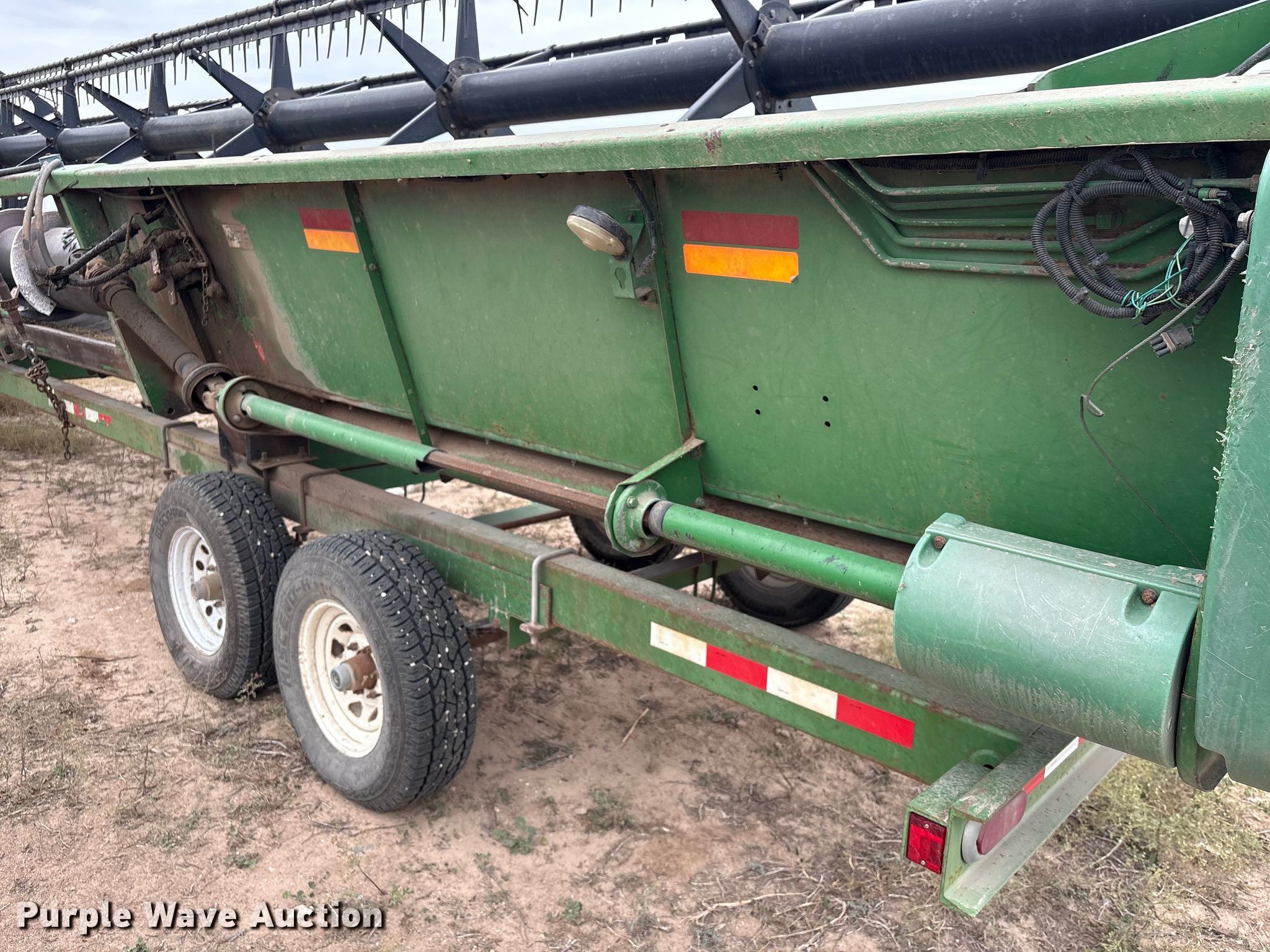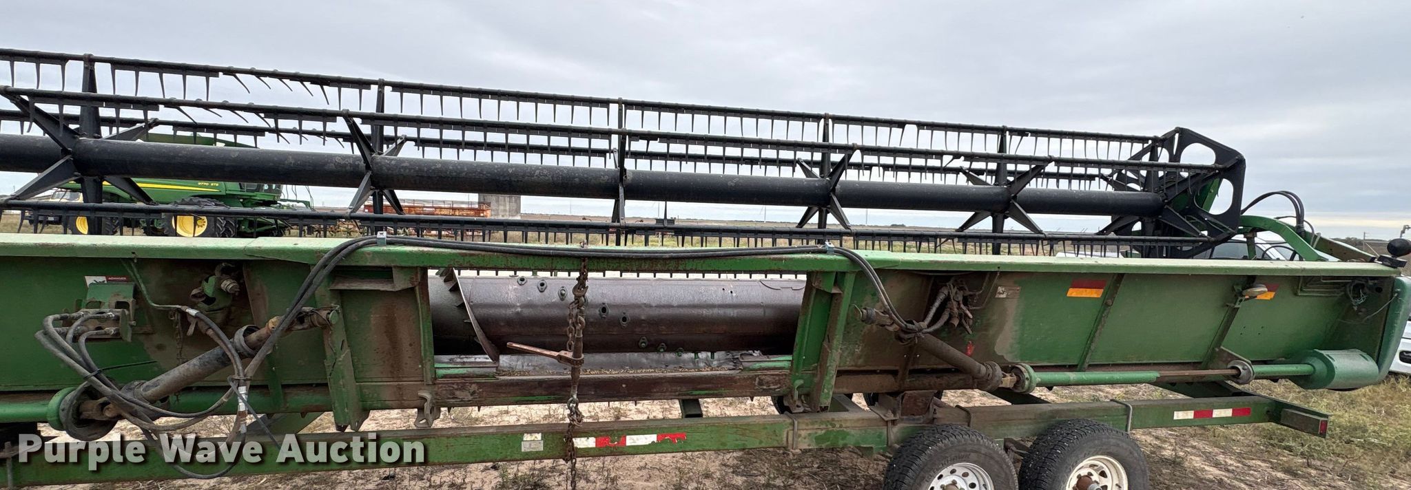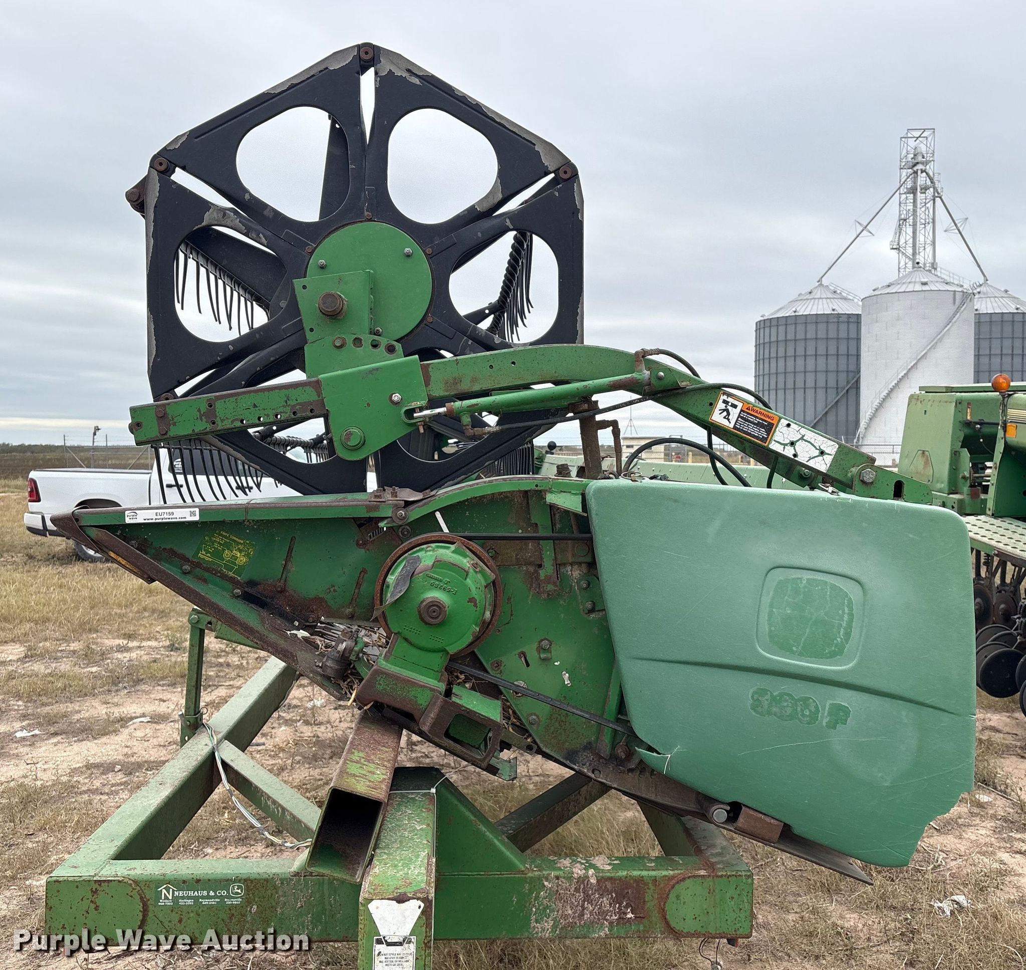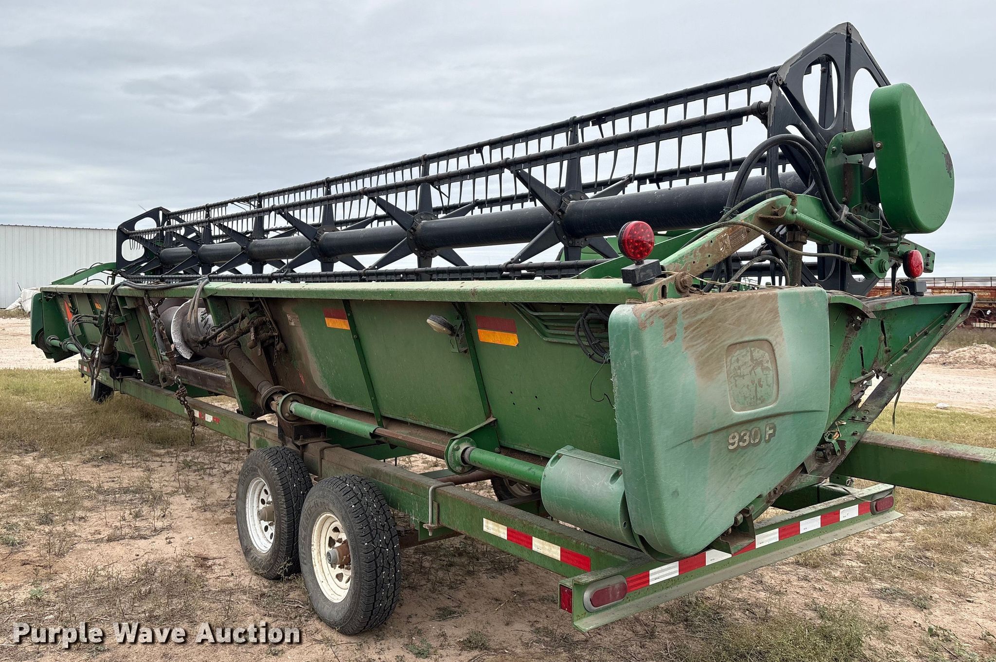 John Deere 930F flex head. Serial: H00930F696586. Features Drivelines: Dual, Width: 30', Skid plates: Poly, Steel, PTO: 1000. Notes Trailer not included, Unknown operating condition. Mike Zimmerer. Monte Alto, TX 78538