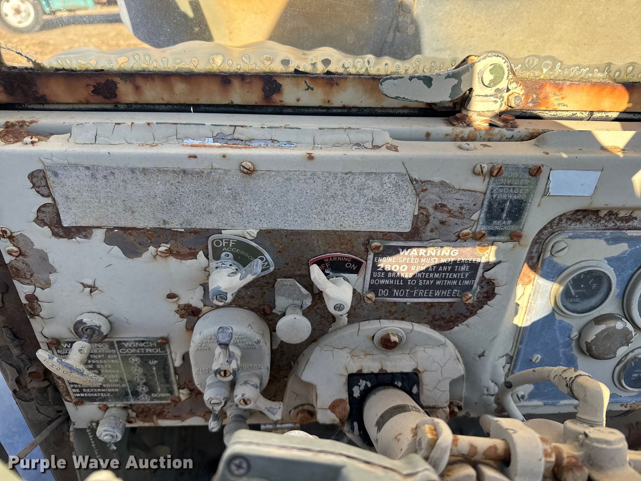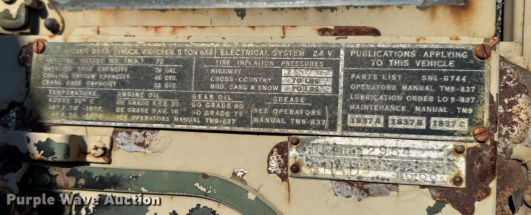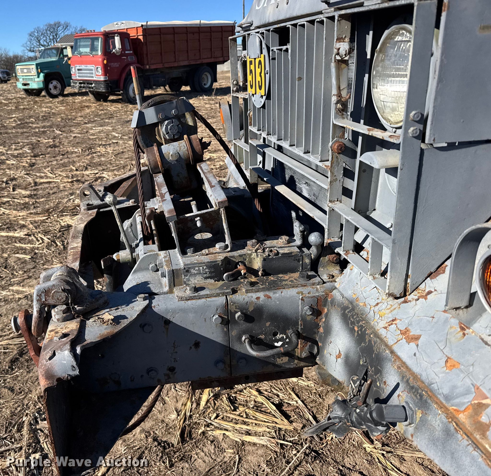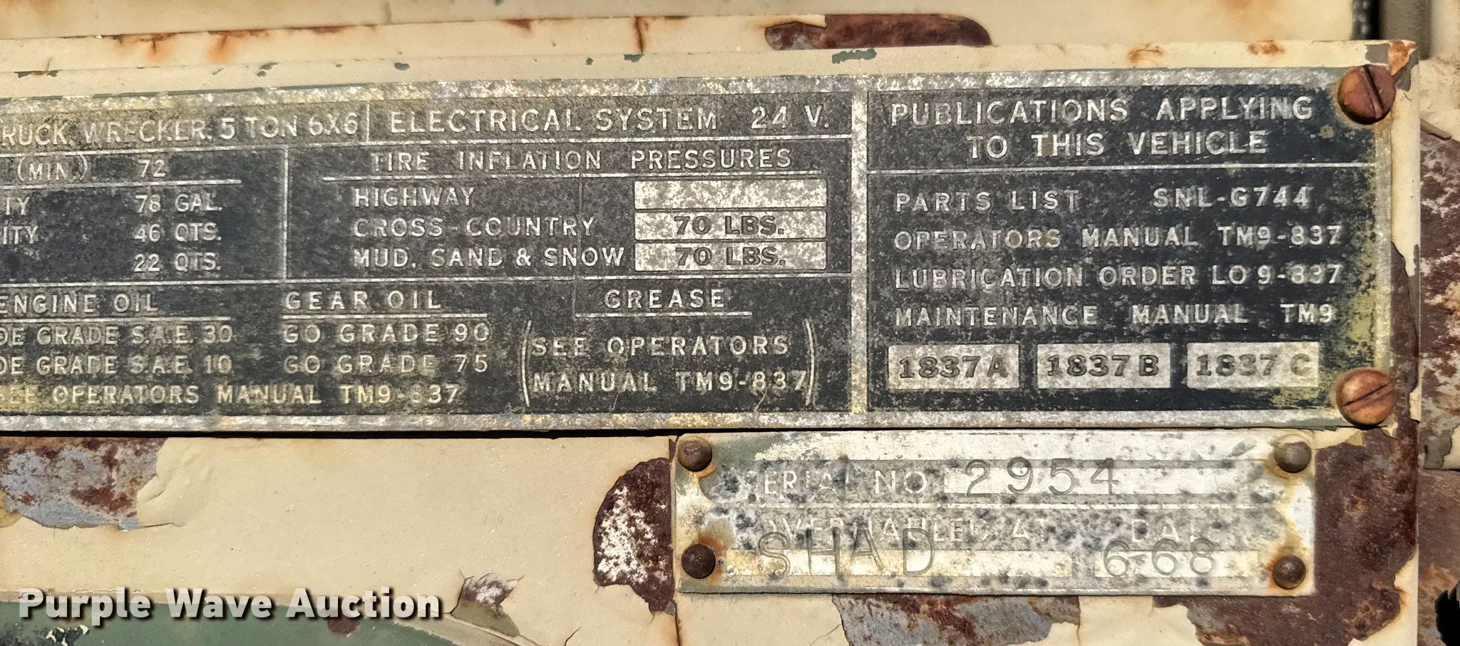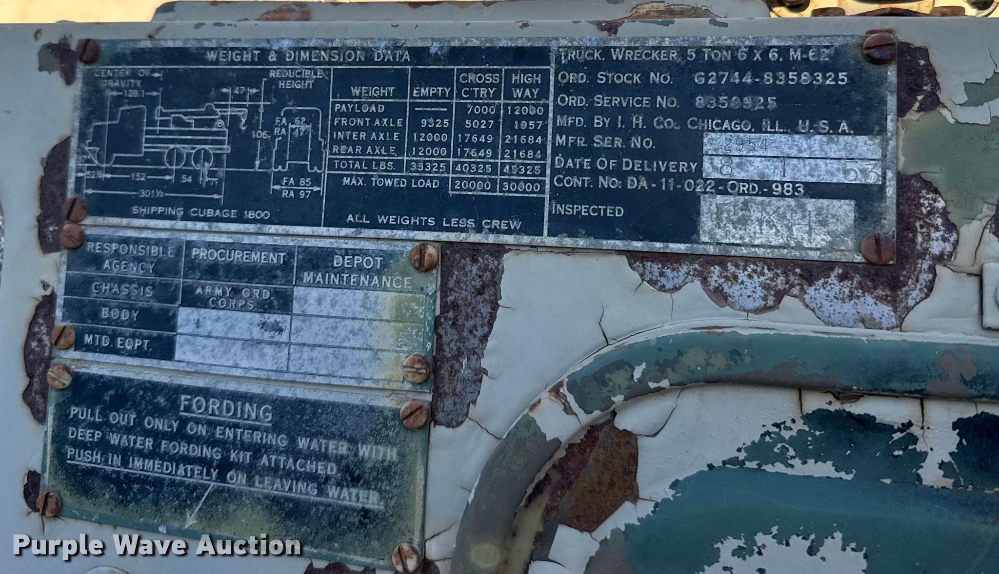 1953 IHC M62 tow truck. Miles: 16,668 on odometer, Hours: 974 on meter, VIN: 2954IHC. Engine Cylinders: 6, Fuel type: Gas. Transmission Manual, Speed: 5. Chassis Four wheel drive, Axles: Tandem, Suspension: Spring, Brakes: Air over hydraulic, PTO. Features Bed Wrecker bed, Length: 14', Width: 96", Wrecker boom: Hydraulic Rotator, Capacity: 20,000 lbs, Front winch Capacity: 20,000lbs, Rear winch Capacity: 45,000lbs.. Tires Size: 11.00-20. Notes Batteries not included, Fuel system issues, fuel tank disconnected Plastic auxiliary tank included, Unknown operating condition of rotator. Kansas antique title. Title distribution may be delayed up to 14 days from verification of funds. J. C. Finney Co.. Beloit, KS 67420