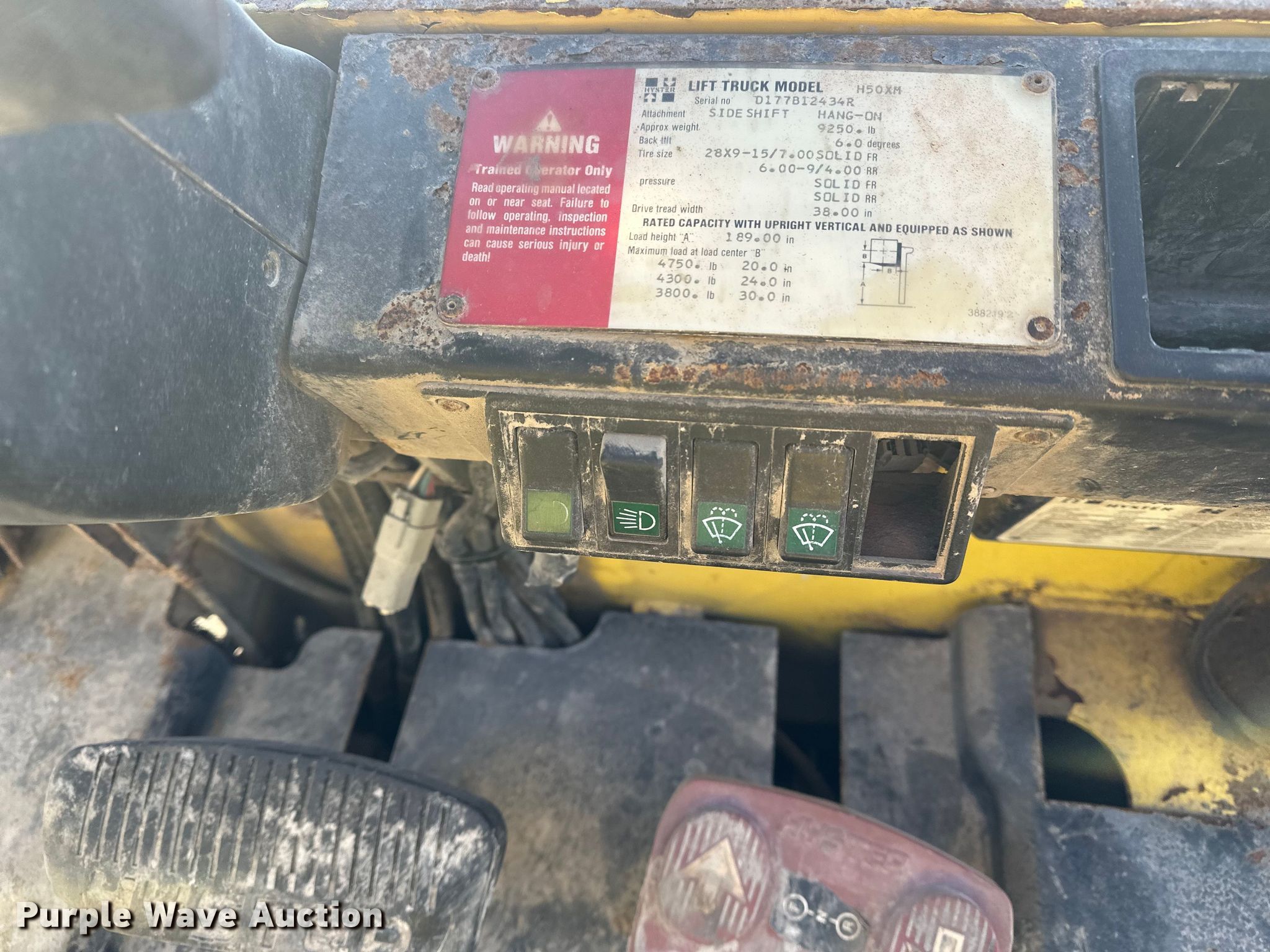 Hyster H50XM forklift. Hours: Unknown, Serial: D177B1234R. Engine Cylinders: 4, Fuel type: LPG LP bottle: Not included. Transmission Hydrostatic. Features Maximum lift capacity: 4,750 lbs, Maximum lift height: 189", Collapsed mast height: 83", Mast stages: 3, Side shift, Mast tilt, Fork length: 42". Tires Front: 28x9-15, Rear: 600-9-3.00, Solid. Notes Non-operational unit. MFA Inc. Albany, MO 64402