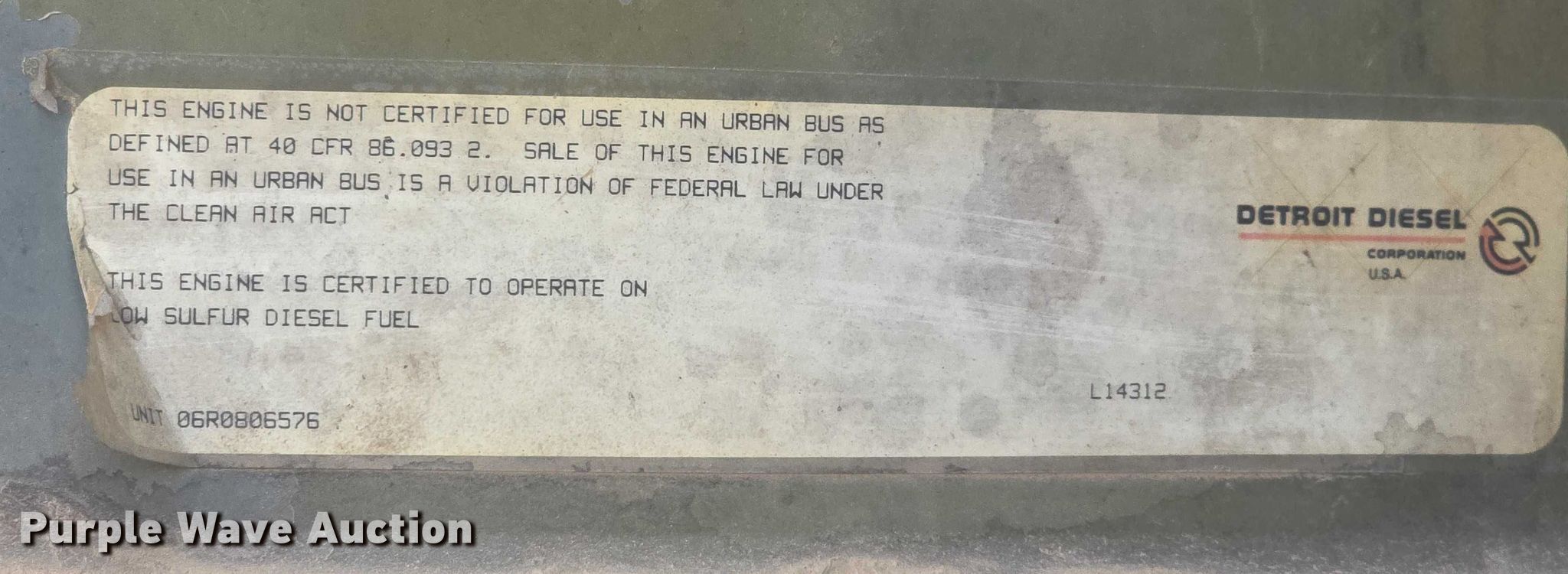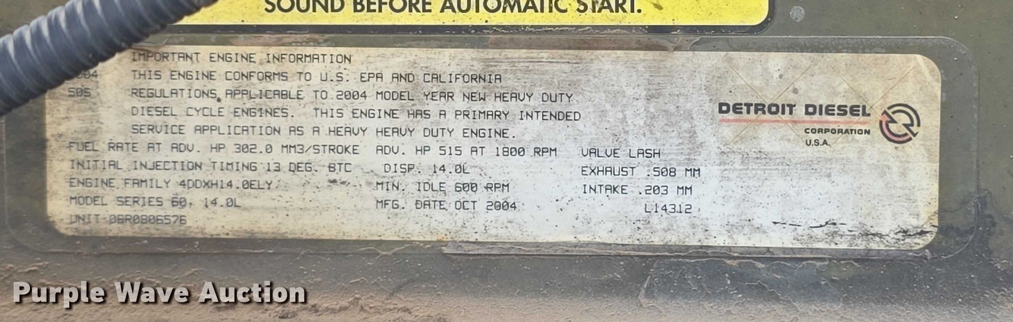 2005 Freightliner CST120 semi truck. Miles: 781,759 on odometer, Hours: 2,133 on meter, VIN: 1FUJBBCK05LN99665, Unit #: 52-33. Engine Detroit Diesel Series 60, Displacement: 14.0L, Cylinders: 6, Fuel type: Diesel, Engine brake. Transmission Automated manual. Chassis Axles: Tandem, Differential lock: Inter-axle, Suspension: Air Dump valves, Brakes: Air, Truck chassis: 160", GVWR: 52,000 lbs FAWR: 20,000 lbs, RAWR: 20,000 lbs, Wheelbase: 234". Interior AC, Heat, Heated mirrors, Cruise control, Air ride cab, Sleeper Sleeper length: 86", Beds: Single, Refrigerator, Rear climate control. Features Deck plate: Aluminum, Fifth wheel type: Air operated, Sliding, Fuel tank: Dual. Tires Size: 11R22.5. Notes Dash warning indicator: ABS, Air suspension issues, passenger side air bag doesn't inflate. Kansas title. Title distribution may be delayed up to 14 days from verification of funds. BK Farms. Baldwin City, KS 66006