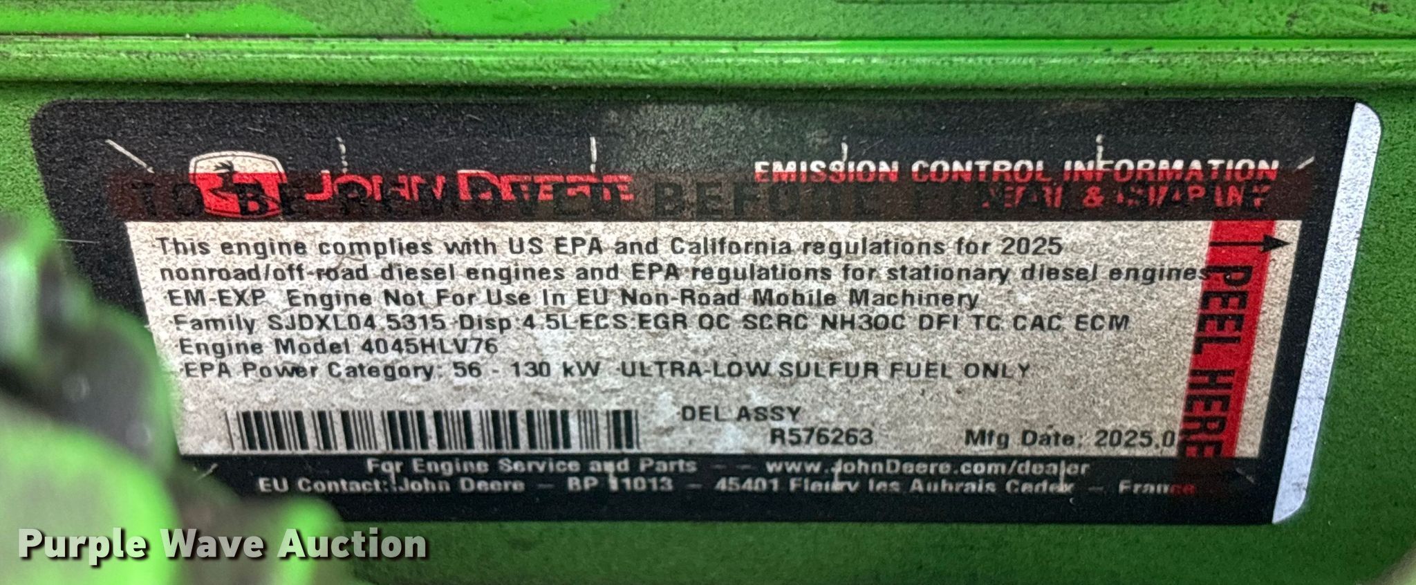 2025 John Deere 5090E MFWD tractor. Hours: 568 on meter, Serial: 1P05090EAS5081836, Unit #: 72230305. Engine John Deere 4045HLV76, Displacement: 4.5L, Cylinders: 4, Fuel type: Diesel. Transmission Synchro, 12F - 12R, Left-hand reverser, Differential lock. Operators station AC, Heat. Features PTO: 540, Three point, Seven pin outlet, Rear: 2, Loader ready, Loader Controls: Joystick. Tires Front: 12.4-24, Rear: 18.4-30. Notes Fuel lines disconnected, Cab damage, Non-operational unit. Buyer responsible for all aspects of loadout and removal. Insurance salvage, stored at a secured facility. Please review REQUIRED REMOVAL INSTRUCTIONS. Insurance Salvage. 2601 Center Road. Fort Pierce, FL 34946
