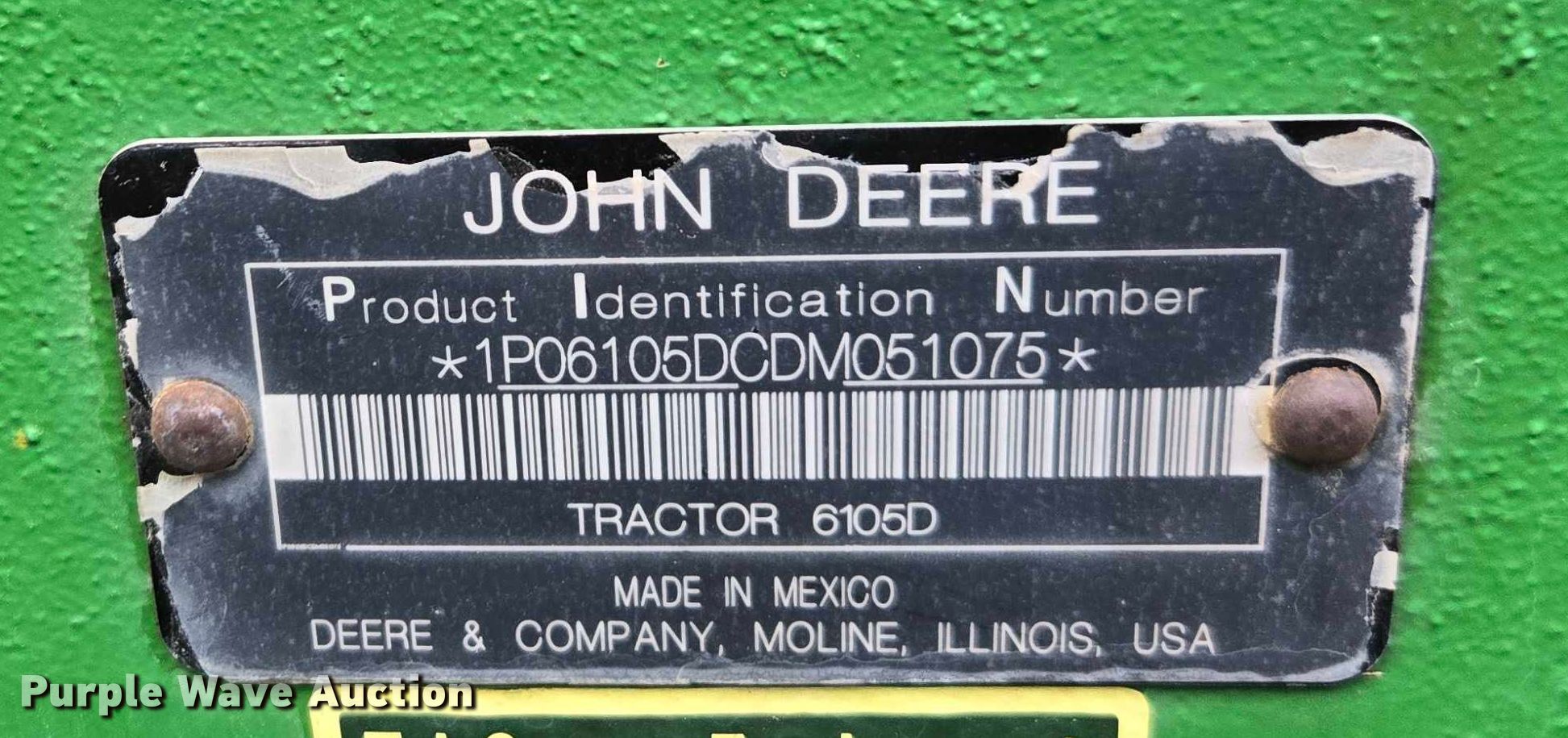 Purple Wave is selling a used Tractor in Alabama. This item is a 2013 John Deere 6105D MFWD tractor with the following: Hours: 2,136 on meter, Serial: 1P06105DCDM051075, Unit #: 99832905