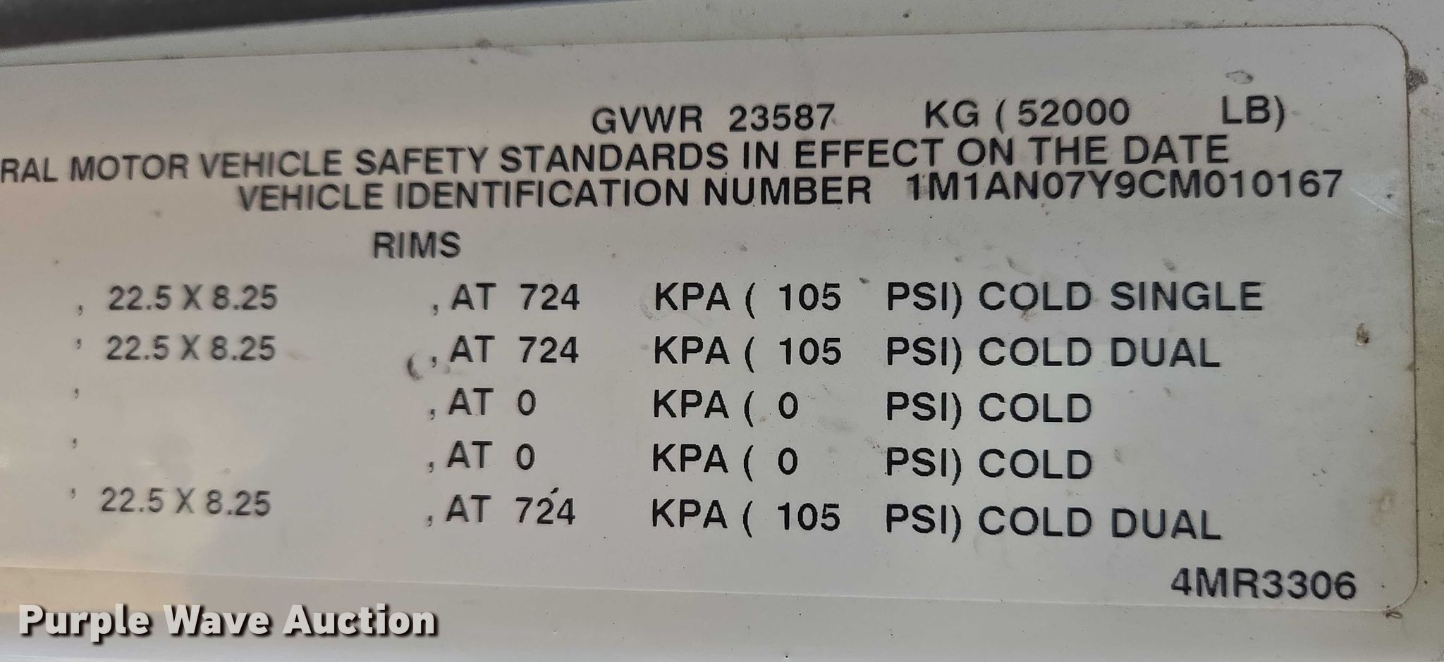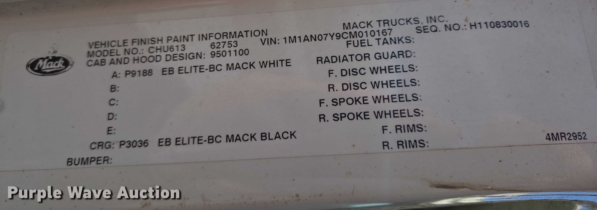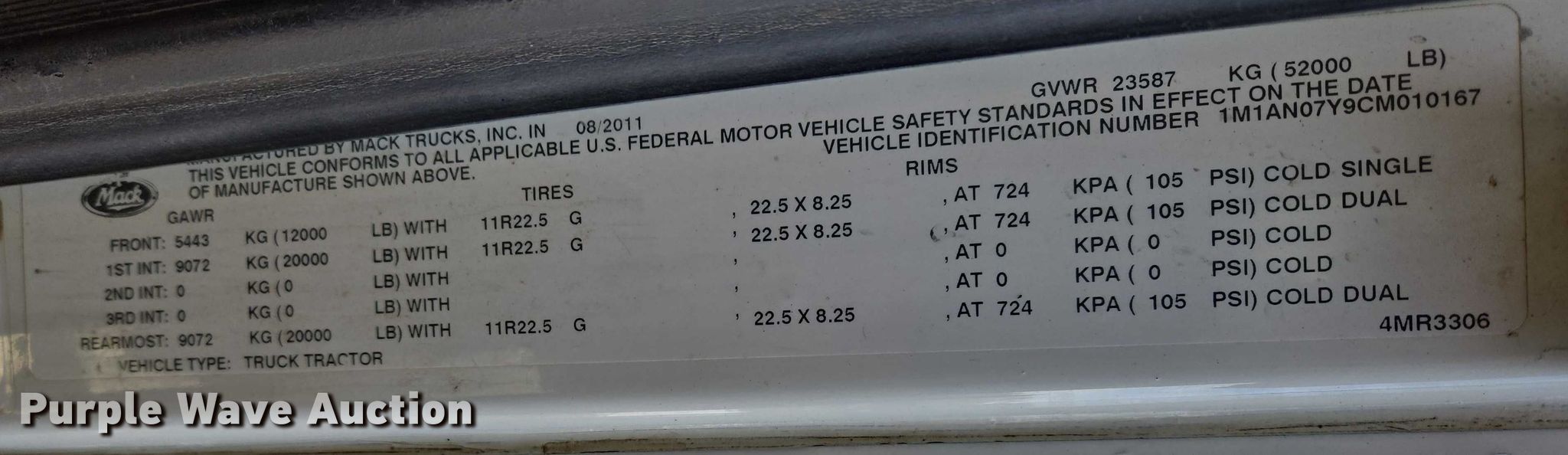 2012 Mack Pinnacle semi truck. Miles: 658,564 on odometer, Hours: 23,223 on meter, VIN: 1M1AN07Y9CM010167. Engine Model: MP8, Cylinders: 6, Fuel type: Diesel. Transmission Eaton, Manual, Speed: 10. Chassis Axles: Tandem, Differential lock: Inter-axle, Suspension: Air Dump valves, Brakes: Air, PTO, Wet kit. Interior AC, Heat, Heated mirrors, Cruise control, Air ride cab. Features Deck plate: Aluminum, Fifth wheel type: Air operated, Sliding, Fuel tank: Single. Tires Size: 11R22.5. Notes Dash warning indicator: Traction control, Windshield chipped or cracked. Minnesota title. Jeffers , MN 56145