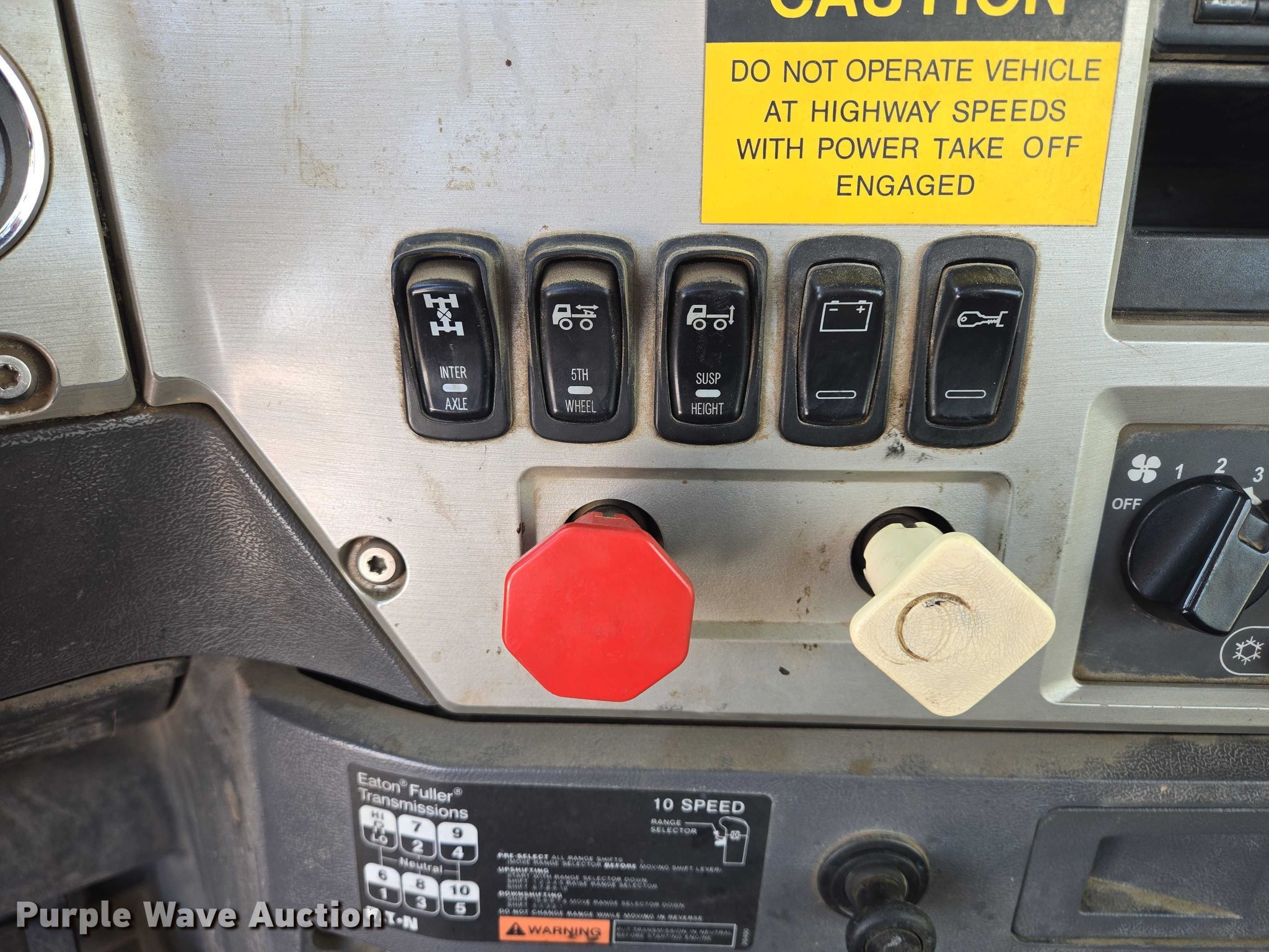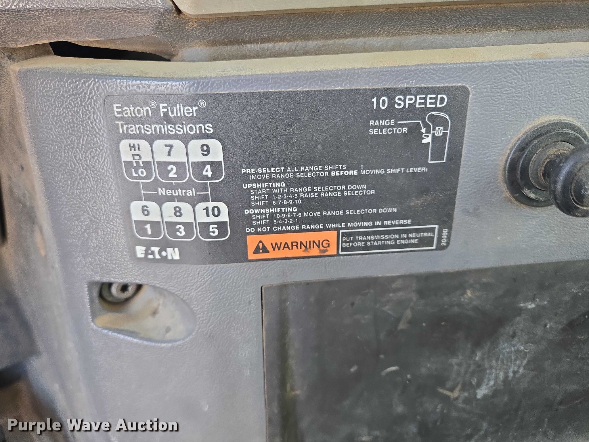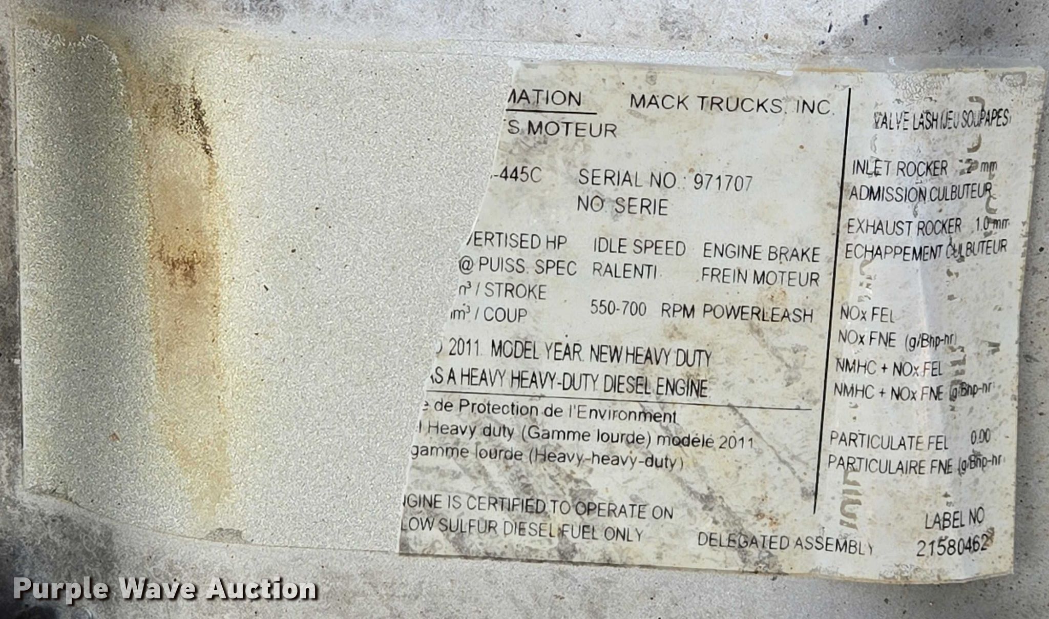 2012 Mack Pinnacle semi truck. Miles: 658,564 on odometer, Hours: 23,223 on meter, VIN: 1M1AN07Y9CM010167. Engine Model: MP8, Cylinders: 6, Fuel type: Diesel. Transmission Eaton, Manual, Speed: 10. Chassis Axles: Tandem, Differential lock: Inter-axle, Suspension: Air Dump valves, Brakes: Air, PTO, Wet kit. Interior AC, Heat, Heated mirrors, Cruise control, Air ride cab. Features Deck plate: Aluminum, Fifth wheel type: Air operated, Sliding, Fuel tank: Single. Tires Size: 11R22.5. Notes Dash warning indicator: Traction control, Windshield chipped or cracked. Minnesota title. Jeffers , MN 56145