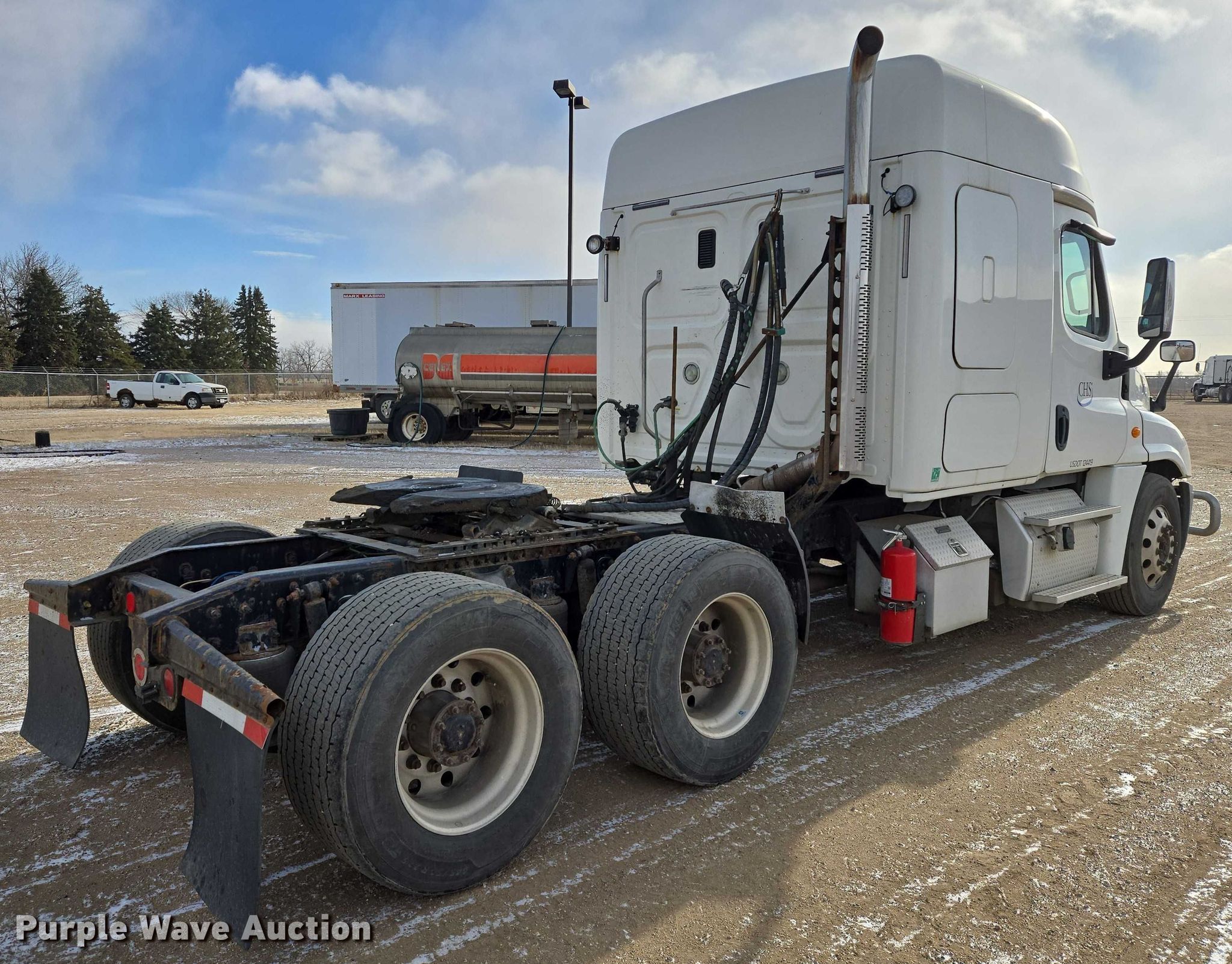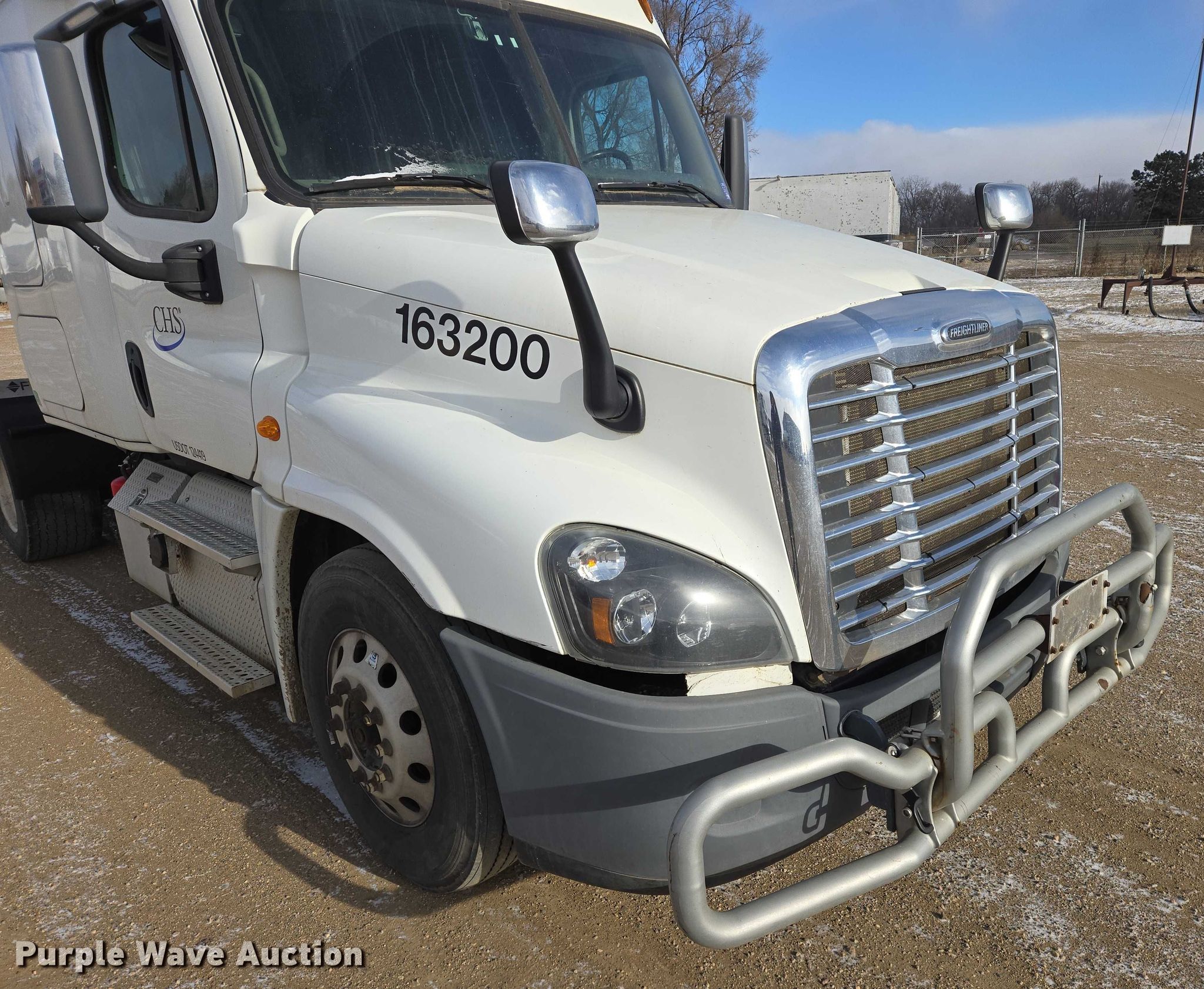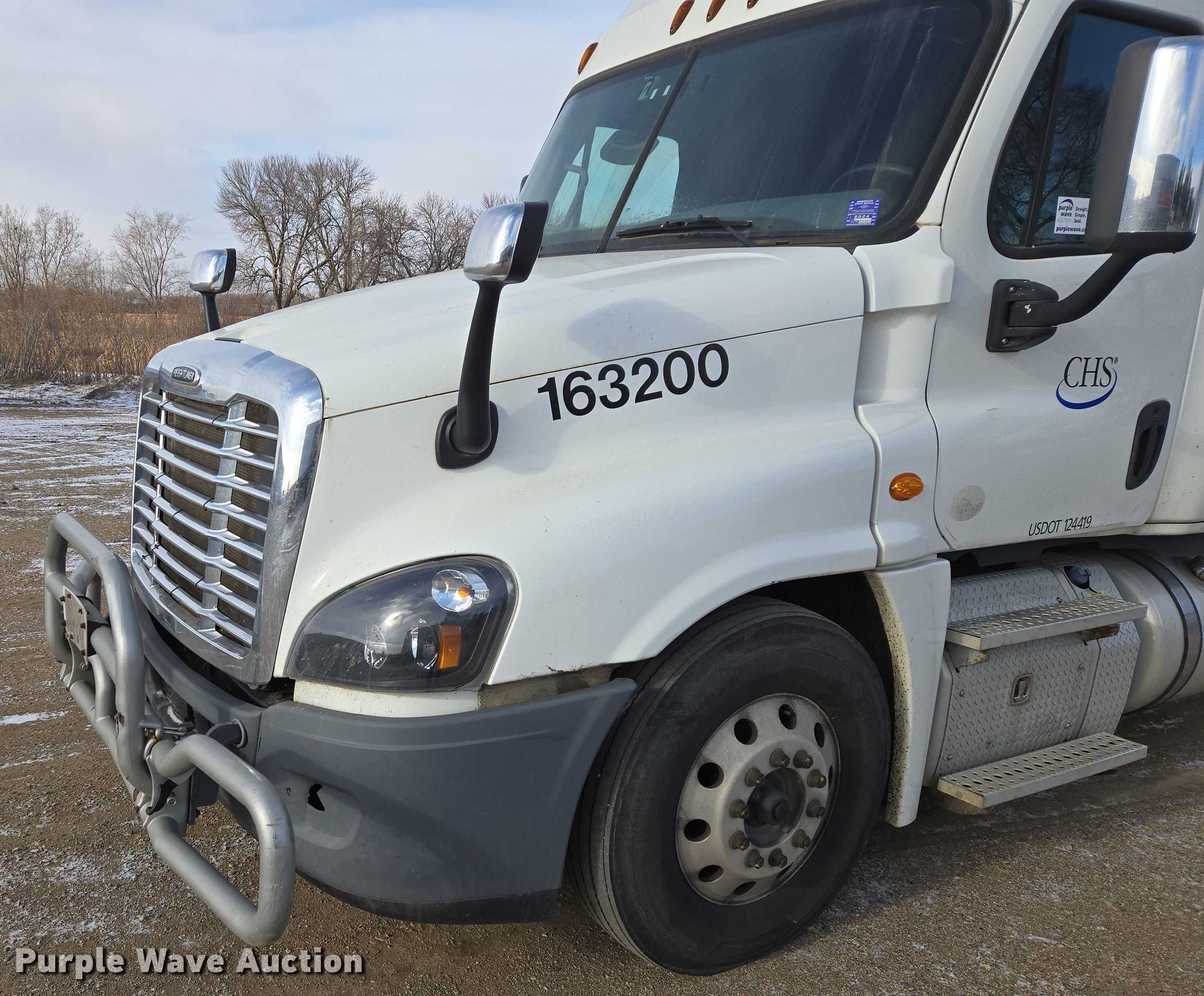 2017 Freightliner Cascadia semi truck. Miles: 604,224 on odometer, VIN: 1FUJGLDV2HLHT3020, Unit #: 163200. Engine Detroit Diesel, Displacement: 12.8L, Cylinders: 6, Fuel type: Diesel, Engine brake. Transmission Eaton Fuller FOM-15E310C-LAS Ultra shift, Automated manual. Chassis Axles: Tandem, Gear ratio: 3.36, Differential lock: Inter-axle, Suspension: Air Dump valves, Brakes: Air, PTO, Wet kit, GVWR: 46,350 lbs FAWR: 12,350 lbs, IAWR: 17,000 lbs, RAWR: 17,000 lbs, Wheelbase: 210". Interior AC, Heat, Heated mirrors, Power windows, Power locks, Cruise control, Air ride cab, Sleeper Sleeper length: 58", Beds: Single, Rear climate control. Features Deck plate: Aluminum, Fifth wheel type: Air operated, Sliding, Fuel tank: Single. Tires Front: 11R22.5, Rear: 445/50R22.5. Notes Dash warning indicator: Check engine, Windshield chipped or cracked, Wet kit hydraulic reservoir missing. Minnesota title. Title distribution may be delayed up to 30 days from verification of funds. CHS, Inc.. Sioux Falls, SD 57107
