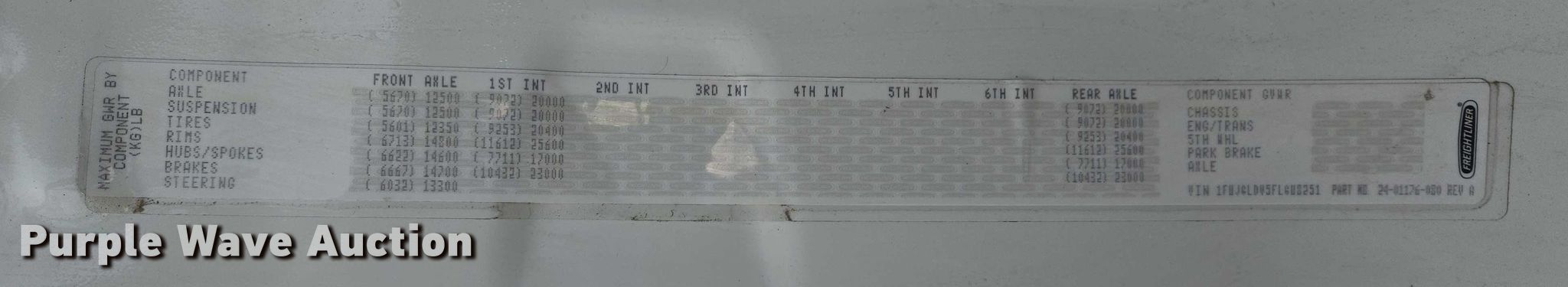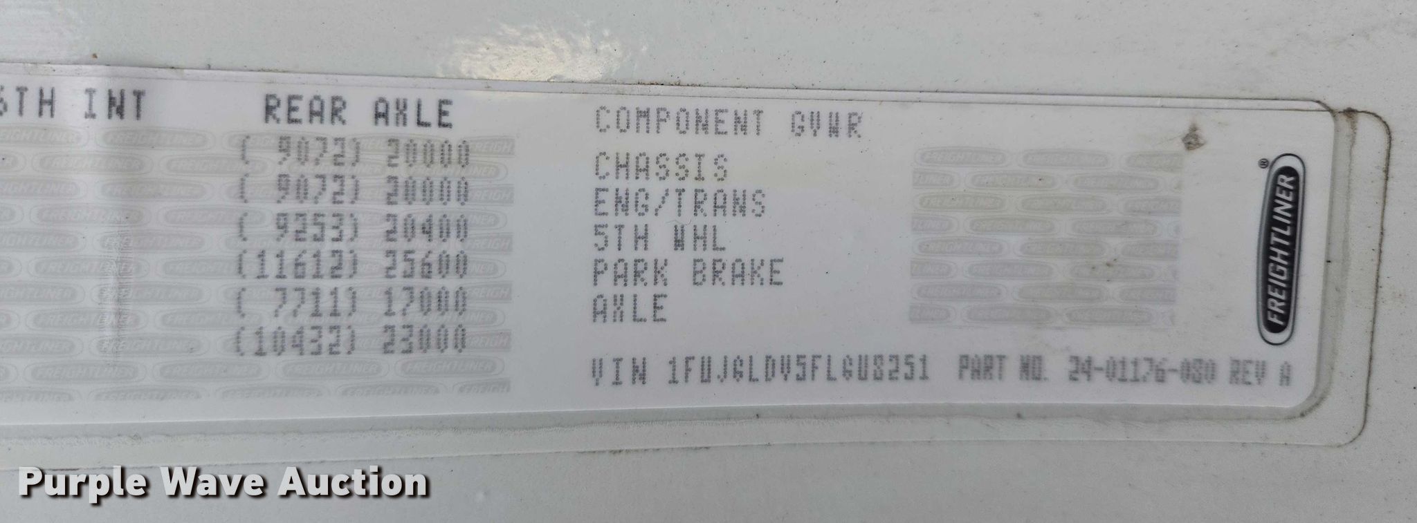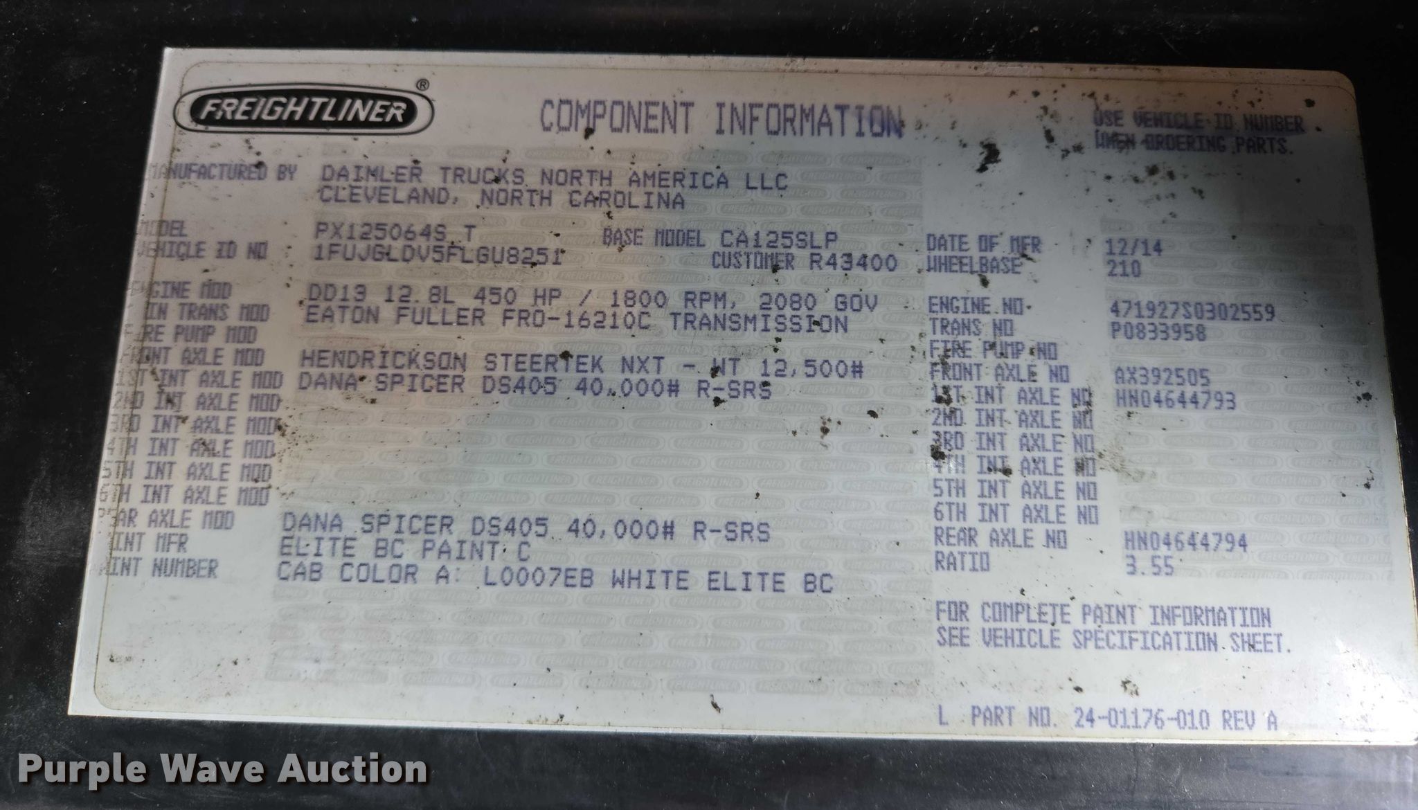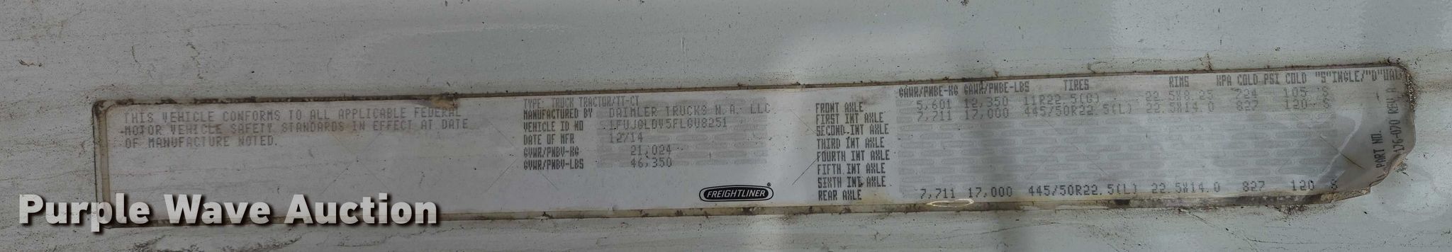 2015 Freightliner Cascadia semi truck. Miles: 851,540 on odometer, VIN: 1FUJGLDV5FLGU8251, Unit #: 153264. Engine Detroit Diesel DD13, Displacement: 12.8L, Cylinders: 6, Fuel type: Diesel, Engine brake. Transmission Eaton Fuller, Manual, Speed: 10. Chassis Axles: Tandem, Differential lock: Inter-axle, Suspension: Air Dump valves, Brakes: Air, PTO, Wet kit, GVWR: 46,350 lbs FAWR: 12,350 lbs, IAWR: 17,000 lbs, RAWR: 17,000 lbs, Wheelbase: 210". Interior AC, Heat, Heated mirrors, Power windows, Power locks, Cruise control, Air ride cab, Sleeper Sleeper length: 58", Beds: Single, Rear climate control. Features Deck plate: Aluminum, Fifth wheel type: Air operated, Sliding, Fuel tank: Single. Tires Front: 11R22.5, Rear: 445/50R22.5. Notes Windshield chipped or cracked, Jump start required during on-site data collection. Minnesota title. Title distribution may be delayed up to 30 days from verification of funds. CHS, Inc.. Sioux Falls, SD 57107