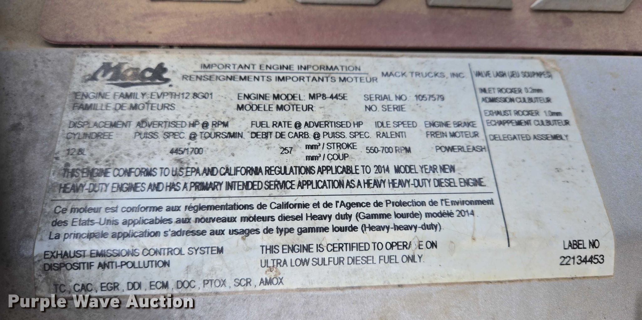 2015 Mack CXU613 semi truck. Miles: 741,874 on odometer, VIN: 1M1AW07Y4FM045278, Unit #: 153293. Engine Mack MP8-445E, Serial: 1057579, Displacement: 12.7L, Cylinders: 6, Fuel type: Diesel, HP: 445, Engine brake. Transmission Eaton Fuller, Manual, Speed: 13. Chassis Axles: Tandem, Differential lock: Inter-axle, Suspension: Air Dump valves, Brakes: Air, PTO, Wet kit, GVWR: 52,000 lbs FAWR: 12,000 lbs, IAWR: 20,000 lbs, RAWR: 20,000 lbs. Interior AC, Heat, Heated mirrors, Power windows, Power locks, Cruise control, Air ride cab, Sleeper Sleeper length: 48", Beds: Single, Rear climate control. Features Deck plate: Aluminum, Fifth wheel type: Air operated, Sliding, Fuel tank: Dual. Tires Front: 11R22.5, Rear: 275/80R22.5. Notes Dash warning indicator: Check engine, EATS System Fault, EATS System Service Required, ECS warning, Windshield chipped or cracked, Electronic logging monitor not included, Injector issues, inject number 7 stuck , Oil leak. Minnesota title. Title distribution may be delayed up to 30 days from verification of funds. CHS, Inc.. Sioux Falls, SD 57107