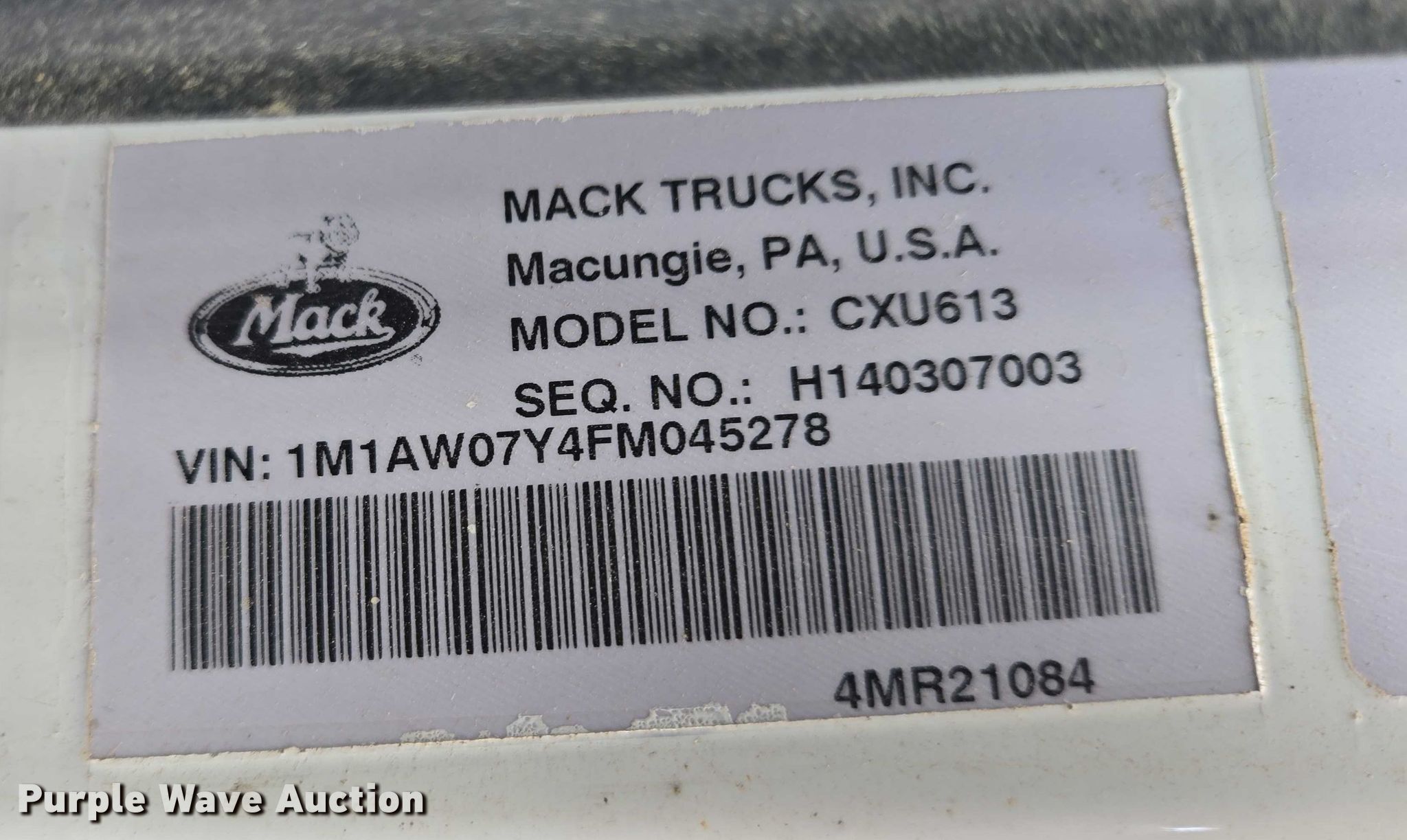 Take a look at this used 2015 Mack CXU613 semi truck being sold on February 19th, 2026 in the Thursday February 19 Truck and Trailer Auction made by Mack. Take a look at all of the item information below or take a look at similar auctions for Trucks.