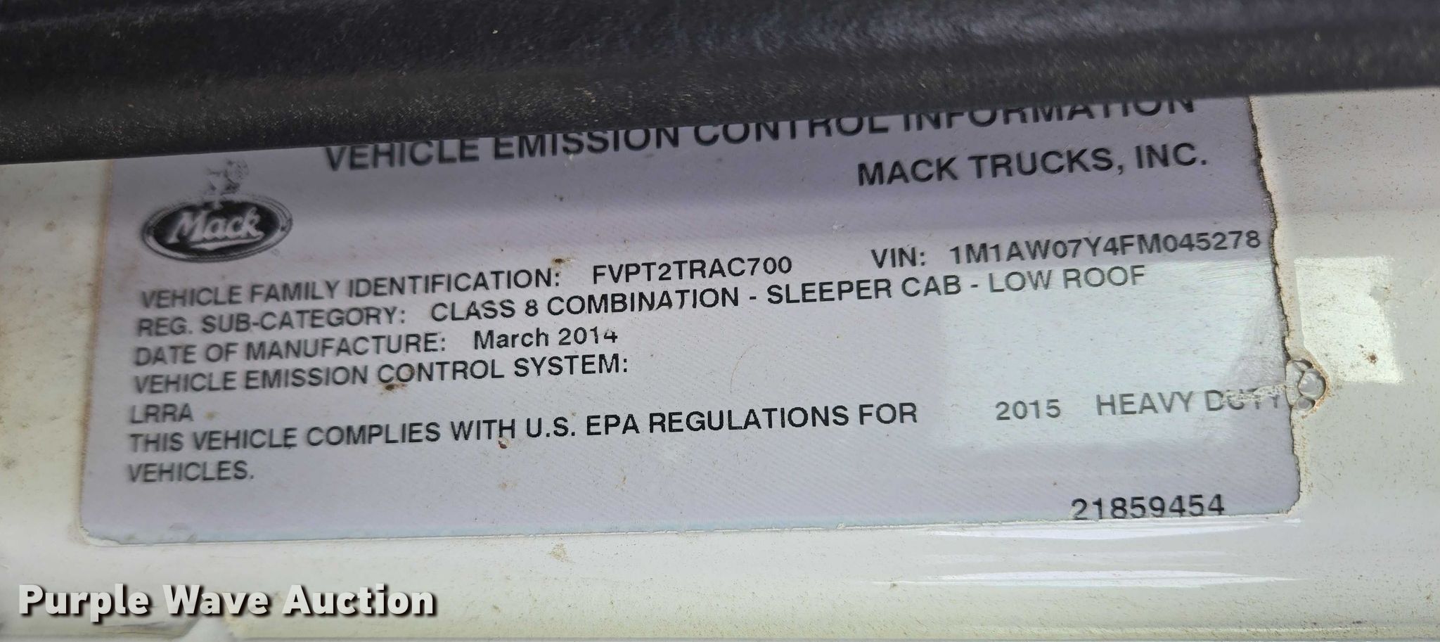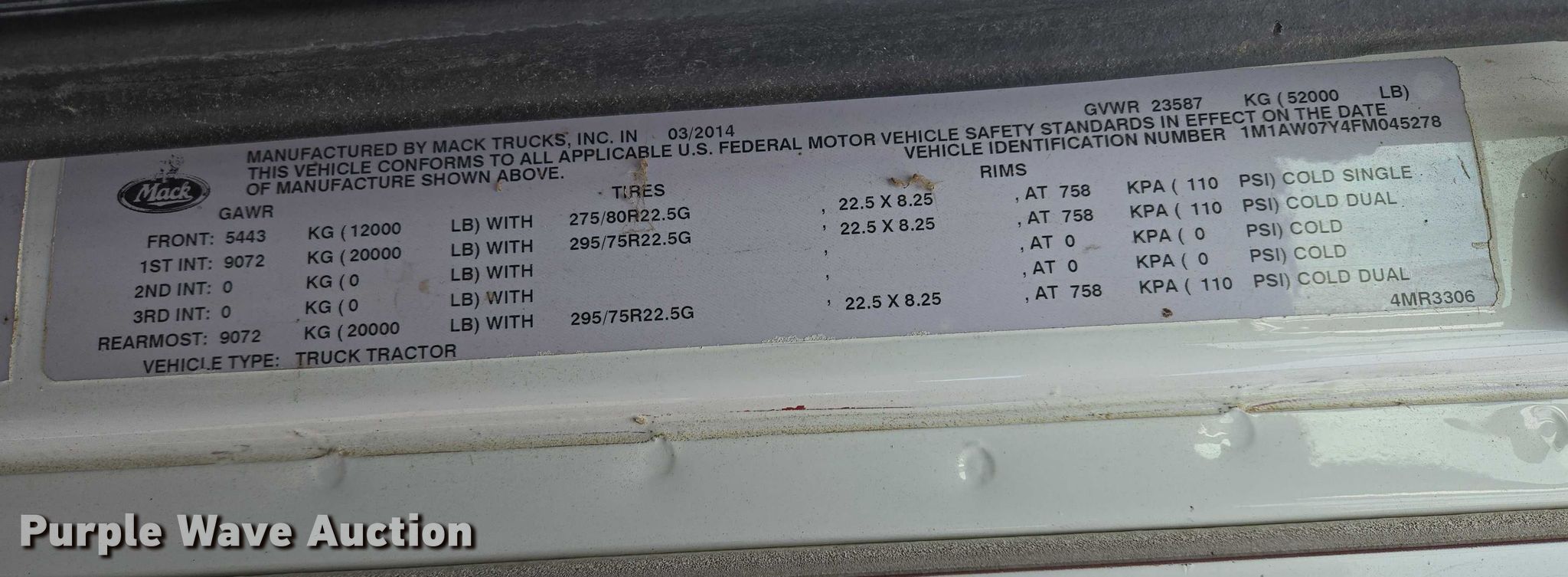 Purple Wave is selling a used Truck Tractor in South Dakota. This item is a 2015 Mack CXU613 semi truck with the following: Miles: 741,874 on odometer, VIN: 1M1AW07Y4FM045278, Unit #: 153293