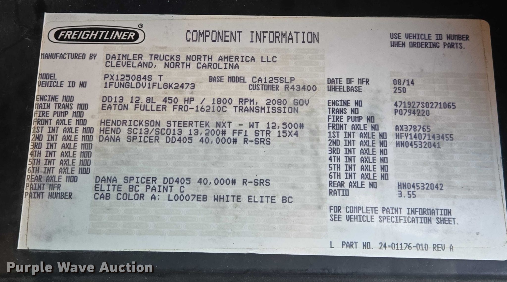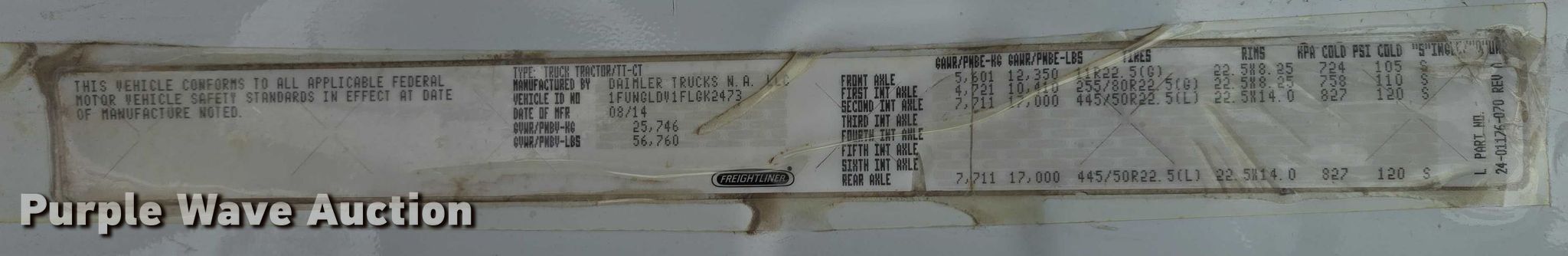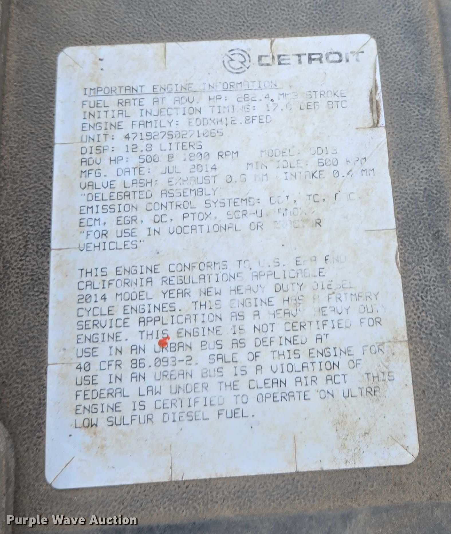 2015 Freightliner Cascadia semi truck. Miles: 819,411 on odometer, VIN: 1FUNGLDV1FLGK2473, Unit #: 153039. Engine Detroit Diesel DD13, Displacement: 12.8L, Cylinders: 6, Fuel type: Diesel, Engine brake. Transmission Eaton Fuller, Manual, Speed: 10. Chassis Axles: Triple, Pusher axle Steerable, Differential lock: Inter-axle, Suspension: Air Dump valves, Brakes: Air, PTO, Wet kit, GVWR: 56,760 lbs FAWR: 12,350 lbs, RAWR: 34,000 lbs, Lift axle GAWR: 10,410 lbs. Interior AC, Heat, Heated mirrors, Power windows, Cruise control, Air ride cab, Sleeper Sleeper length: 58", Beds: Single, Rear climate control. Features Deck plate: Aluminum, Fifth wheel type: Air operated, Sliding, Fuel tank: Single. Tires Front: 11R22.5, Rear: 445/50R22.5, Lift axle: 255/70R22.5. Notes Electronic logging device not included, Trailer not included, Dash warning indicator: Check engine, Windshield chipped or cracked. Minnesota title. Title distribution may be delayed up to 30 days from verification of funds. CHS, Inc.. Minot, ND 58701