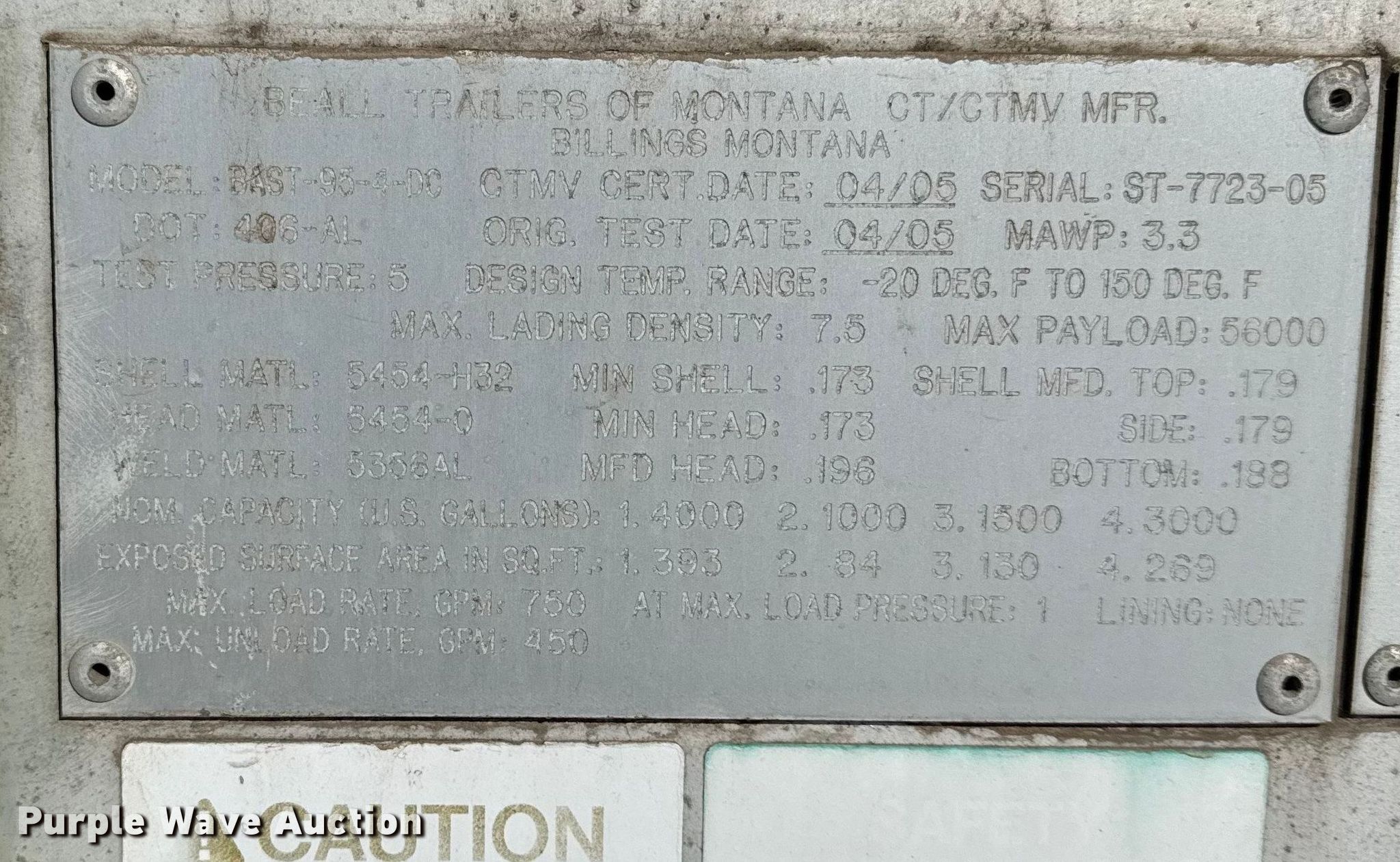 Purple Wave is selling a used Tank Trailer in Kansas. This item is a 2005 Beall BAST-95-4-DC tank trailer with the following: VIN: 1BN2T43265B007723