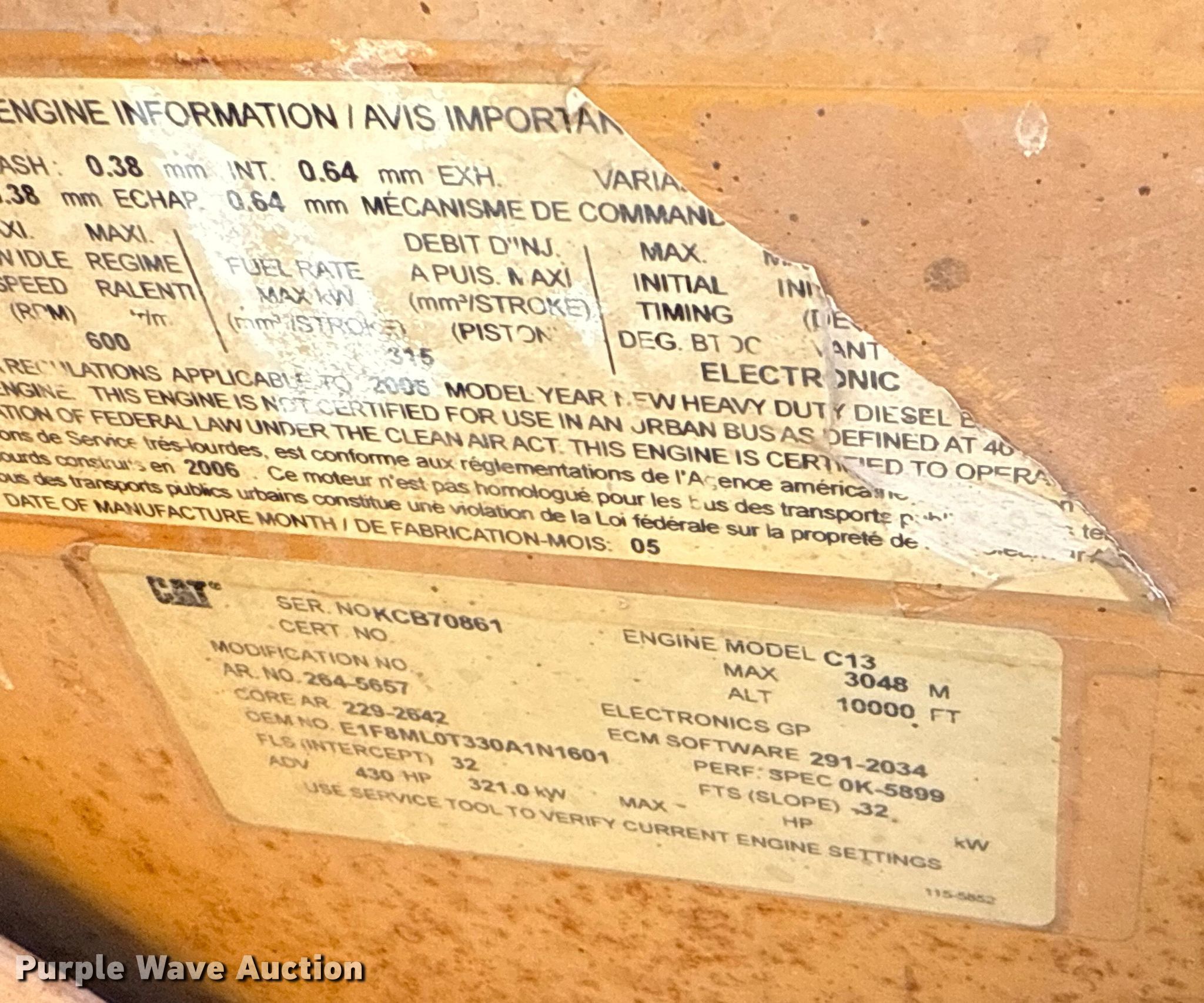 2007 Peterbilt 357 flatbed truck. Miles: 256,807 on odometer, Hours: 13,344 on meter, VIN: 1NPALU0XX7N663601. Engine Caterpillar C13, Serial: KCB70861, Displacement: 12.5L, Cylinders: 6, Fuel type: Diesel. Transmission Automatic. Chassis Axles: Tandem, Suspension: Spring over walking beam, Brakes: Air, PTO, GVWR: 62,740 lbs. Interior AC, Heat, Heated mirrors, Power windows, Power locks, Cruise control. Features Bed Flatbed, Length: 23' 3", Width: 97", Hose reels, Collapsible sides, Height: 18". Tires Front: 385/65R22.5, Rear: 11R22.5. Oklahoma title. Seller is an Oklahoma licensed motor vehicle dealer. Buyers may be required to provide identification to the licensed dealer to comply with state laws. Title will be assigned and distributed by the dealer. Please contact the seller for distribution questions. Title distribution may be delayed up to 30 days from verification of funds. Collinsville, OK 74021