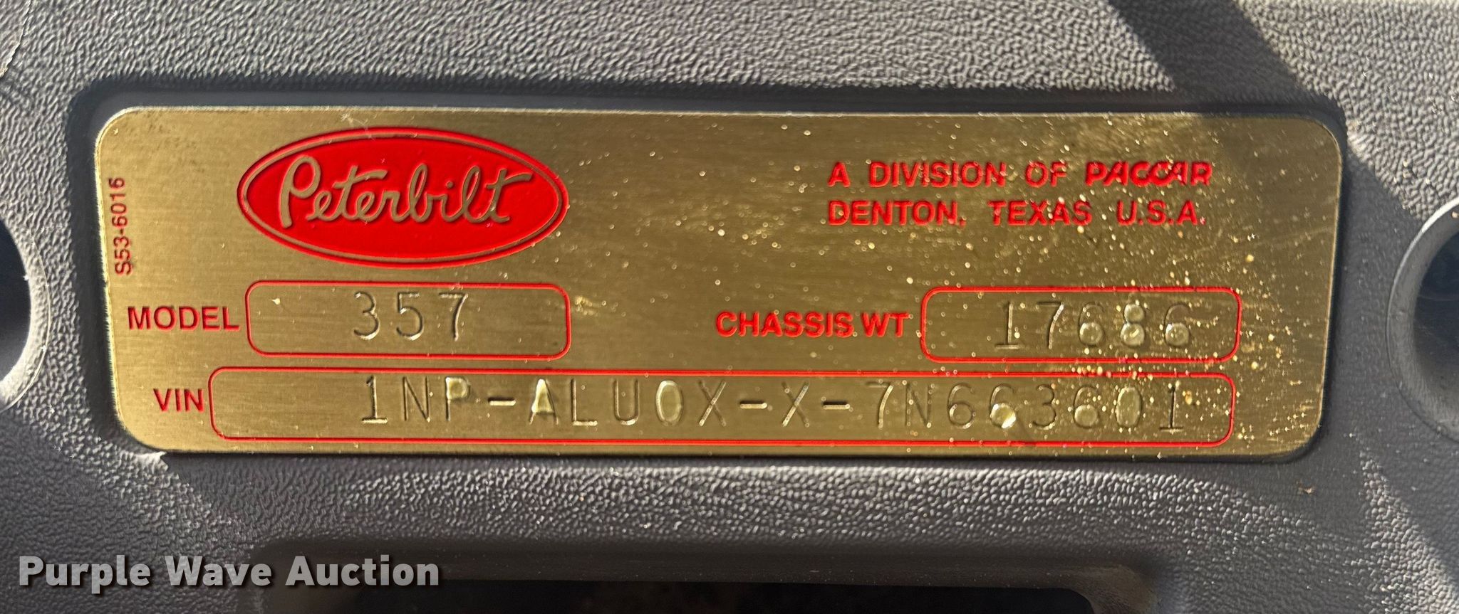 Purple Wave is selling a used Flat Bed Truck in Oklahoma. This item is a 2007 Peterbilt 357 flatbed truck with the following: Miles: 256,807 on odometer, Hours: 13,344 on meter, VIN: 1NPALU0XX7N663601