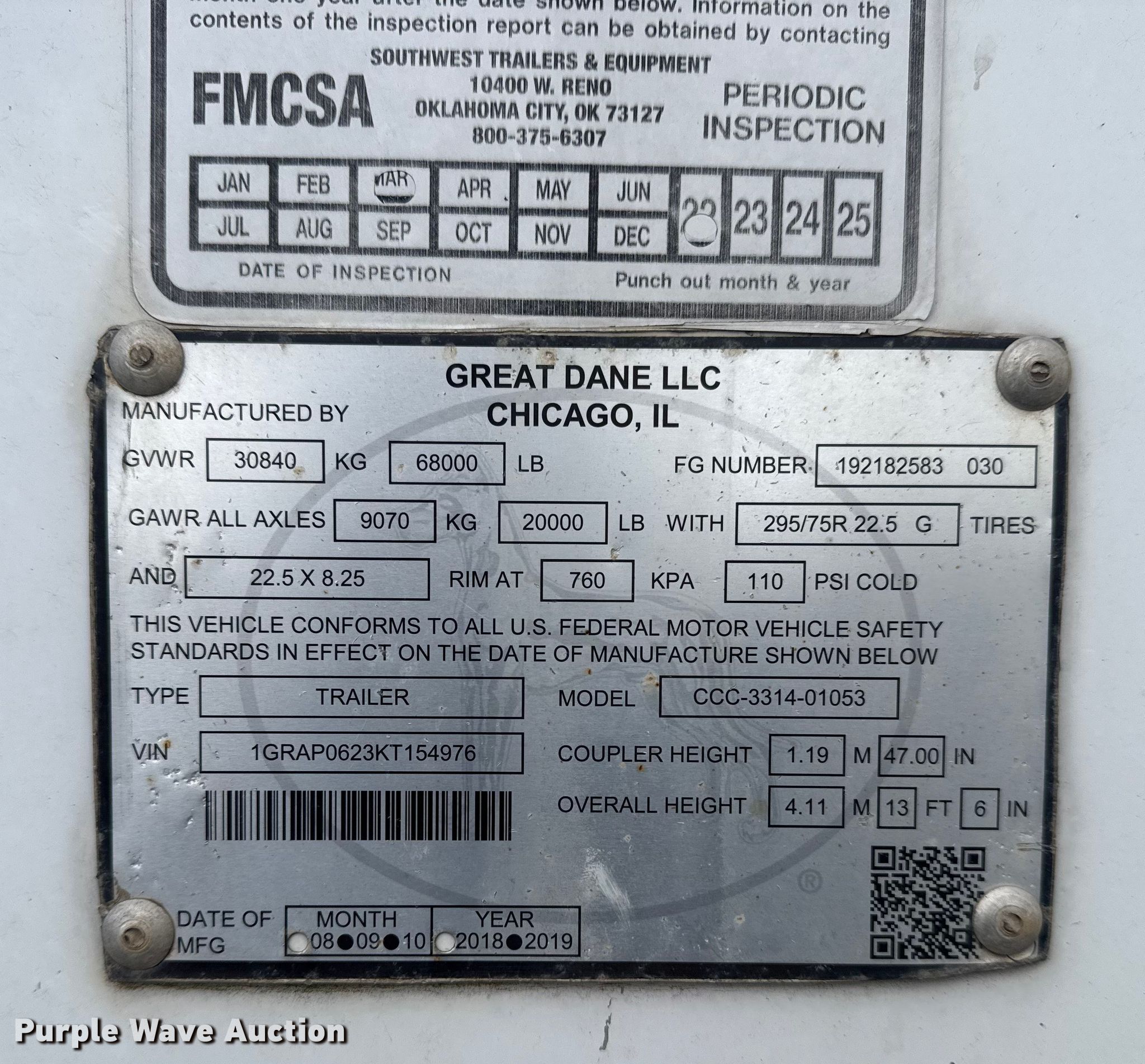 2019 Great Dane CCC-3314-01053 dry van trailer. VIN: 1GRAP0623KT154976. Dimensions Overall Length: 53', Width: 102". Features Deck type: Wood. Chassis Landing gear: Dual, Suspension: Air, Brakes: Air, Axles: Tandem. Tires Steel wheels, Size: 275/80R22.5. Oklahoma title. Seller is an Oklahoma licensed motor vehicle dealer. Buyers may be required to provide identification to the licensed dealer to comply with state laws. Title will be assigned and distributed by the dealer. Please contact the seller for distribution questions. Title distribution may be delayed up to 30 days from verification of funds. Collinsville, OK 74021