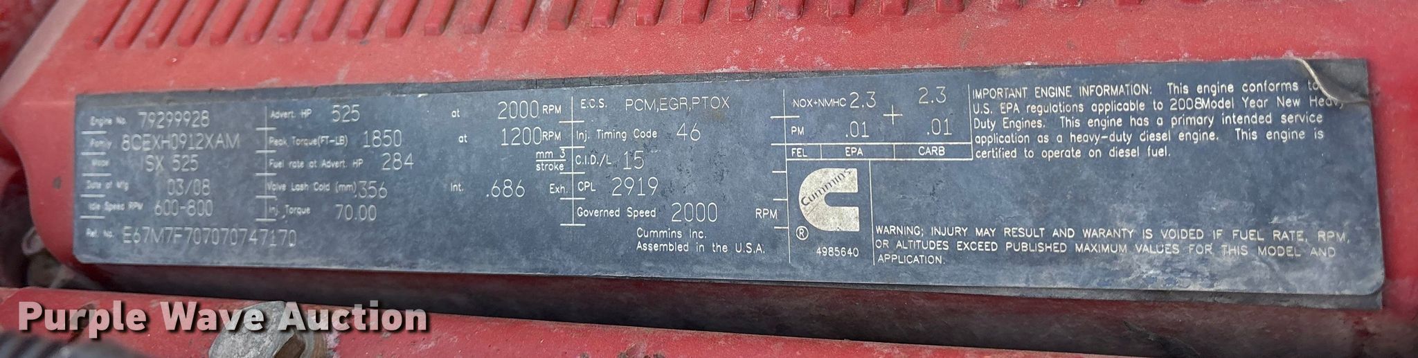 2009 Peterbilt 388 Truck tractor. Miles: 376,621 on odometer, Hours: 1,389 on meter, VIN: 1XPWD4EX19D778162. Engine Cummins ISX 525, Displacement: 15.0L SOHC, Cylinders: 6, Fuel type: Diesel, HP: 525, Engine brake. Transmission Eaton Fuller, Speed: 18. Chassis Axles: Tandem, Differential lock: Full, Suspension: Air Dump valves, Brakes: Air, GVWR: 52,000 lbs FAWR: 12,000 lbs, IAWR: 20,000 lbs, RAWR: 20,000 lbs. Interior AC, Heat, Heated mirrors, Power windows, Power locks, Cruise control, Air ride cab. Features Deck plate: Aluminum, Fifth wheel type: Air operated, Sliding, Fuel tank: Dual. Tires Size: 11R24.5. Notes Body Class: Truck-tractor, Dash warning indicator: ABS, Windshield chipped or cracked. Texas title. Title distribution may be delayed up to 14 days from verification of funds. Daingerfield Iron Inc. Naples, TX 75568