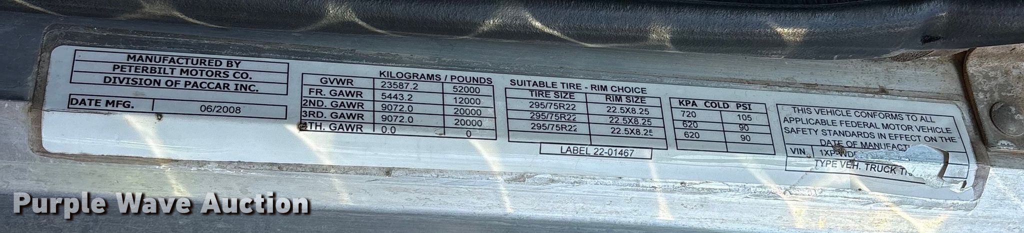 Purple Wave is selling a used Truck Tractor in Texas. This item is a 2009 Peterbilt 388 Truck tractor with the following: Miles: 376,621 on odometer, Hours: 1,389 on meter, VIN: 1XPWD4EX19D778162