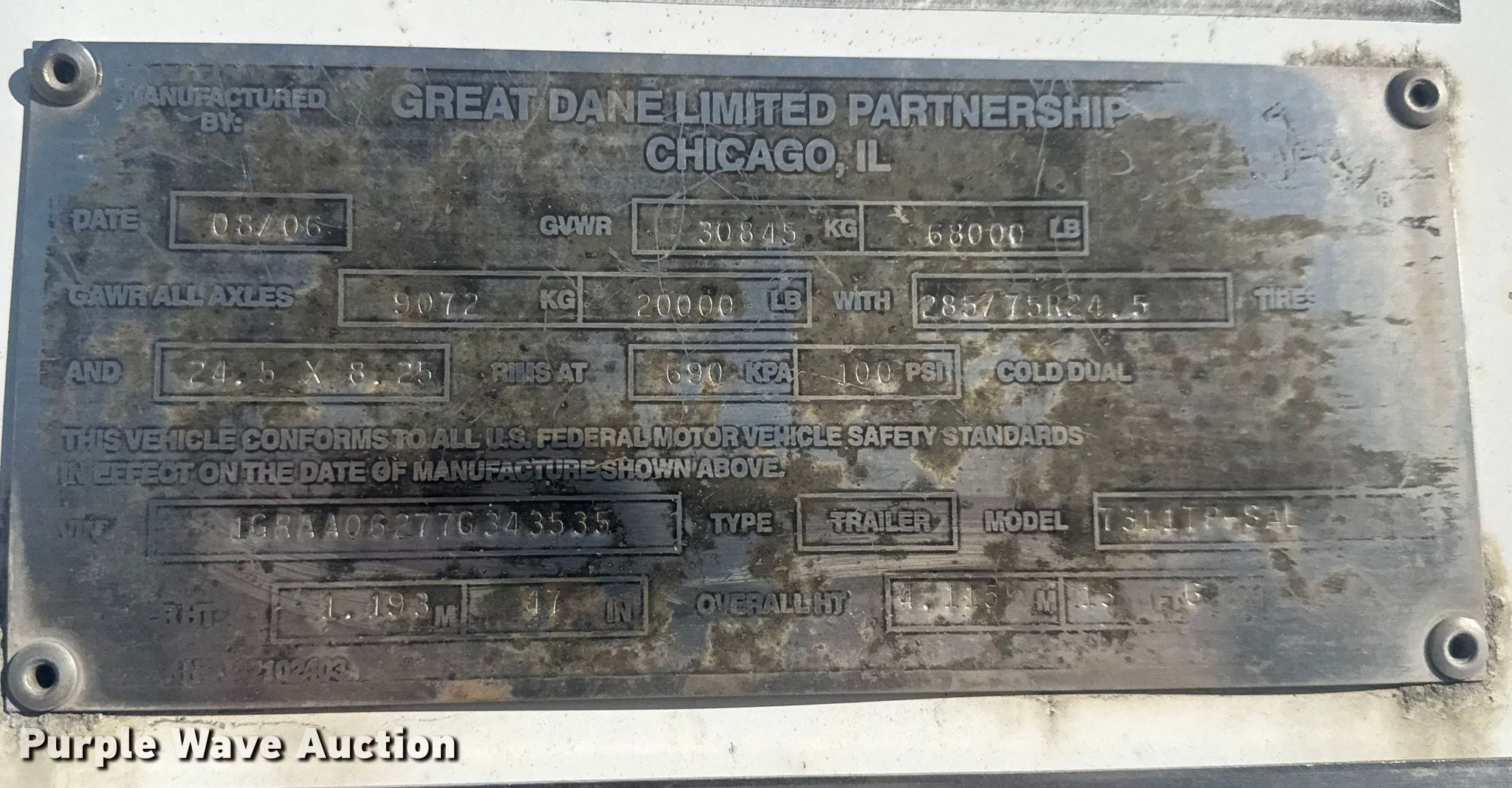 Purple Wave is selling a used Dry Van Trailer in Missouri. This item is a 2007 Great Dane 7311TP-SAL dry van trailer with the following: VIN: 1GRAA06277G343535, Unit #: R43535, 1154