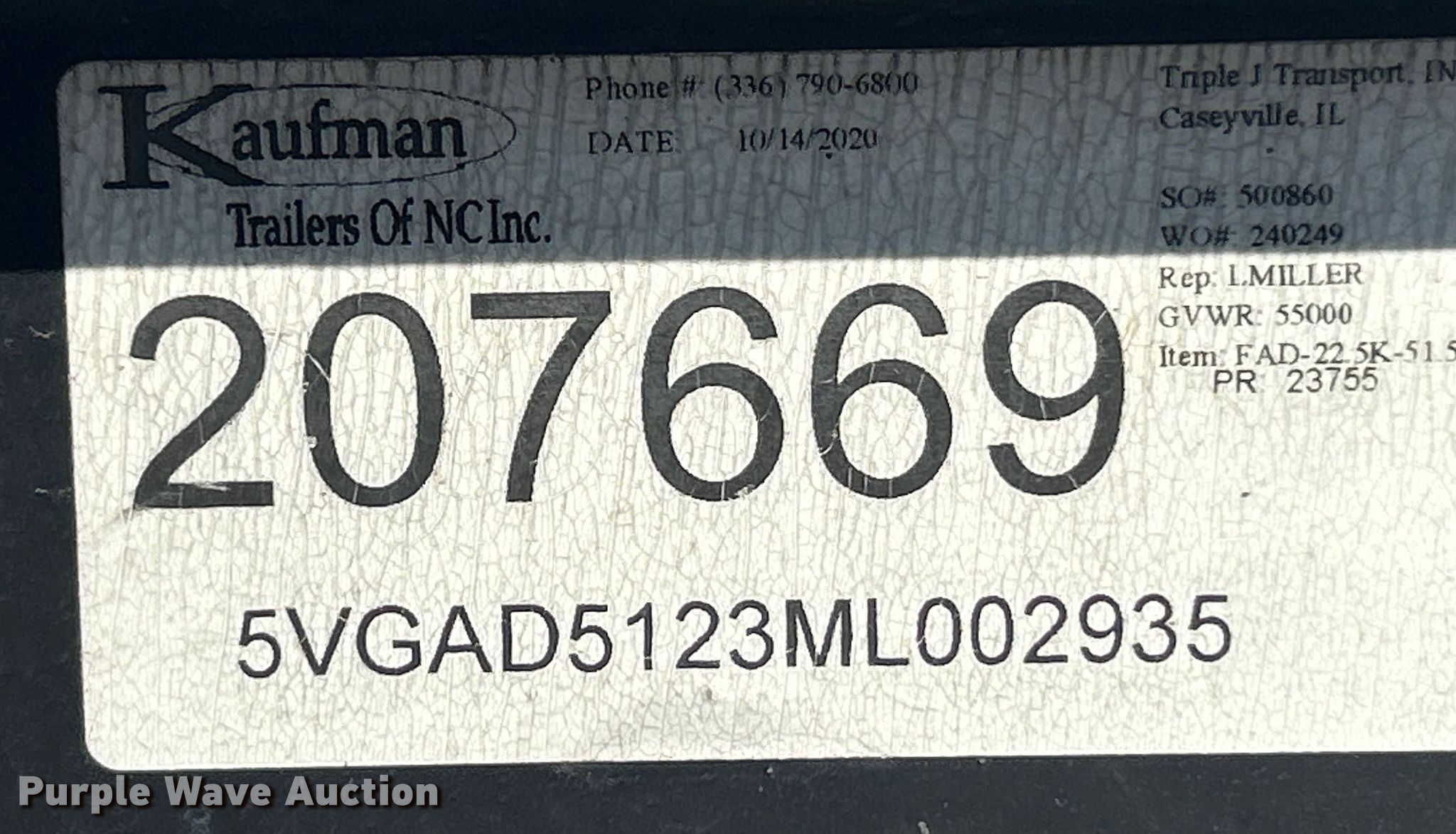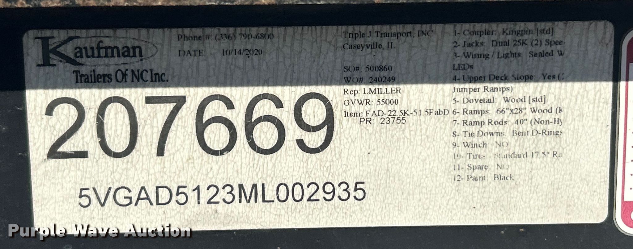 2021 Kaufman drop deck equipment trailer. VIN: 5VGAD5123ML002935. Dimensions Overall Length: 51' 6", Width: 101", Deck Length: 34', Width: 96", Top deck length: 12', Tail length: 5', Ramps: Manual Length: 6', Top deck ramps Length: 47". Features Deck type: Wood. Chassis Landing gear: Dual, Suspension: Spring, Brakes: Air, Axles: Tandem, GVWR: 55,000 lbs. Tires Steel wheels, Size: 235/75R17.5. Illinois title. Title distribution may be delayed up to 14 days from verification of funds. Triple J Transport. Caseyville, IL 62232