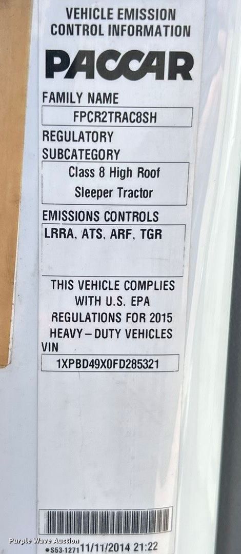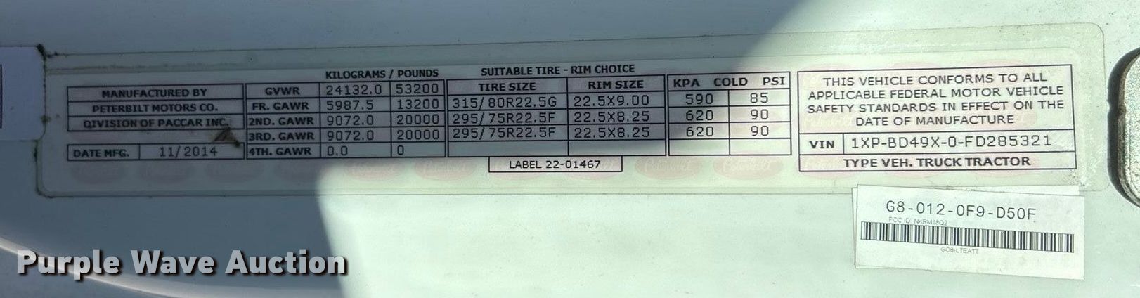 2015 Peterbilt 579 semi truck. Miles: 428,025 on odometer, Hours: 15,194 on meter, VIN: 1XPBD49X0FD285321. Engine Cummins ISX15 485, Displacement: 15.0L, Cylinders: 6, Fuel type: Diesel, Engine brake. Transmission Eaton Fuller, Manual, Speed: 10. Chassis Axles: Tandem, Differential lock: Inter-axle, Suspension: Air, Brakes: Air, GVWR: 53,200 lbs FAWR: 13,200 lbs, IAWR: 20,000 lbs, RAWR: 20,000 lbs. Interior AC, Heat, Heated mirrors, Power windows, Power locks, Cruise control, Air ride cab, Sleeper Sleeper length: 65", Beds: Double bunk, Rear climate control. Features Deck plate: Aluminum, Fifth wheel type: Air operated, Sliding, Fuel tank: Dual. Tires Size: 295/75R22.5. Notes Dash warning indicator: ABS, Traction control, Service engine, Windshield chipped or cracked, Emissions system modified, DPF deleted, DEF deleted, EGR deleted. Missouri title. Title distribution may be delayed up to 14 days from verification of funds. Bourbon, MO 65441
