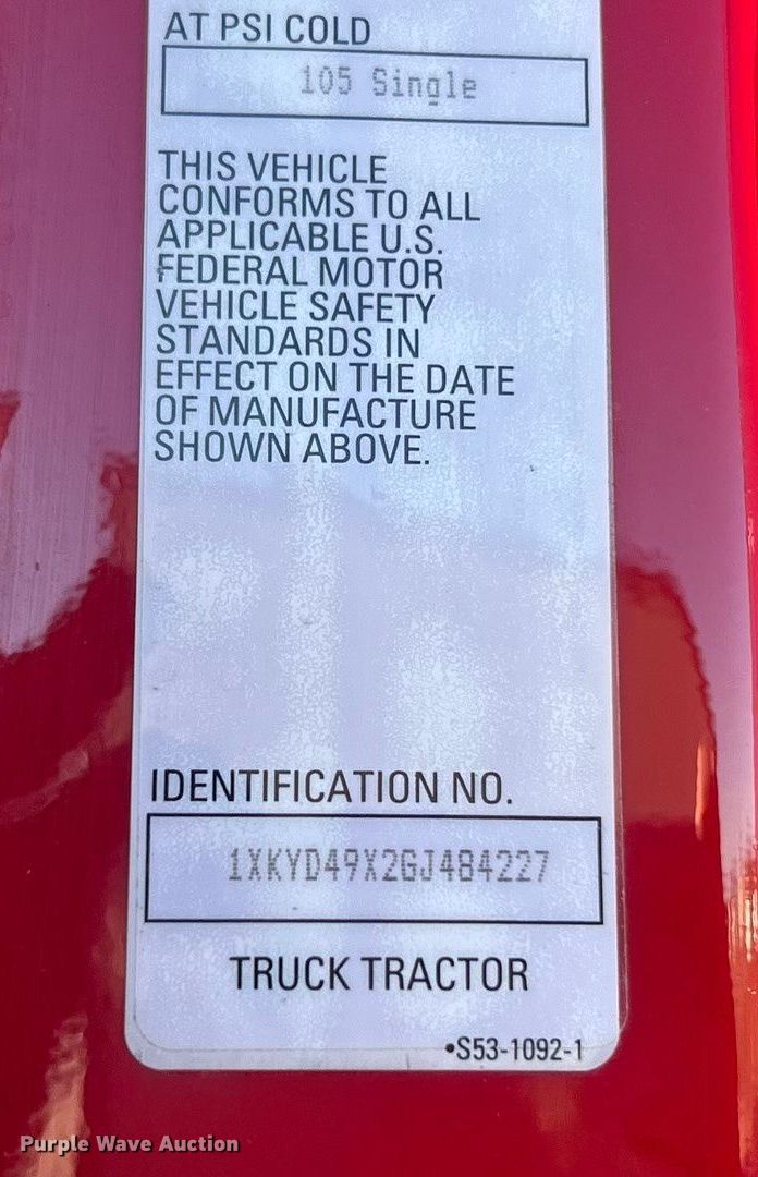 2016 Kenworth T680 semi truck. Miles: 707,444 on odometer, Hours: 1,233 on meter, VIN: 1XKYD49X2GJ484227. Engine Cummins ISX15 450ST, Displacement: 15.0L, Cylinders: 6, Fuel type: Diesel, Engine brake. Transmission Automated manual. Chassis Axles: Tandem, Differential lock: Inter-axle, Suspension: Air, Brakes: Air, GVWR: 50,320 lbs FAWR: 12,350 lbs, IAWR: 20,000 lbs, RAWR: 20,000 lbs. Interior AC, Heat, Heated mirrors, Power windows, Power locks, Cruise control, Air ride cab, Sleeper Sleeper length: 60", Beds: Single, Rear climate control. Features Deck plate: Aluminum, Fifth wheel type: Air operated, Sliding, Fuel tank: Single. Tires Size: 296/75R22.5. Notes Dash warning indicator: Traction control, Windshield chipped or cracked. Missouri title. Title distribution may be delayed up to 14 days from verification of funds. Bourbon, MO 65441