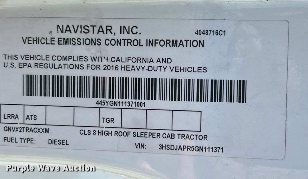 Purple Wave is selling a used Truck Tractor in Missouri. This item is a 2016 International ProStar+122 semi truck with the following: Miles: 399,520 on odometer, Hours: 13,444 on meter, VIN: 3HSDJAPR5GN111371