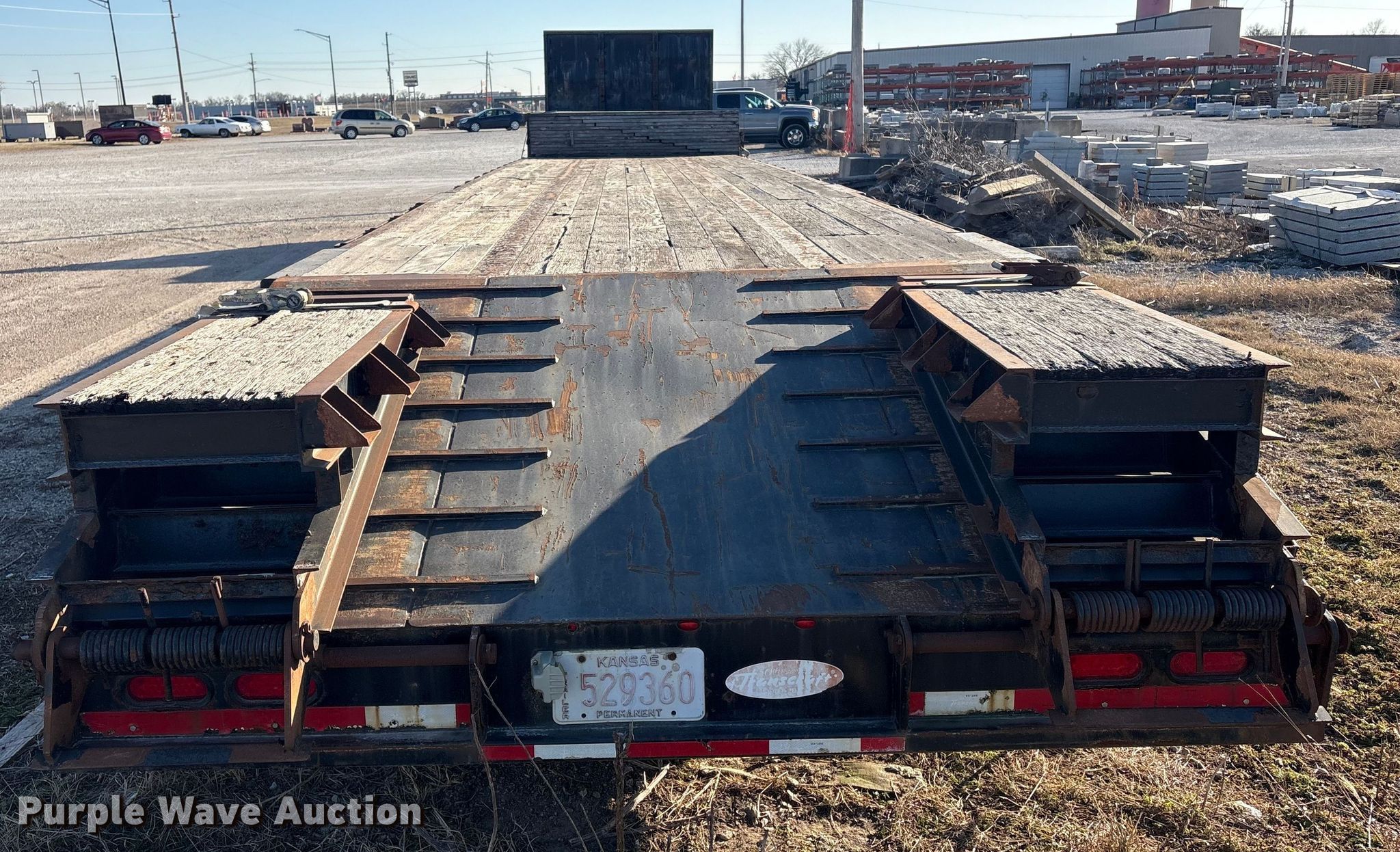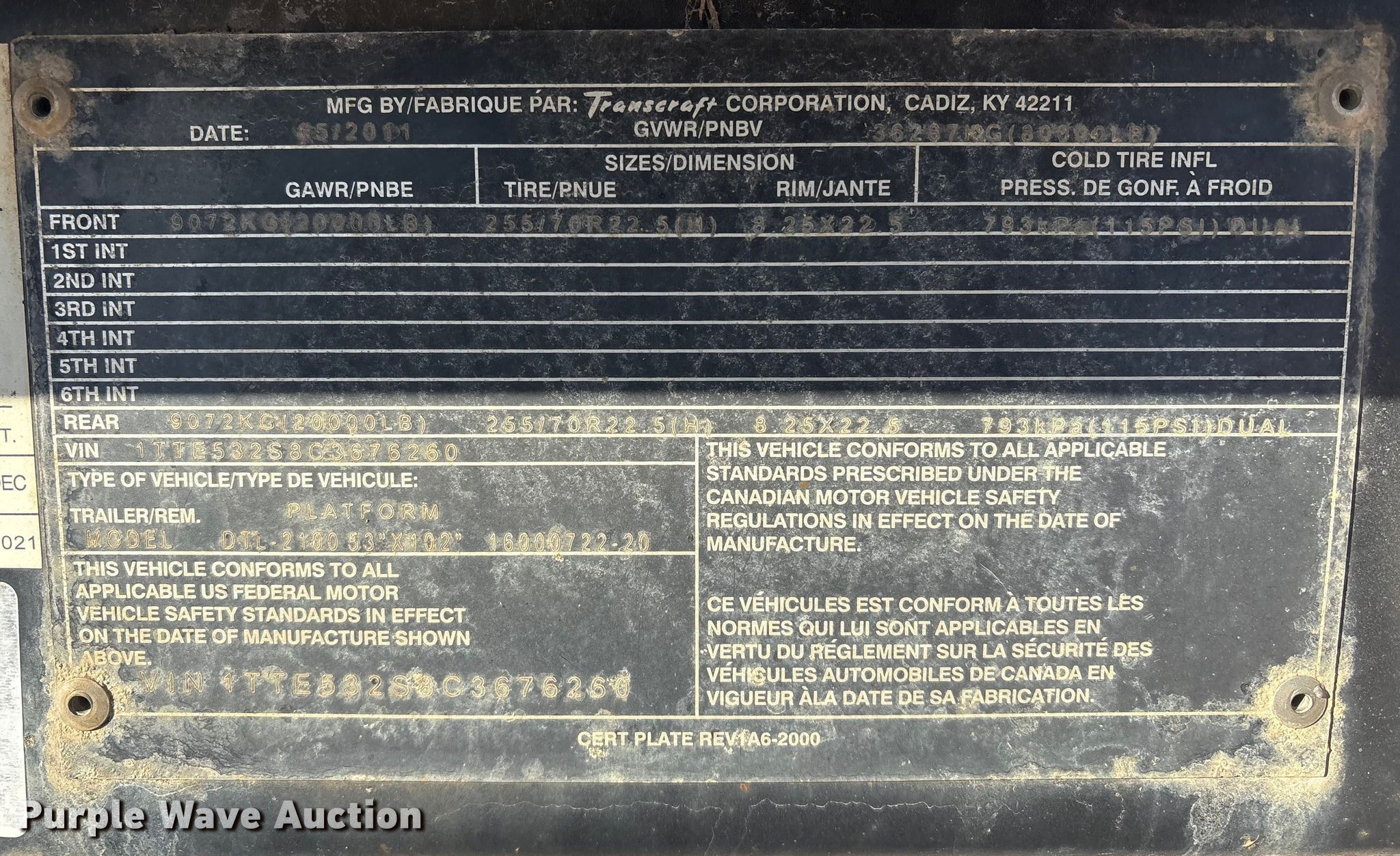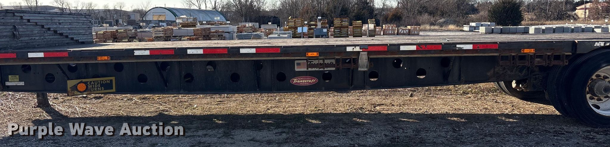 2012 Transcraft DTL-2100 drop deck equipment trailer. VIN: 1TTE532S8C3676260. Dimensions Overall Length: 53' 9", Width: 102", Deck Length: 36', Width: 102", Top deck length: 10' 10", Tail length: 6', Ramps: Manual Length: 5'. Features Deck type: Steel, Wood. Chassis Landing gear: Dual, Suspension: Air, Brakes: Air, Axles: Spread, GVWR: 80,000 lbs, GAWR: 20,000 lbs. Tires Steel wheels, Size: 255/70R22.5. Kansas title. Title distribution may be delayed up to 30 days from verification of funds. Wilbert Funeral Services. Parsons, KS 67357
