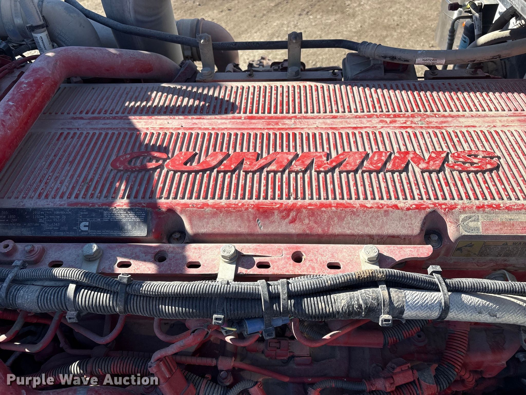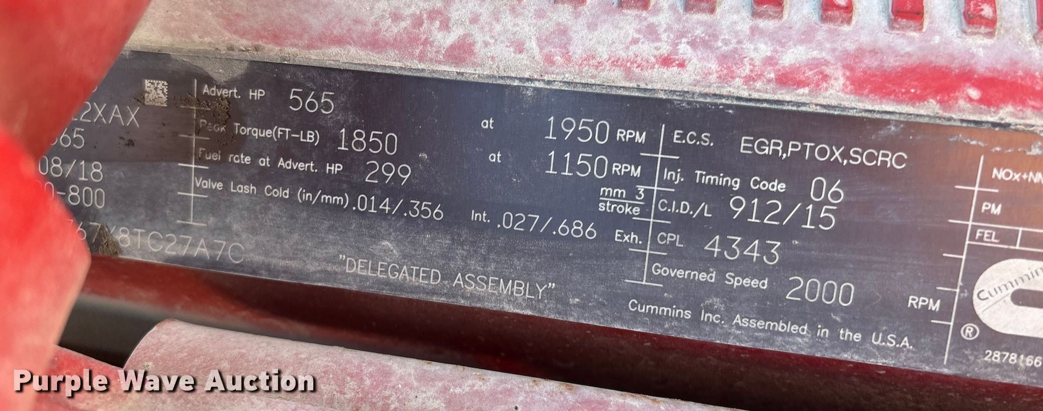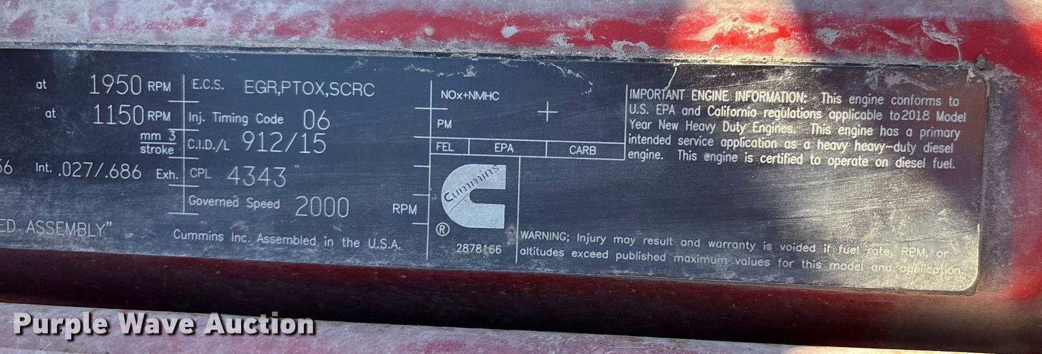2022 Peterbilt 389 semi truck. Miles: 492,472 on odometer, Hours: 9,195 on meter, VIN: 1XPXD49X5ND789643. Engine Cummins X15 565, Serial: 80092853, Displacement: 15.0L, Cylinders: 6, Fuel type: Diesel, Engine brake. Transmission Eaton Fuller, Manual, Speed: 18. Chassis Axles: Tandem, Differential lock: Inter-axle, Suspension: Air Dump valves, Brakes: Air, Truck chassis: 13' 6", GVWR: 52,350 lbs FAWR: 12,350 lbs, IAWR: 20,000 lbs, RAWR: 20,000 lbs. Interior AC, Heat, Heated mirrors, Power windows, Power locks, Cruise control, Air ride cab, Auxiliary controls, Sleeper Sleeper length: 80", Beds: Single, Refrigerator, Rear climate control. Features Deck plate: Aluminum, Fifth wheel type: Air operated, Sliding, Fuel tank: Dual. Tires Size: 285/75R24.5. Kansas title. Title distribution may be delayed up to 30 days from verification of funds. J-Six Enterprises. Hiawatha, KS 66434
