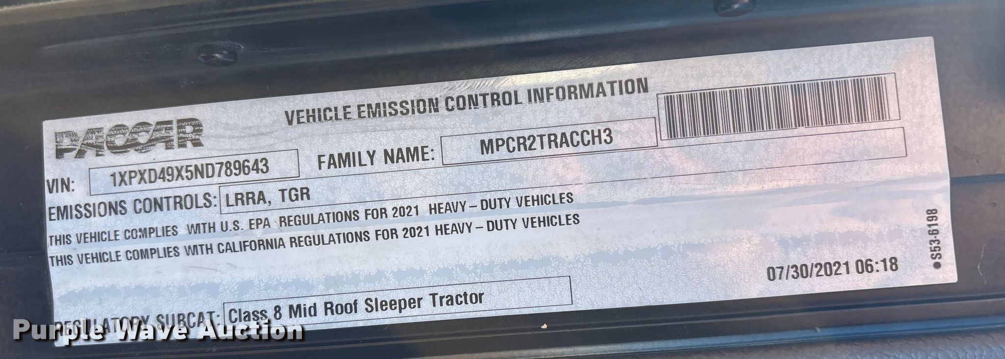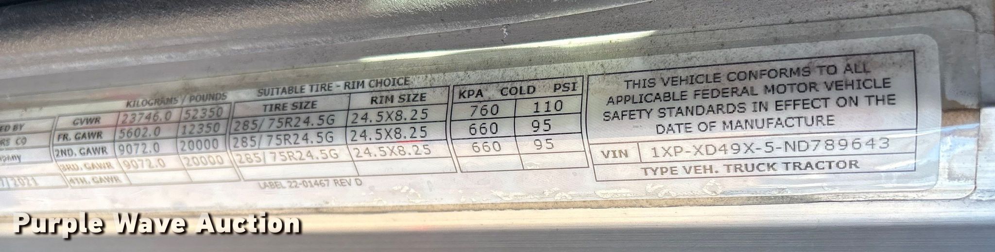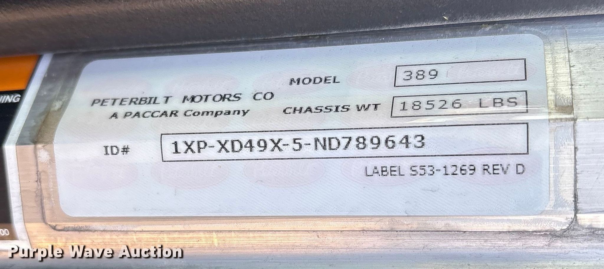 Purple Wave is selling a used Truck Tractor in Kansas. This item is a 2022 Peterbilt 389 semi truck with the following: Miles: 492,472 on odometer, Hours: 9,195 on meter, VIN: 1XPXD49X5ND789643