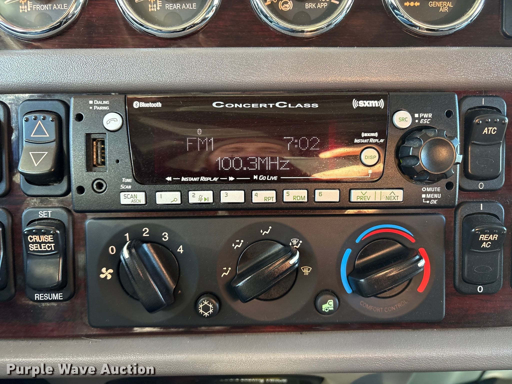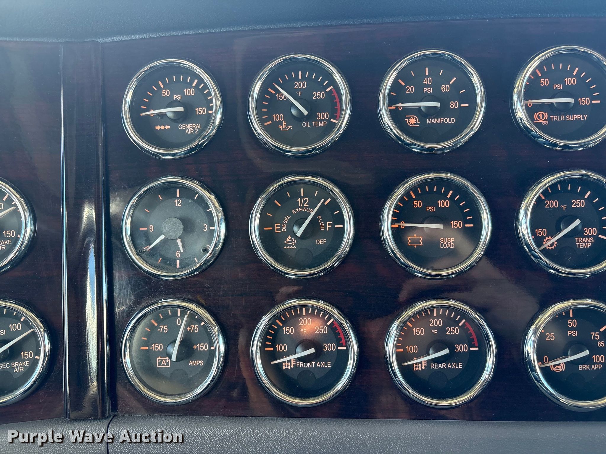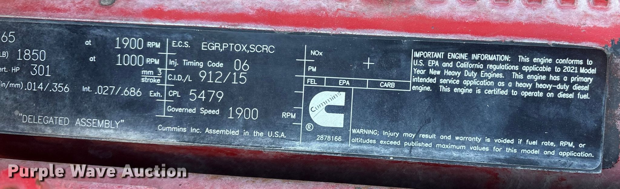 2022 Peterbilt 389 semi truck. Miles: 434,260 on odometer, Hours: 13,313 on meter, VIN: 1XPXD49X7ND789644. Engine Cummins X15 565, Serial: 80350914, Displacement: 15.0L, Cylinders: 6, Fuel type: Diesel, Engine brake. Transmission Eaton, Manual, Speed: 18. Chassis Axles: Tandem, Differential lock: Inter-axle, Suspension: Air Dump valves, Brakes: Air, Truck chassis: 13' 6", GVWR: 52,350 lbs FAWR: 12,350 lbs, IAWR: 20,000 lbs, RAWR: 20,000 lbs. Interior AC, Heat, Heated mirrors, Power windows, Power locks, Cruise control, Air ride cab, Auxiliary controls, Sleeper Sleeper length: 80", Beds: Single, Refrigerator, Rear climate control. Features Deck plate: Aluminum, Fifth wheel type: Air operated, Sliding, Fuel tank: Dual. Tires Size: 285/75R24.5. Notes Traction control dash warning indicator will be repaired prior to auction, Dash warning indicator: Traction control. Kansas title. Title distribution may be delayed up to 30 days from verification of funds. J-Six Enterprises. Hiawatha, KS 66434