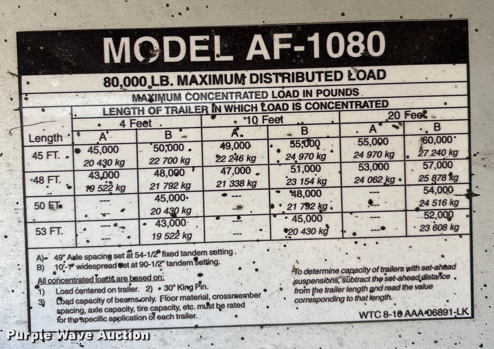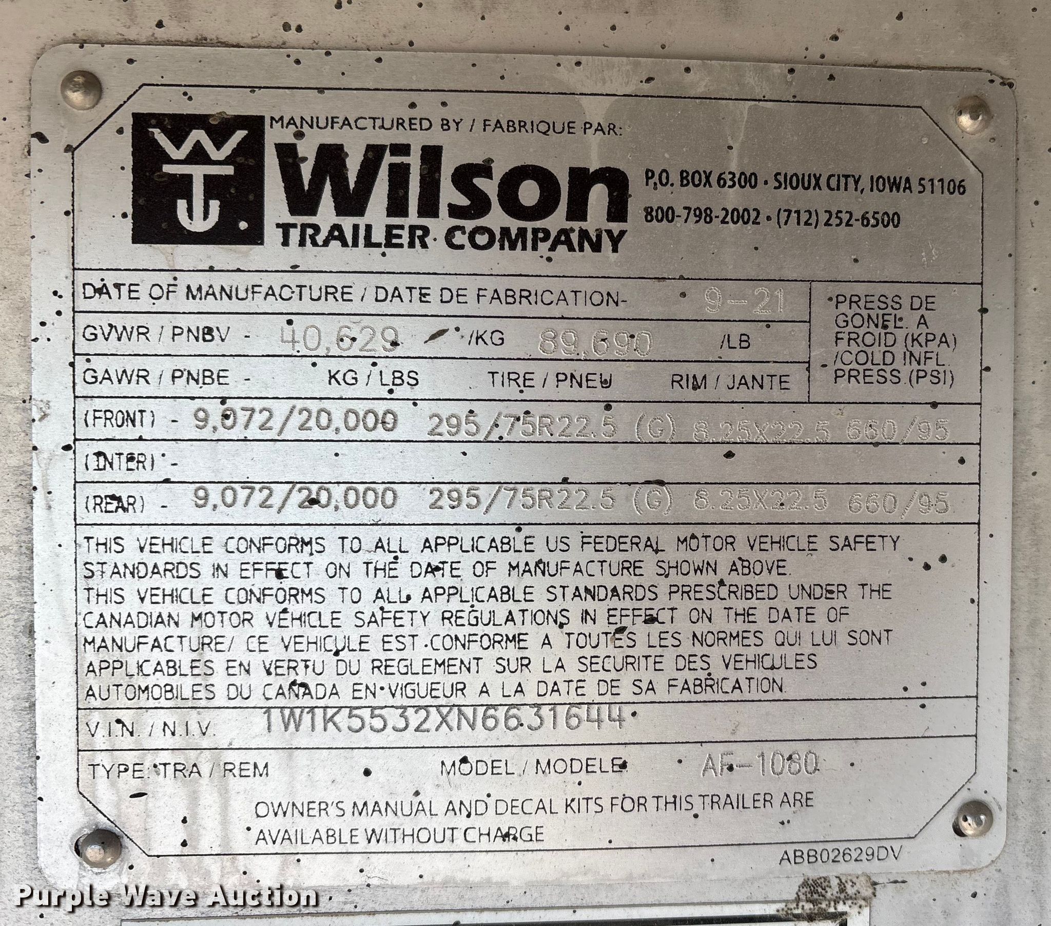 2022 Wilson AF-1080 flatbed trailer. VIN: 1W1K5532XN6631644. Dimensions Overall Length: 53', Width: 100", Deck Length: 52' 7", Width: 97". Features Deck type: Aluminum. Chassis Landing gear: Dual, Suspension: Air, Brakes: Air, Axles: Tandem, Spread, GVWR: 40,629 lbs. Tires Aluminum wheels, Size: 11R22.5. Kansas title. Title distribution may be delayed up to 30 days from verification of funds. J-Six Enterprises. Hiawatha, KS 66434