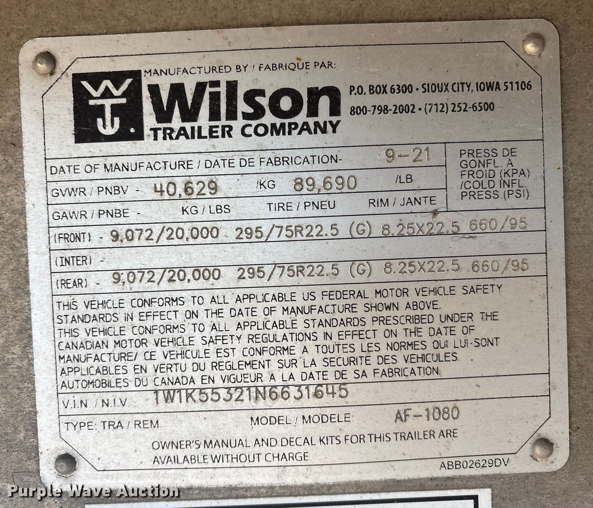 Purple Wave is selling a used Flat or Drop Deck Trailer in Kansas. This item is a 2022 Wilson AF-1080 flatbed trailer with the following: VIN: 1W1K55321N6631645