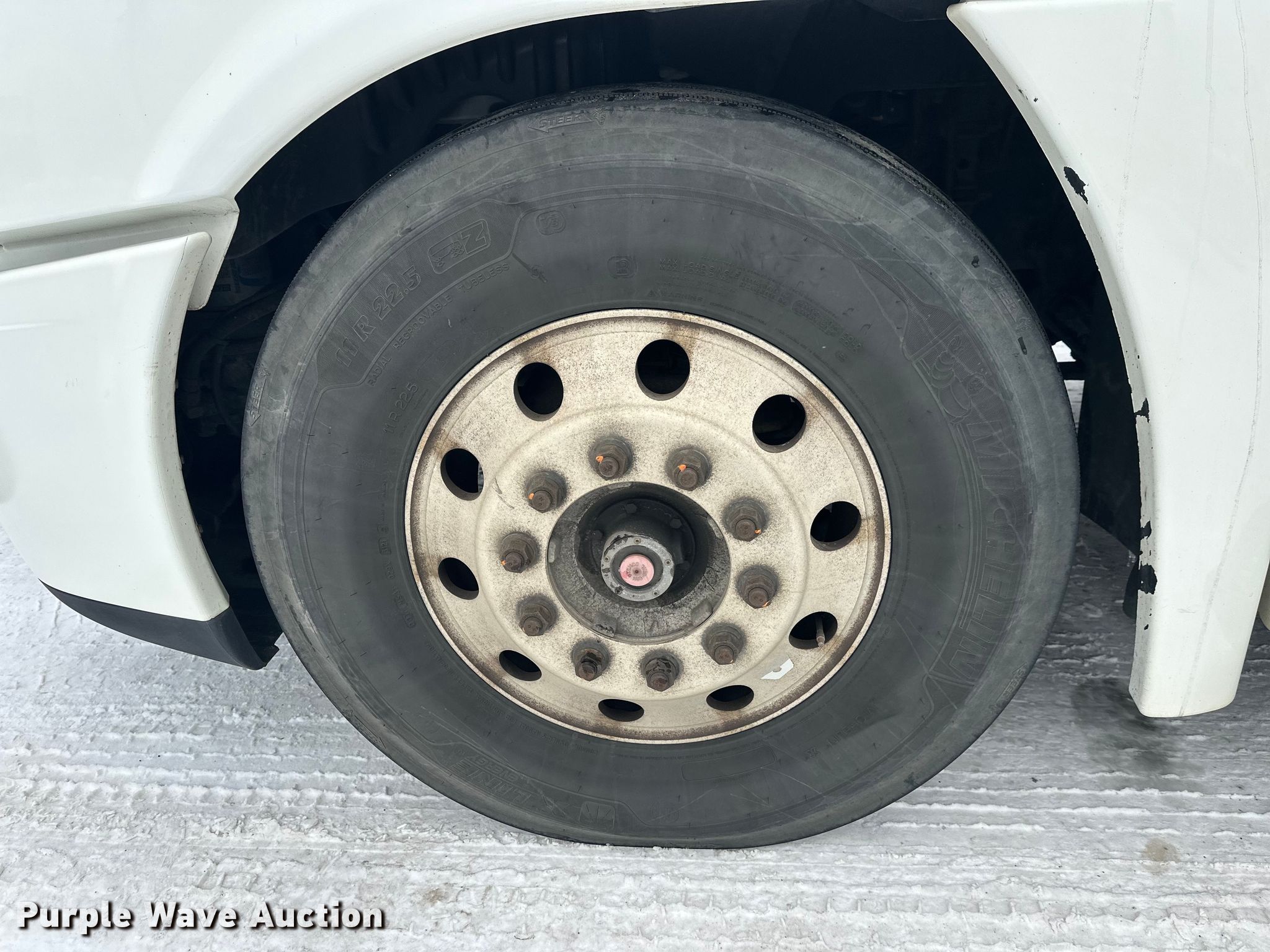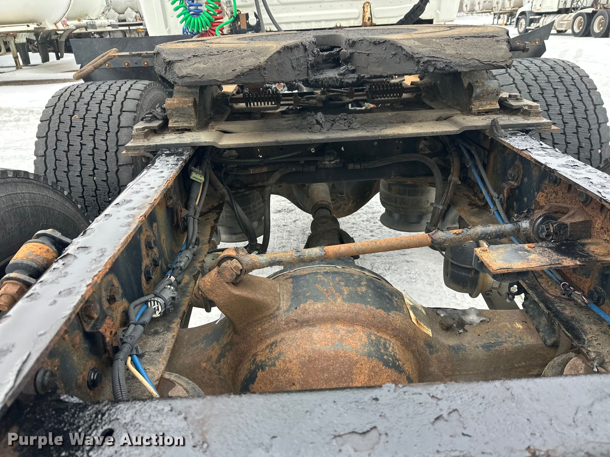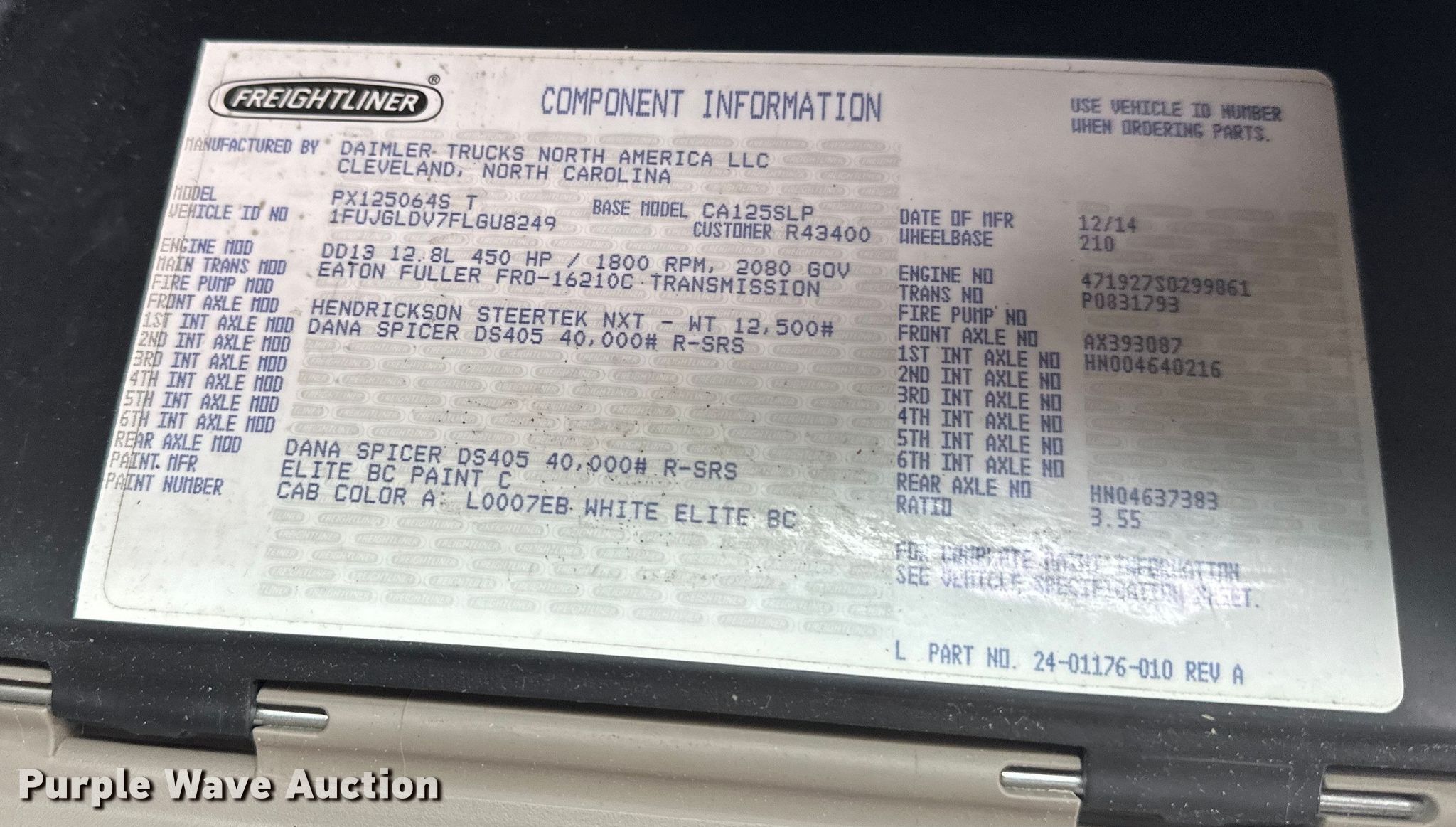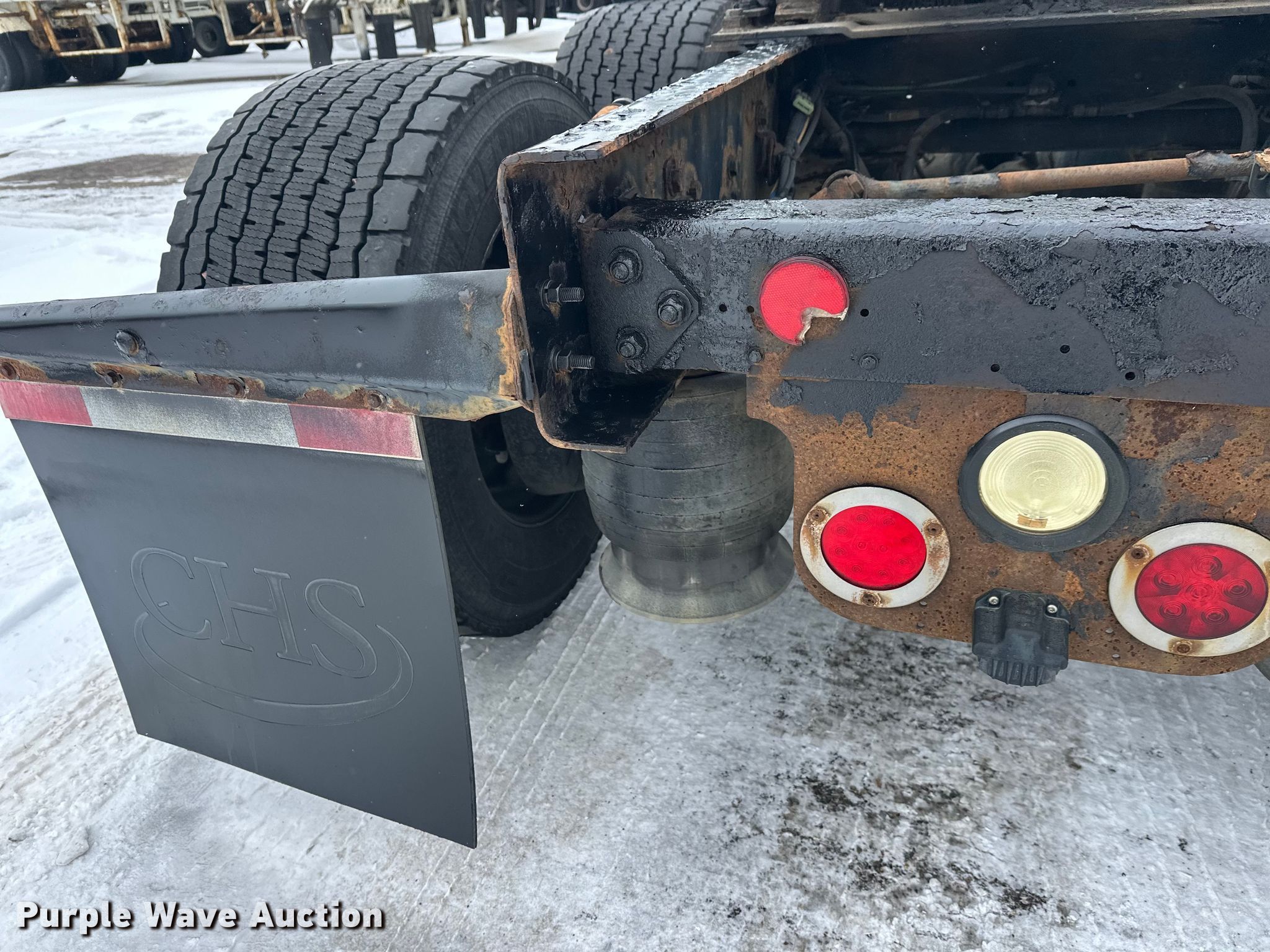 2015 Freightliner Cascadia semi truck. Miles: 677,149 on odometer, Hours: 19,614 on meter, VIN: 1FUJGLDV7FLGU8249. Engine Detroit Diesel DD13, Displacement: 12.8L, Cylinders: 6, Fuel type: Diesel, Engine brake. Transmission Eaton Fuller, Manual, Speed: 10. Chassis Axles: Tandem, Gear ratio: 3.55, Differential lock: Inter-axle, Suspension: Air Dump valves, Brakes: Air, PTO, Wet kit, GVWR: 46,350 lbs FAWR: 12,350 lbs, IAWR: 17,000 lbs, RAWR: 17,000 lbs, Wheelbase: 210". Interior AC, Heat, Heated mirrors, Power windows, Cruise control, Air ride cab, Sleeper Sleeper length: 54", Beds: Single, Rear climate control. Features Deck plate: Aluminum, Fifth wheel type: Air operated, Sliding, Fuel tank: Single. Tires Front: 11R22.5, Rear: 445/50R22.5. Notes Dash warning indicator: Check engine, Stop engine, Battery. Minnesota title. Title distribution may be delayed up to 30 days from verification of funds. CHS, Inc.. Rosemount, MN 55068