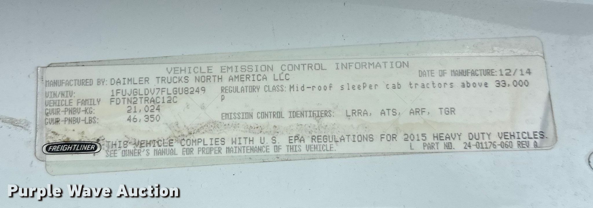 Purple Wave is selling a used Truck Tractor in Minnesota. This item is a 2015 Freightliner Cascadia semi truck with the following: Miles: 677,149 on odometer, Hours: 19,614 on meter, VIN: 1FUJGLDV7FLGU8249
