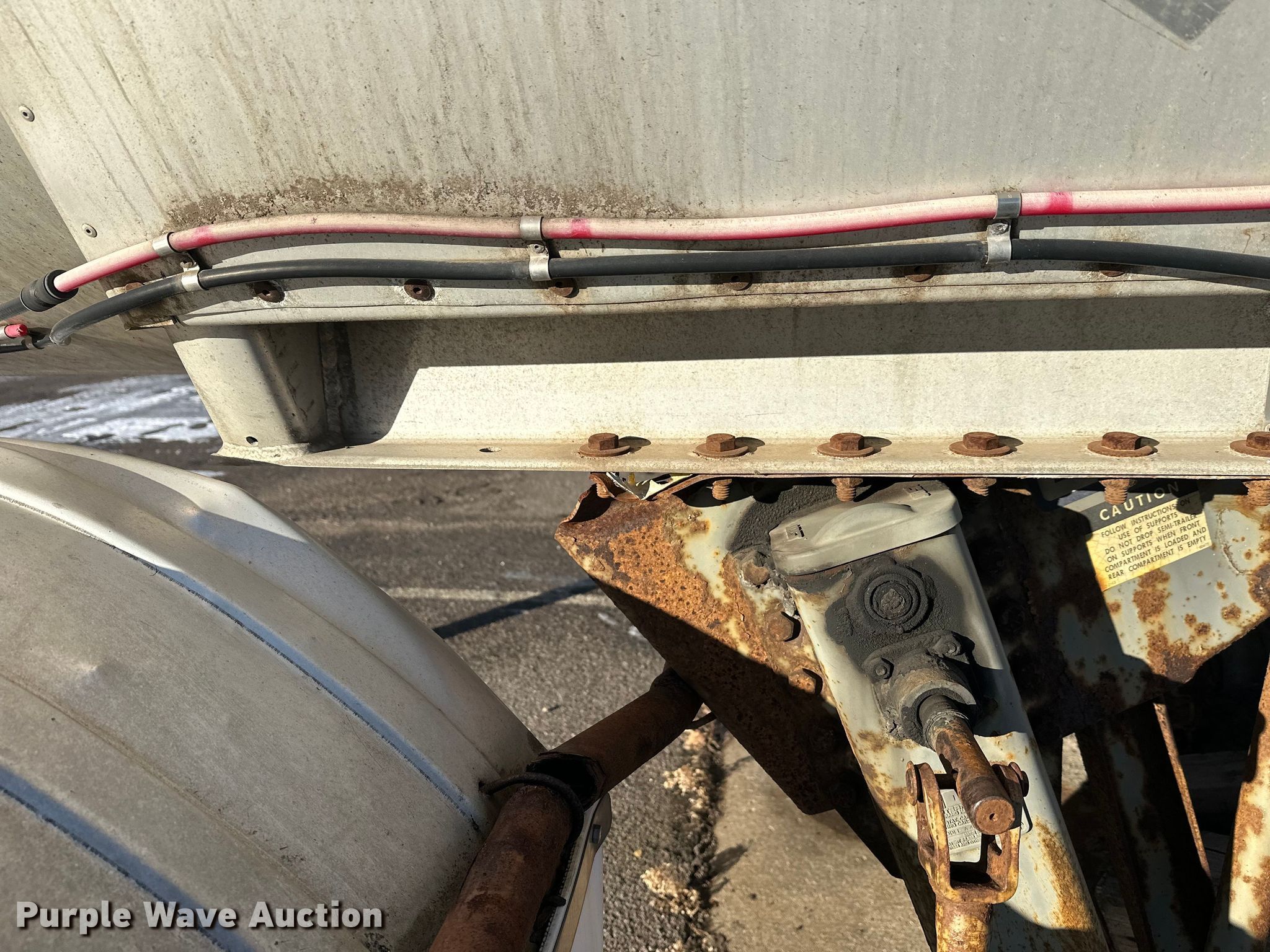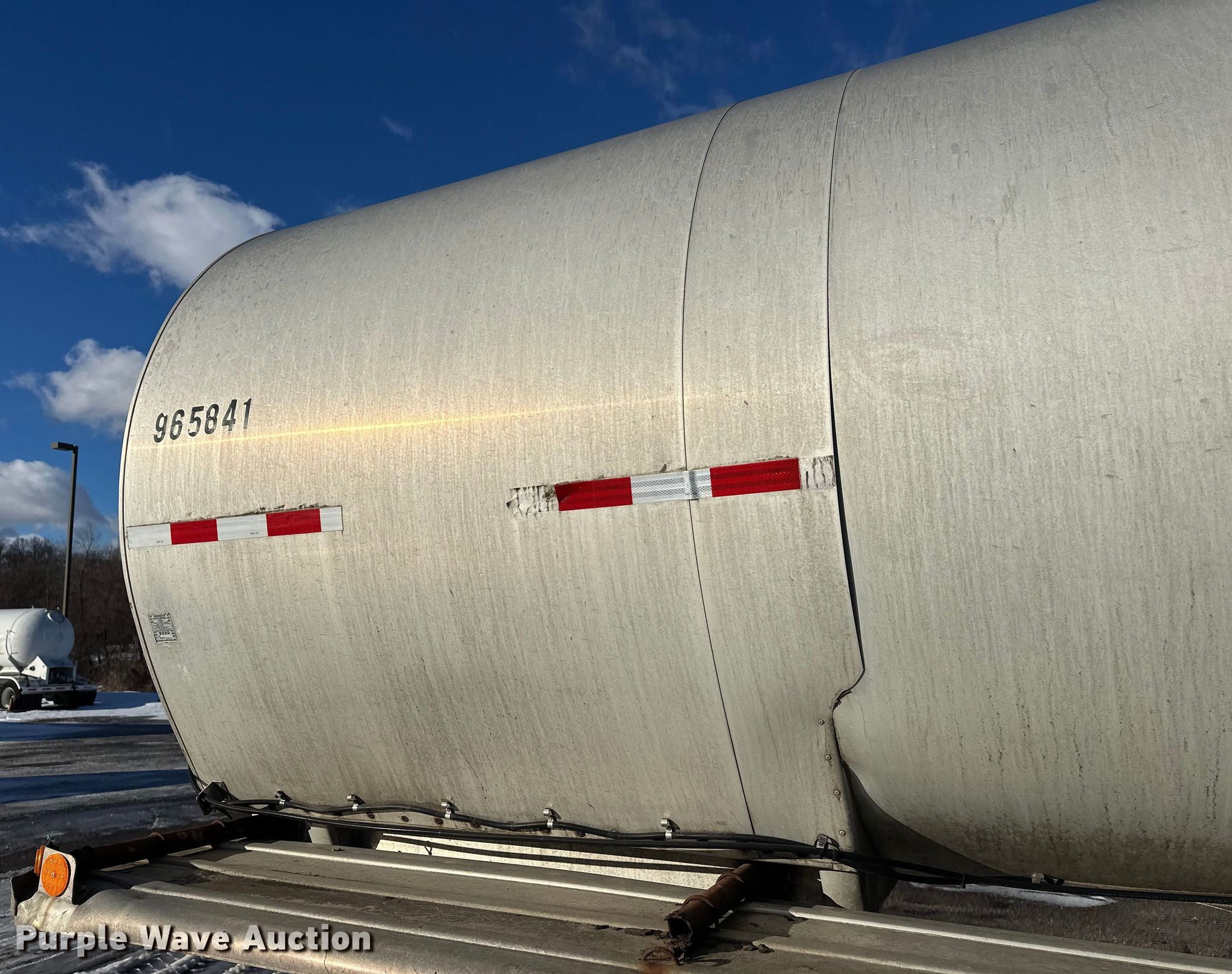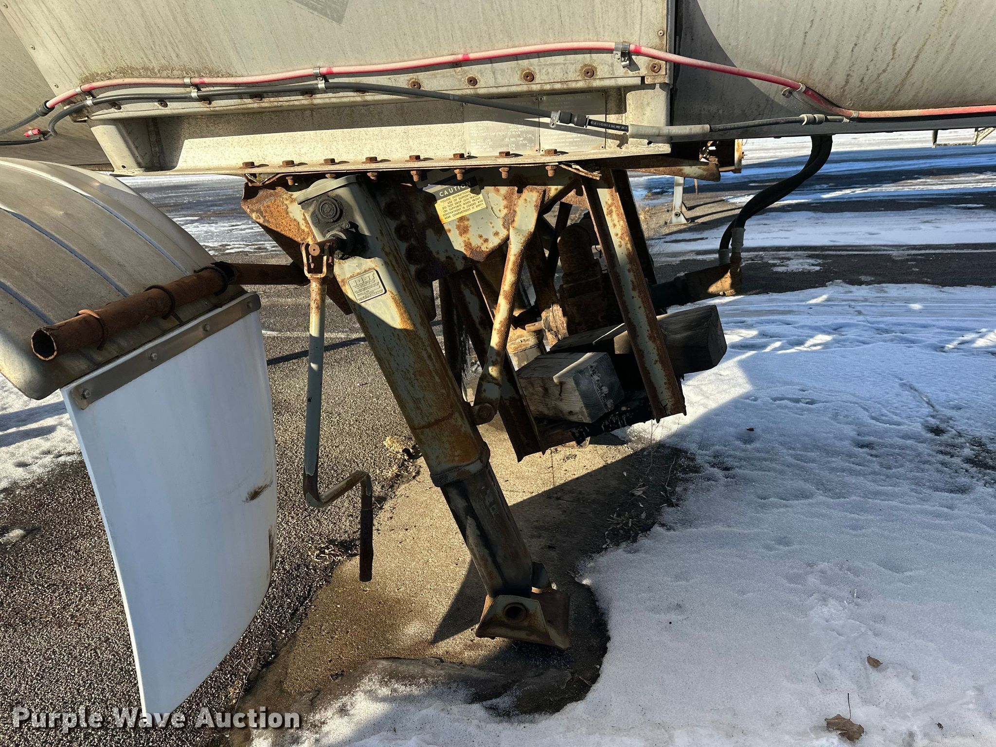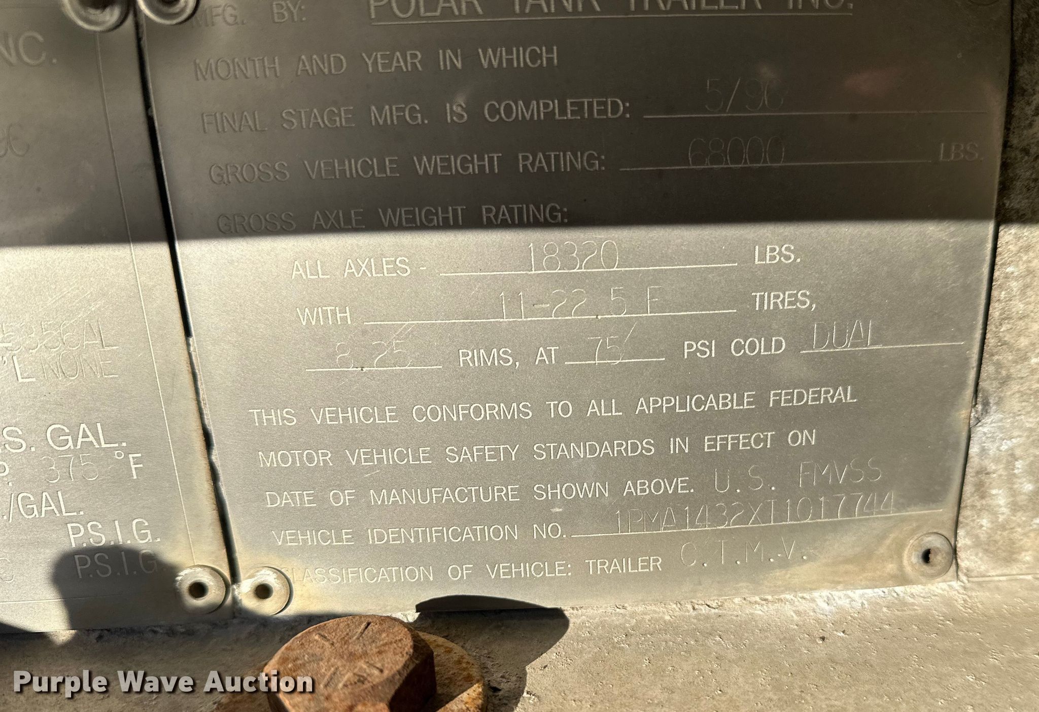 1996 Polar Tank asphalt trailer. VIN: 1PMA1432XT1017744. Dimensions Overall Length: 42', Width: 96". Features Tank type: Aluminum Capacity: 7,500 BBL, Outlet valves: 1 Size: 3", No. of manways/manholes: 1 Width: 20", Pump Outlet size: 3". Chassis Landing gear: Dual, Suspension: Spring, Brakes: Air, Axles: Tandem, GVWR: 68,000 lbs. Tires Steel wheels, Size: 11R22.5. Notes Landing gear damaged, Jack stand not included. Minnesota title. Title distribution may be delayed up to 30 days from verification of funds. CHS, Inc.. Rosemount, MN 55068