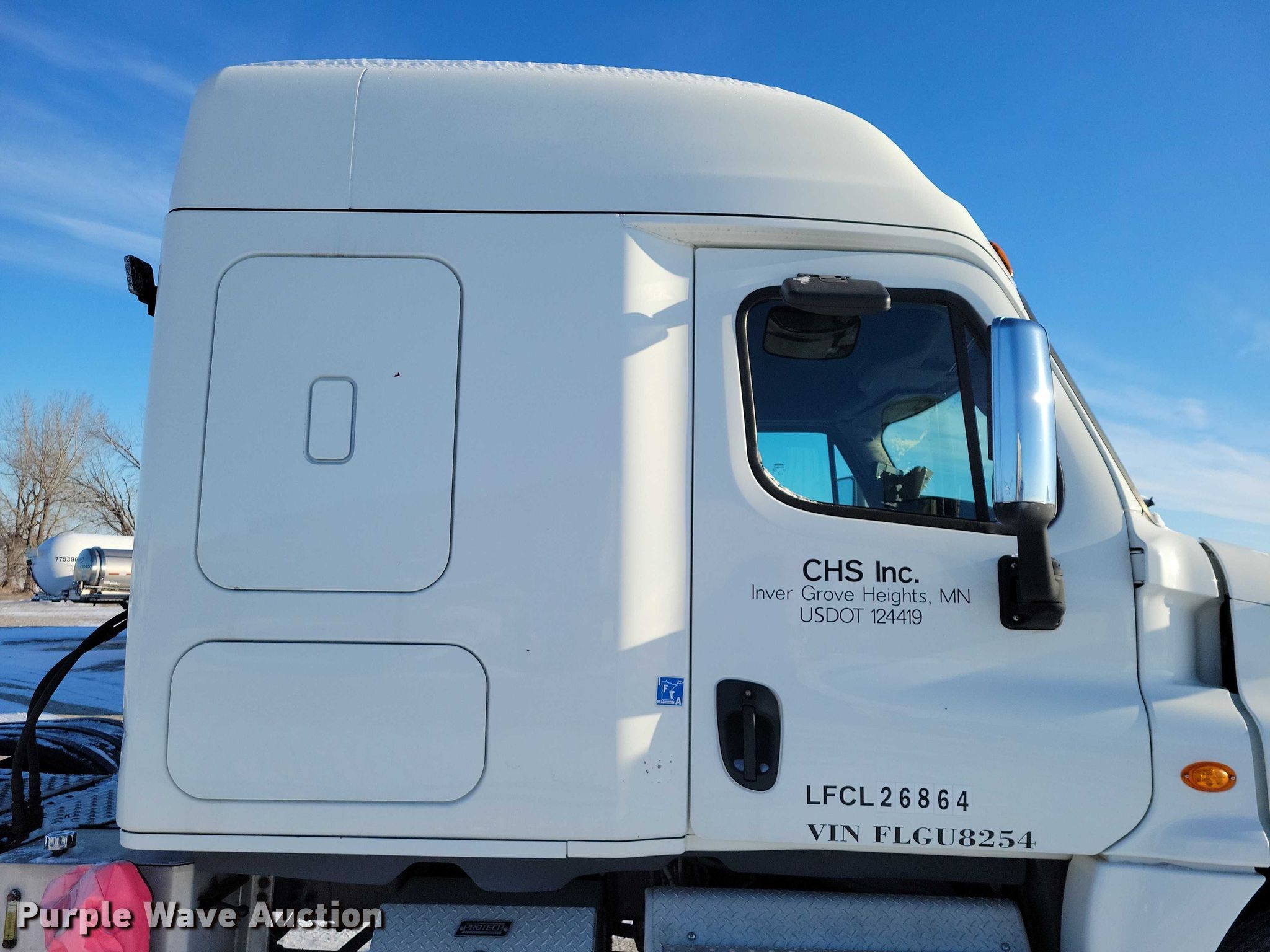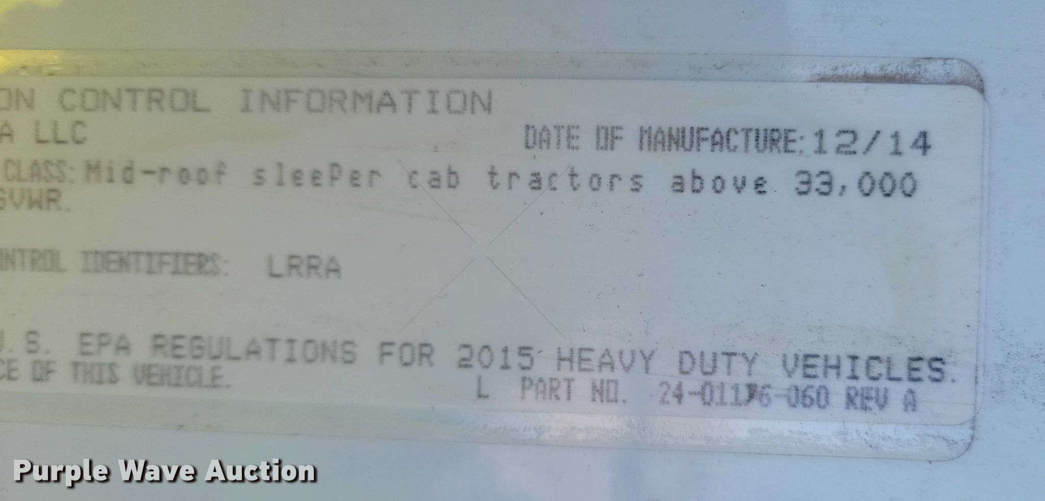 2015 Freightliner Cascadia semi truck. Miles: 692,055 on odometer, VIN: 1FUJGLDV0FLGU8254. Engine Detroit Diesel, Displacement: 12.8L, Cylinders: 6, Fuel type: Diesel, Engine brake. Transmission Eaton Fuller, Manual, Speed: 10. Chassis Axles: Tandem, Differential lock: Inter-axle, Suspension: Air Dump valves, Brakes: Air, PTO, Wet kit, GVWR: 46,350 lbs FAWR: 12,350 lbs, IAWR: 17,000 lbs, RAWR: 17,000 lbs. Interior AC, Heat, Heated mirrors, Power windows, Cruise control, Air ride cab, Sleeper Sleeper length: 47", Rear climate control. Features Deck plate: Aluminum, Fifth wheel type: Air operated, Sliding, Fuel tank: Single. Tires Front: 11R22.5, Rear: 445/50R22.5. Minnesota title. Title distribution may be delayed up to 30 days from verification of funds. CHS, Inc.. Mason City, IA 50401
