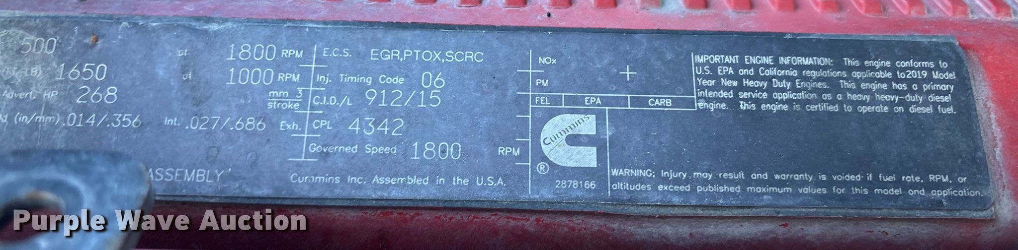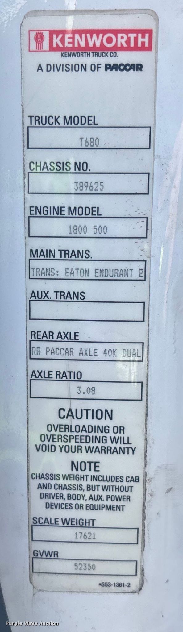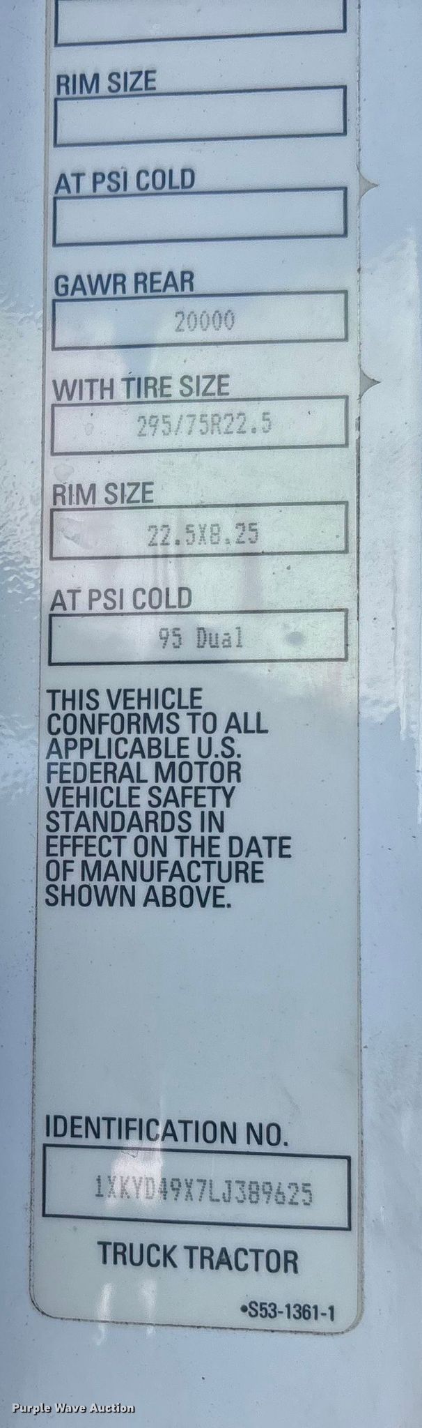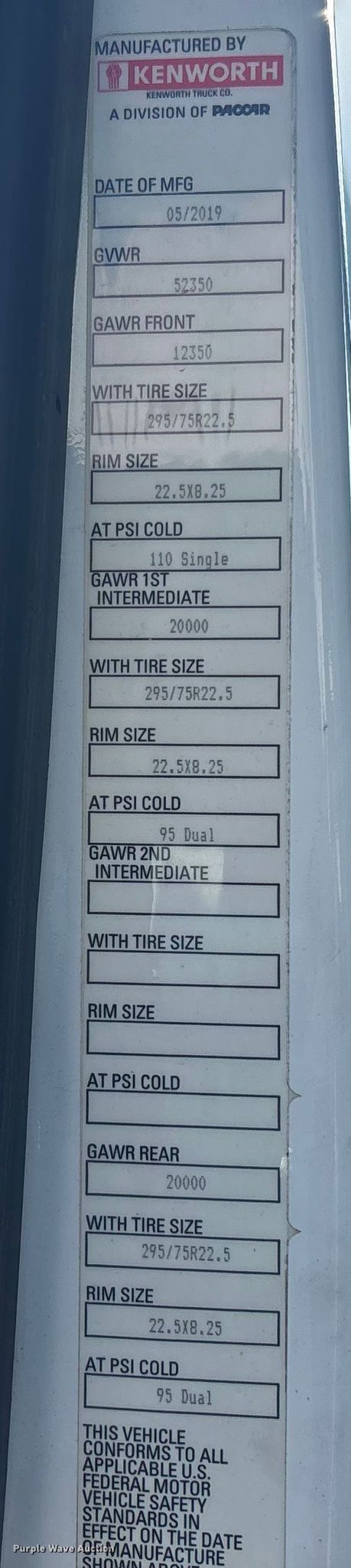 2020 Kenworth T680 semi truck. Miles: 813,978 on odometer, Hours: 25,568 on meter, VIN: 1XKYD49X7LJ389625, Unit #: 90790115. Engine Cummins X15 500, Displacement: 15.0L, Cylinders: 6, Fuel type: Diesel, HP: 500, Engine brake. Transmission Automated manual. Chassis Axles: Tandem, Gear ratio: 3.08, Differential lock: Inter-axle, Suspension: Air Dump valves, Brakes: Air, GVWR: 52,350 lbs FAWR: 12,350 lbs, IAWR: 20,000 lbs, RAWR: 20,000 lbs. Interior AC, Heat, Heated mirrors, Power windows, Power locks, Cruise control, Air ride cab, Brake controller, Sleeper Sleeper length: 68", Beds: Double bunk, TV, Refrigerator, Microwave, Rear climate control. Features Deck plate: Aluminum, Fifth wheel type: Air operated, Sliding, Fuel tank: Dual. Tires Size: 295/75R22.5. Notes Windshield chipped or cracked, Jump start required during on-site data collection. Repossessed item, stored at a secured facility. Please review REQUIRED REMOVAL INSTRUCTIONS. Titles will be distributed after confirmation of payment and removal. Indiana title. Title distribution may be delayed up to 30 days from verification of funds. Lender Owned. Jacksonville, FL 32218