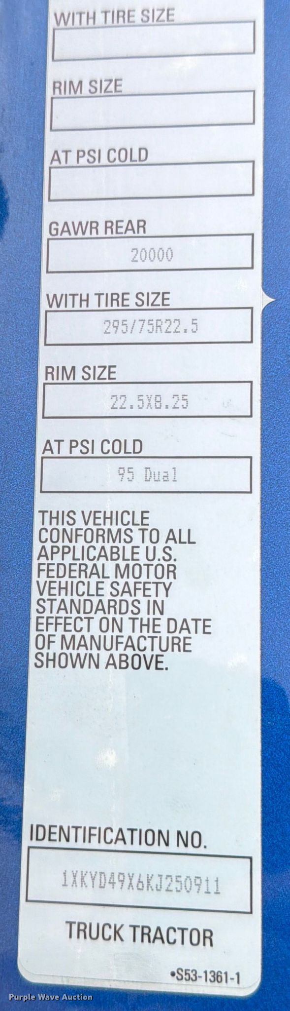 - VIN: 1XKYD49X6KJ250911