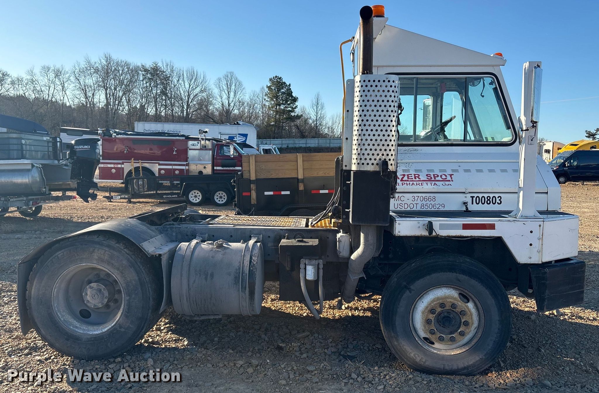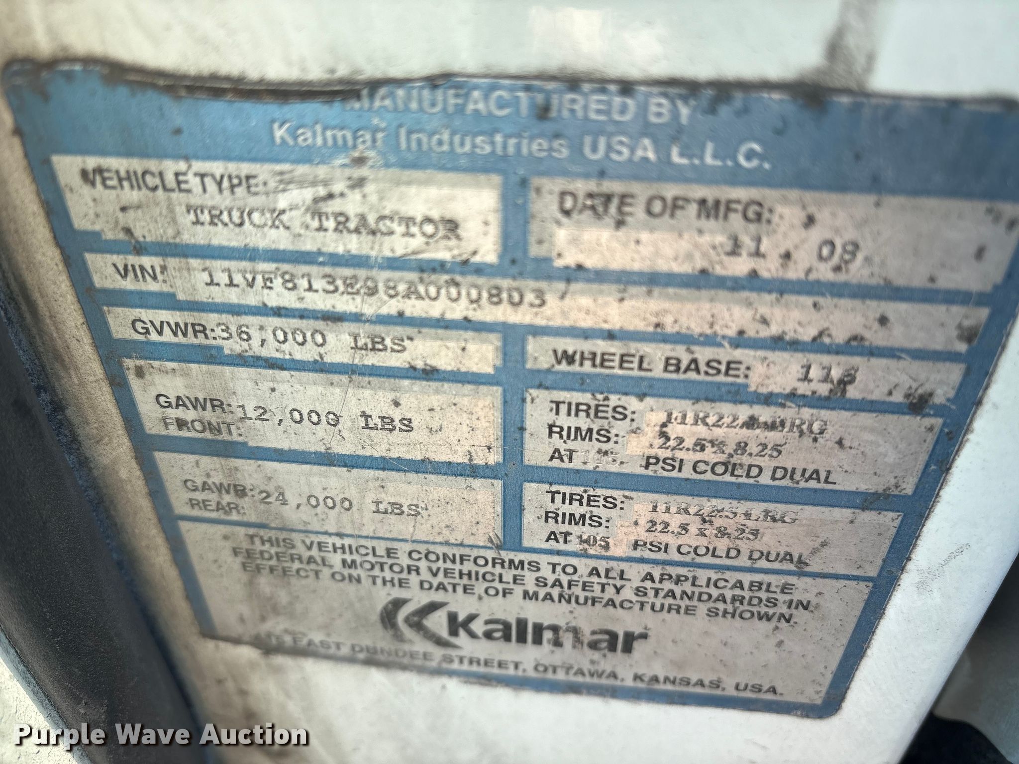 2008 Kalmar Ottawa yard truck. Miles: 49,028 on odometer, Hours: 21,699 on meter, VIN: 11VF813E98A000803, Unit #: 94817485. Engine Cummins, Displacement: 5.9L, Cylinders: 6, Fuel type: Diesel. Transmission Allison, Automated manual. Chassis Axles: Single, Suspension: Spring, Brakes: Air, GVWR: 36,000 lbs FAWR: 12,000 lbs, RAWR: 24,000 lbs. Interior Heat. Features Deck plate: Steel, Fifth wheel type: Hydraulic lift, Fuel tank: Dual. Tires Size: 11R22.5. Notes Air pressure issues, will not build air, Unknown operating condition. Fleet inventory reduction, stored at a secured facility. Please review REQUIRED REMOVAL INSTRUCTIONS. Titles will be distributed after confirmation of payment and removal. Georgia title. Title distribution may be delayed up to 30 days from verification of funds. Lazer Logistics. Chatham, VA 24531