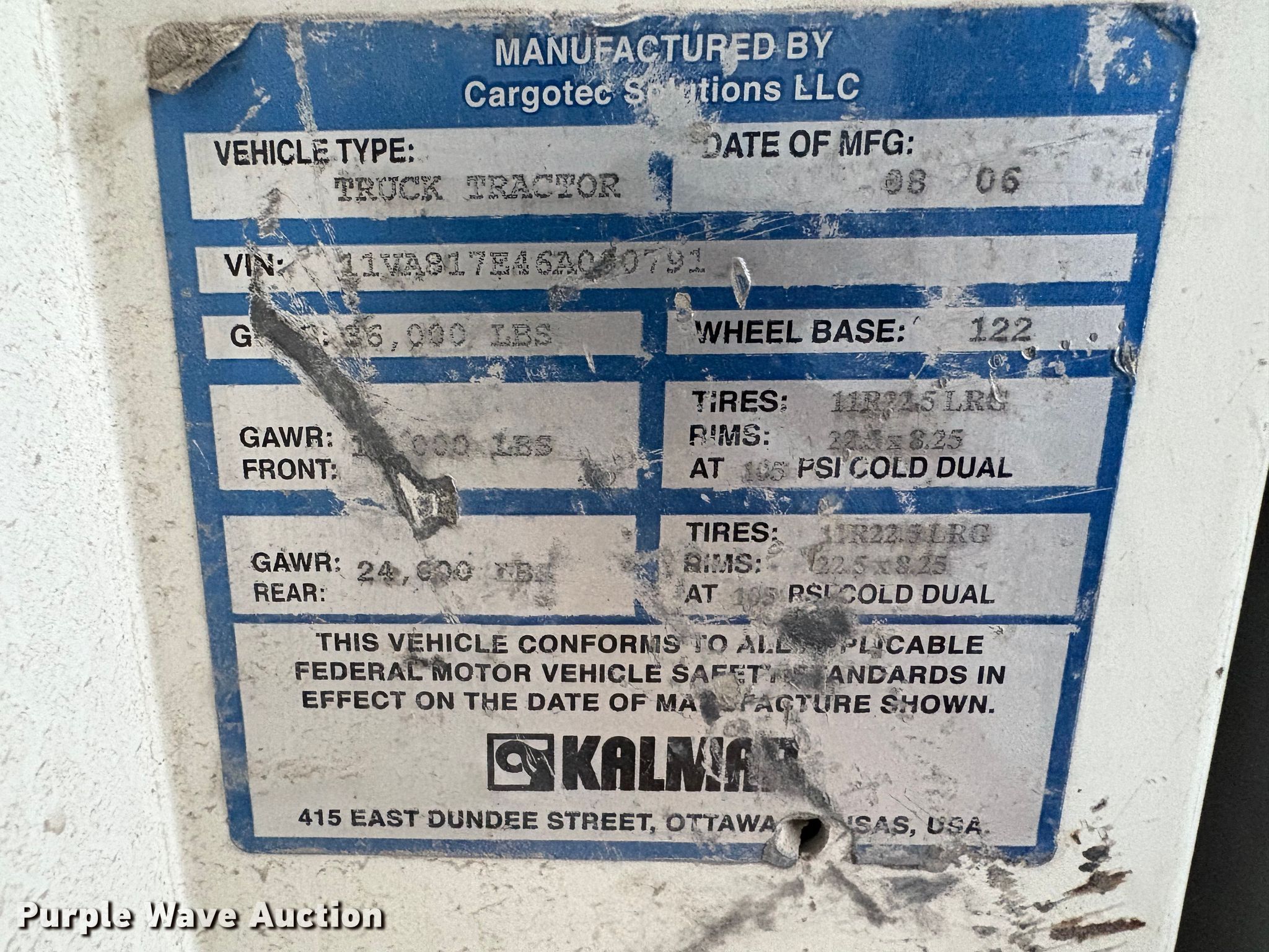2006 Kalmar CYT 30 yard truck. Miles: 4,628 on odometer, Hours: 12,389 on meter, VIN: 11VA817E46A000791, Unit #: 95419255. Engine Cummins, Cylinders: 6, Fuel type: Diesel. Transmission Allison, Automatic. Chassis Axles: Single, Suspension: Spring, Brakes: Air, Truck chassis: 10' 3", GVWR: 36,000 lbs, Wheelbase: 122". Interior Heat, Air ride cab. Features Deck plate: Steel, Fifth wheel type: Hydraulic lift, Fuel tank: Dual. Tires Size: 295/75R22.5. Notes Possible engine issues, turns over but will not start , Unknown operating condition. Fleet inventory reduction, stored at a secured facility. Please review REQUIRED REMOVAL INSTRUCTIONS. Titles will be distributed after confirmation of payment and removal. Georgia title. Title distribution may be delayed up to 30 days from verification of funds. Lazer Logistics. Florence, MS 39073