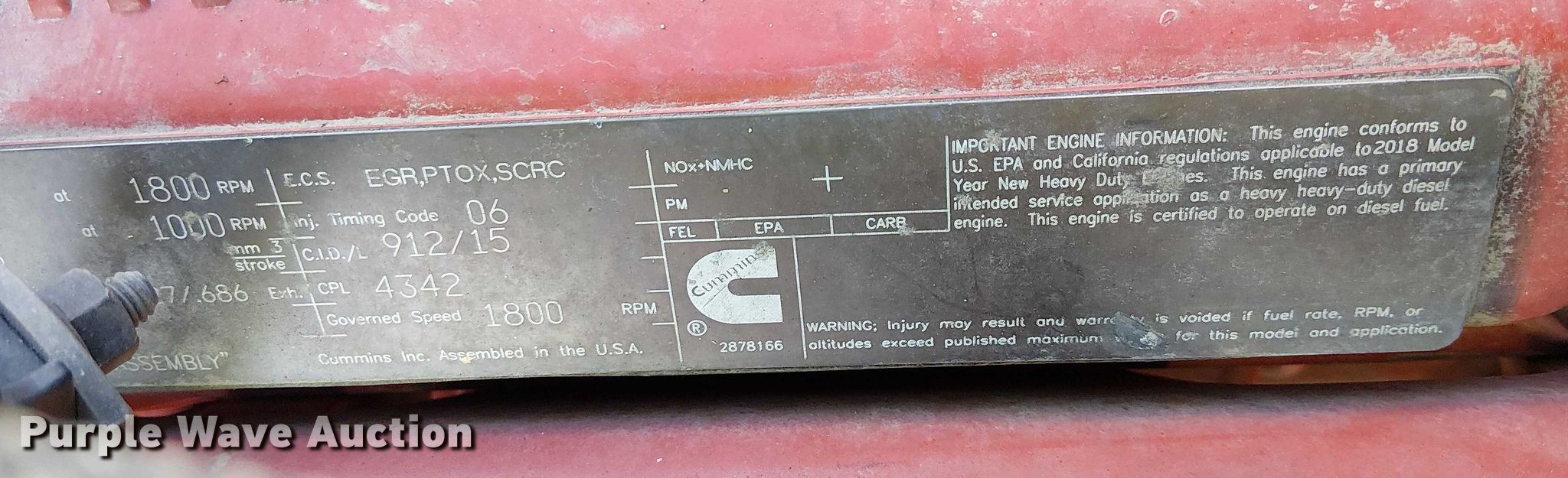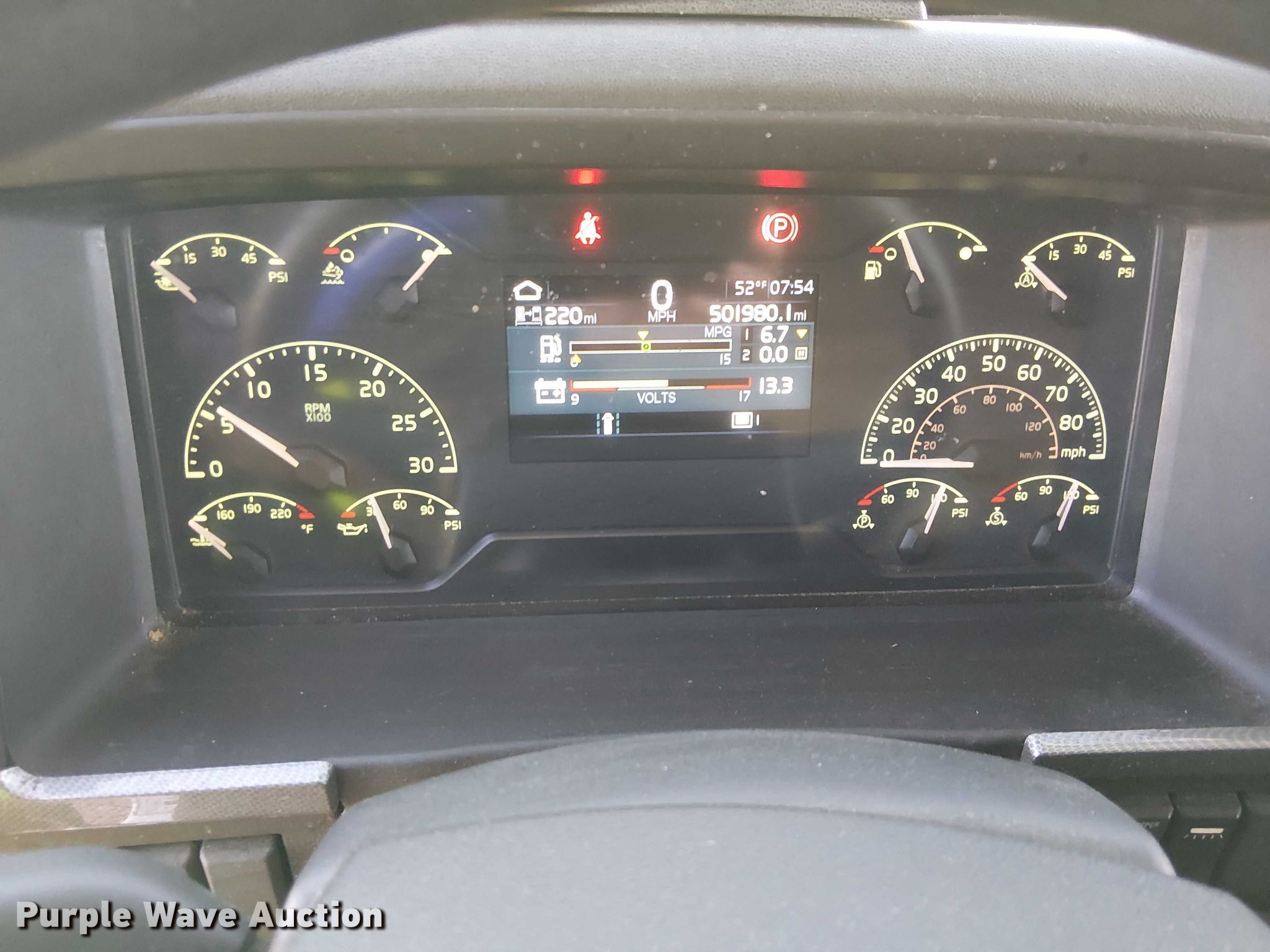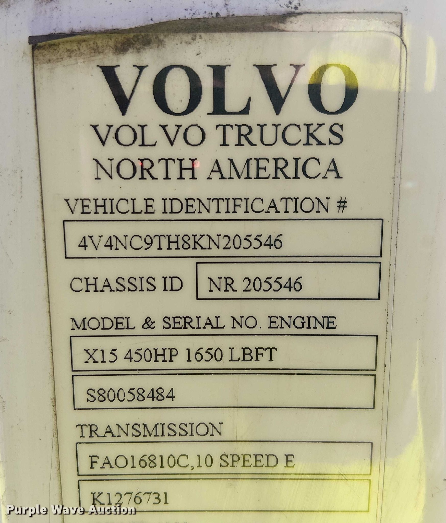 2019 Volvo VNL semi truck. Miles: 501,980 on odometer, VIN: 4V4NC9TH8KN205546, Unit #: 97372295. Engine Cummins ISX15, Serial: 60058484, Displacement: 14.9 L, Cylinders: 6, Fuel type: Diesel, Engine brake. Transmission Eaton Fuller FAO16810C, Manual, Speed: 10. Chassis Axles: Tandem, Differential lock: Inter-axle, Suspension: Air Dump valves, Brakes: Air, GVWR: 52,500 lbs FAWR: 12,500 lbs, IAWR: 20,000 lbs, RAWR: 20,000 lbs. Interior AC, Heat, Power windows, Power locks, Cruise control, Air ride cab, Brake controller, Sleeper Sleeper length: 68", Beds: Double bunk, Rear climate control. Features Deck plate: Aluminum, Fifth wheel type: Air operated, Sliding, Fuel tank: Dual. Tires Size: 295/75R22.5. Notes Non-operational interior hood release latch, Windshield chipped or cracked. Repossessed item, stored at a secured facility. Please review REQUIRED REMOVAL INSTRUCTIONS. Titles will be distributed after confirmation of payment and removal. Indiana title. Title distribution may be delayed up to 30 days from verification of funds. Lender Owned. 24125 North 7th Avenue. Phoenix, AZ 85085