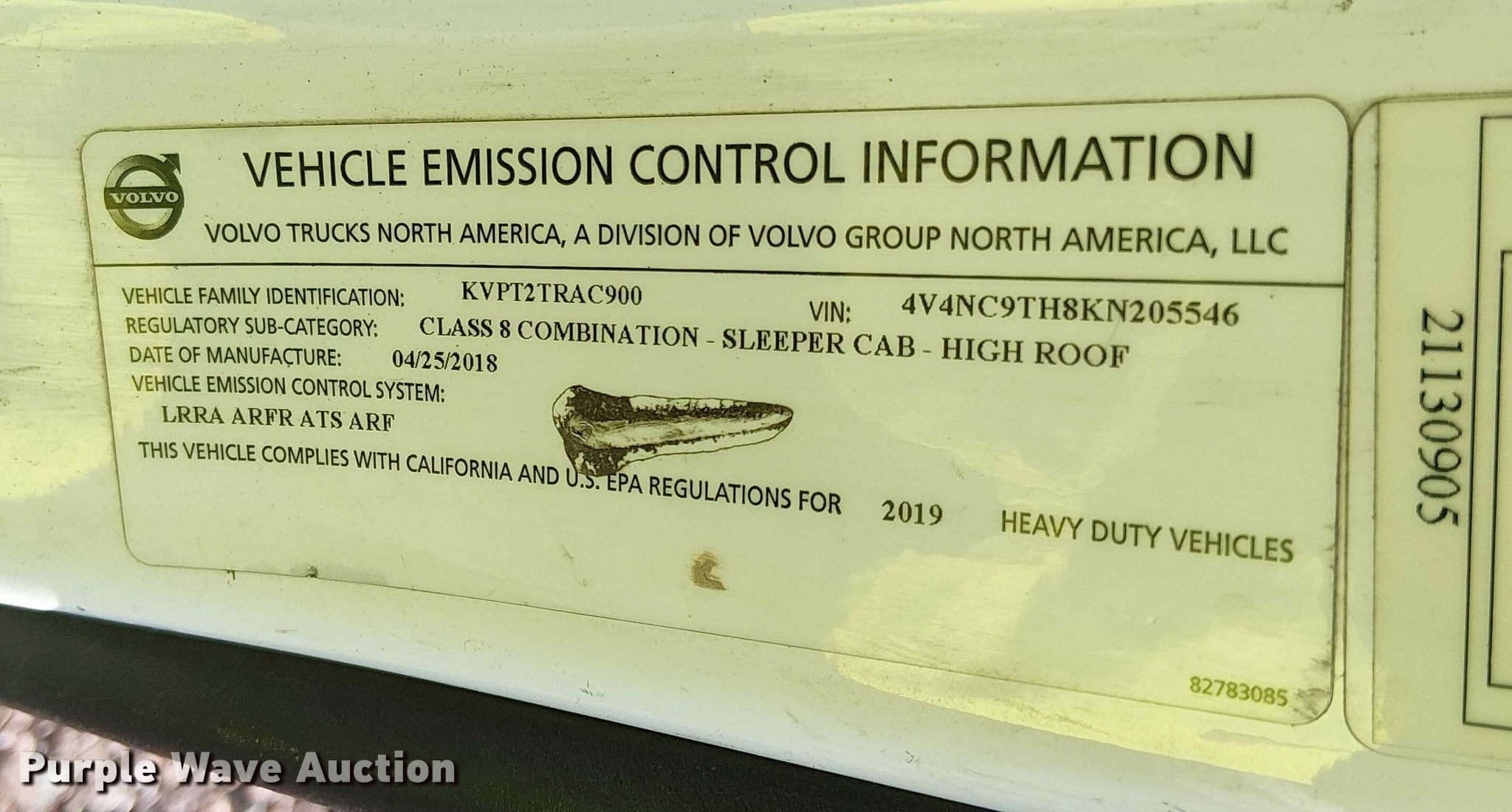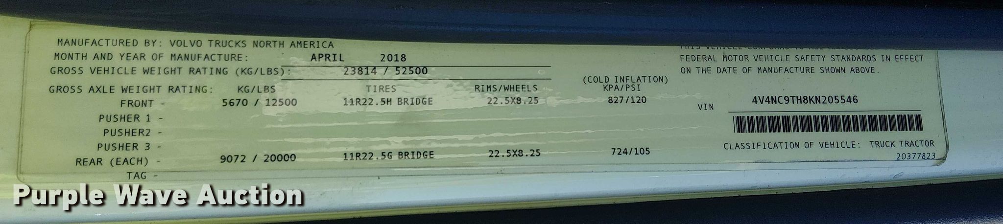 Purple Wave is selling a used Truck Tractor in Arizona. This item is a 2019 Volvo VNL semi truck with the following: Miles: 501,980 on odometer, VIN: 4V4NC9TH8KN205546, Unit #: 97372295