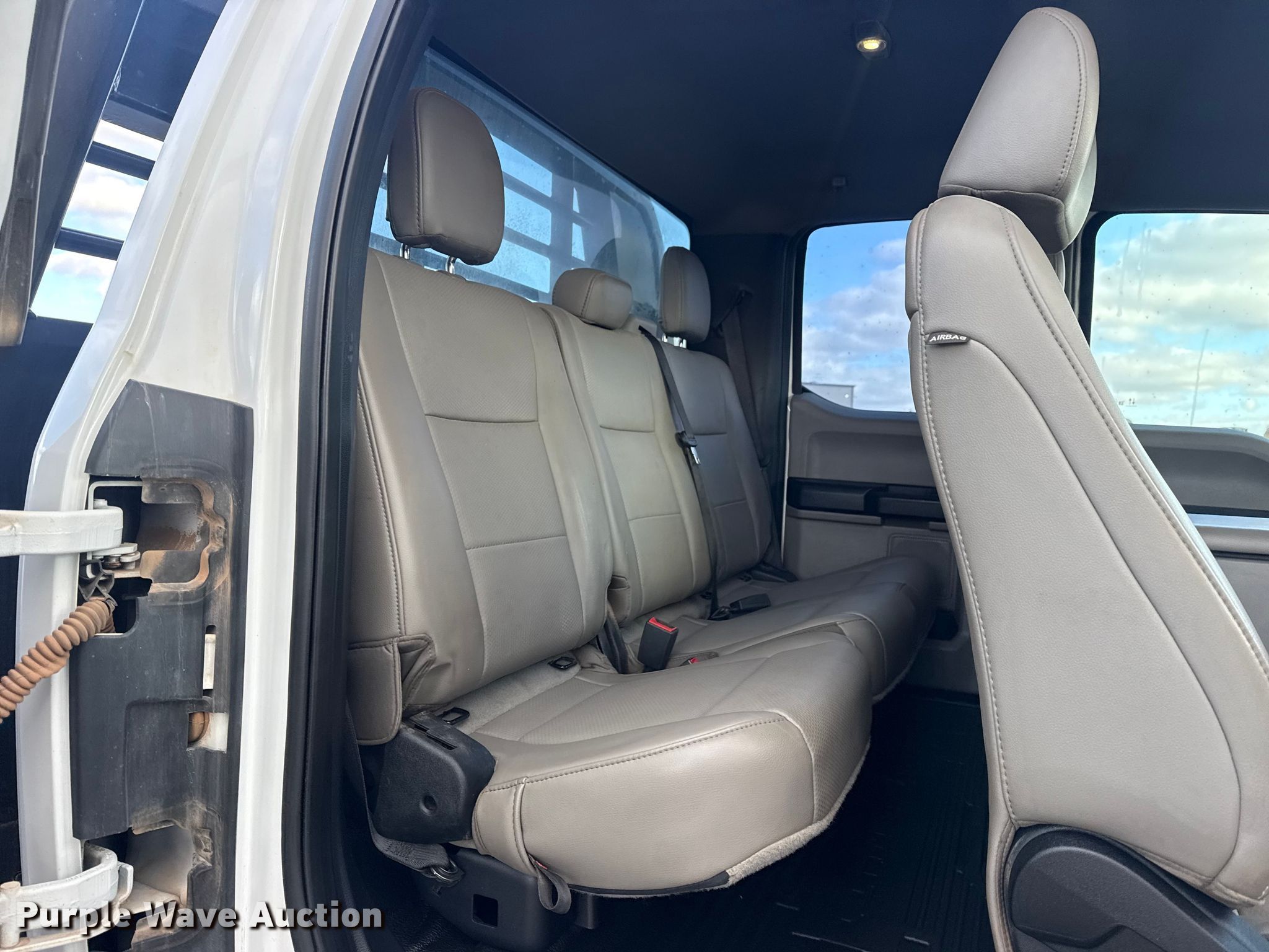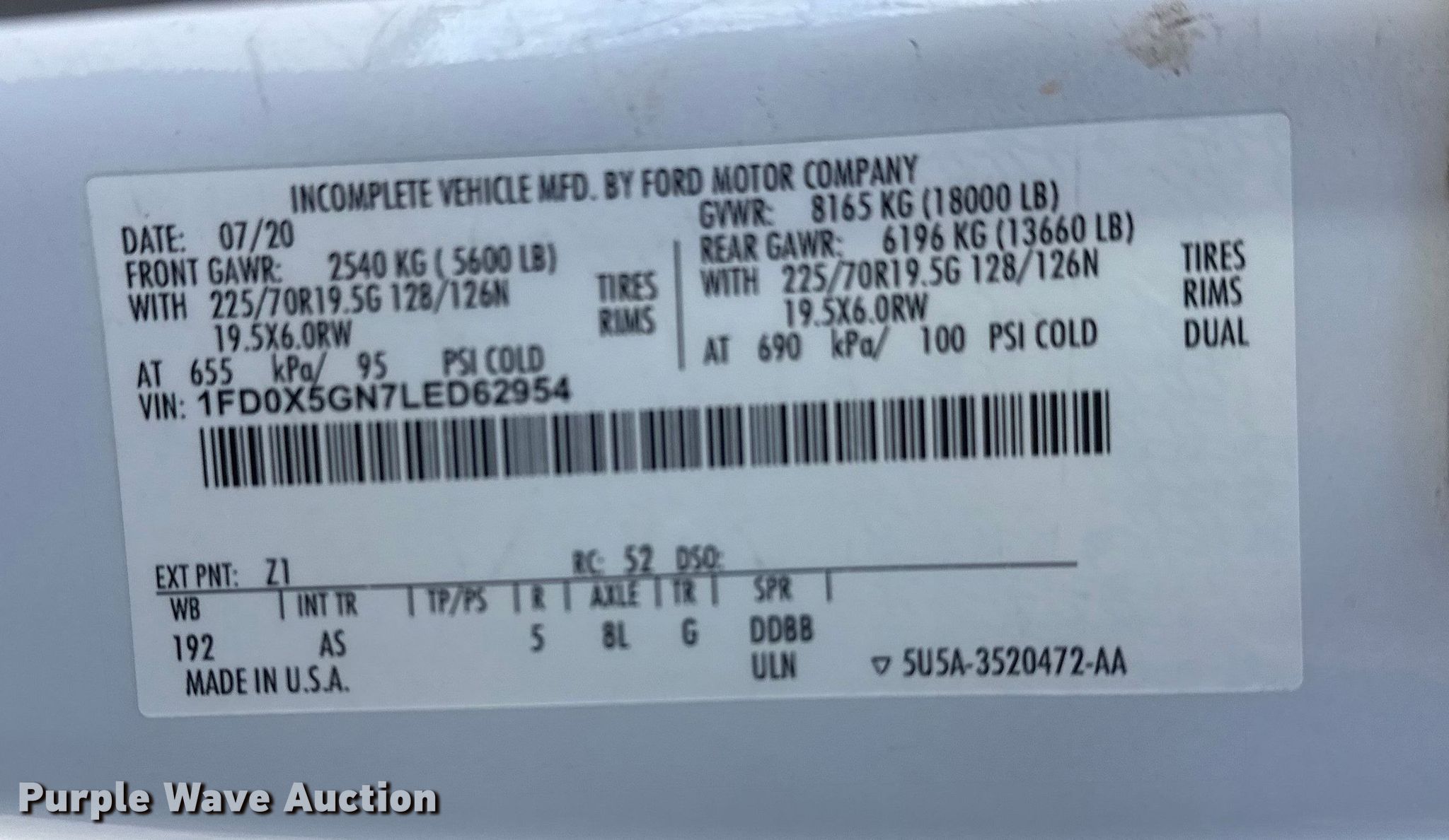 2020 Ford F550 Ext. Cab flatbed truck. Miles: 241,379 on odometer, VIN: 1FD0X5GN7LED62954, Unit #: 04.142. Engine Displacement: 7.3L, Cylinders: 8, Fuel type: Gas. Transmission Automatic. Chassis Axles: Single, Suspension: Spring, Brakes: Hydraulic, GVWR: 18,000 lbs. Interior AC, Heat, Heated mirrors, Power windows, Power locks, Cruise control, Backup camera, Auxiliary controls, Brake controller. Features Bed Flatbed, Length: 11' 4", Width: 93", Hitch: Gooseneck, Removable sides. Tires Size: 225/70R19.5. Notes Engine issues, noise Possible lifter issue. Kansas title. Title distribution may be delayed up to 14 days from verification of funds. Sherwood Construction Company. Owasso, OK 74055