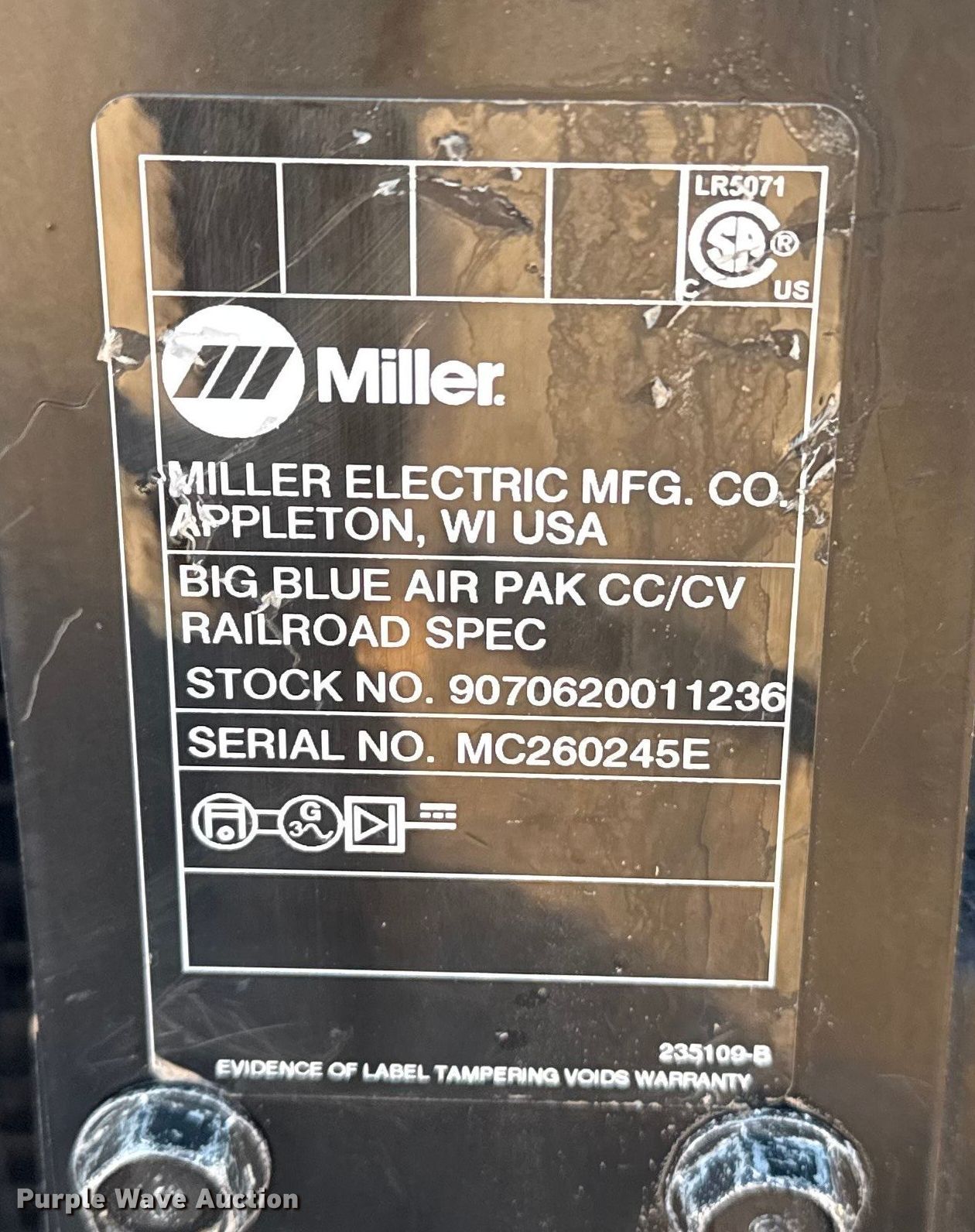 Purple Wave is selling a used Welder (Manual) in Oklahoma. This item is a Miller Big Blue Air Pak welder/generator with the following: Hours: 3,038 on meter, Serial: MC260245E