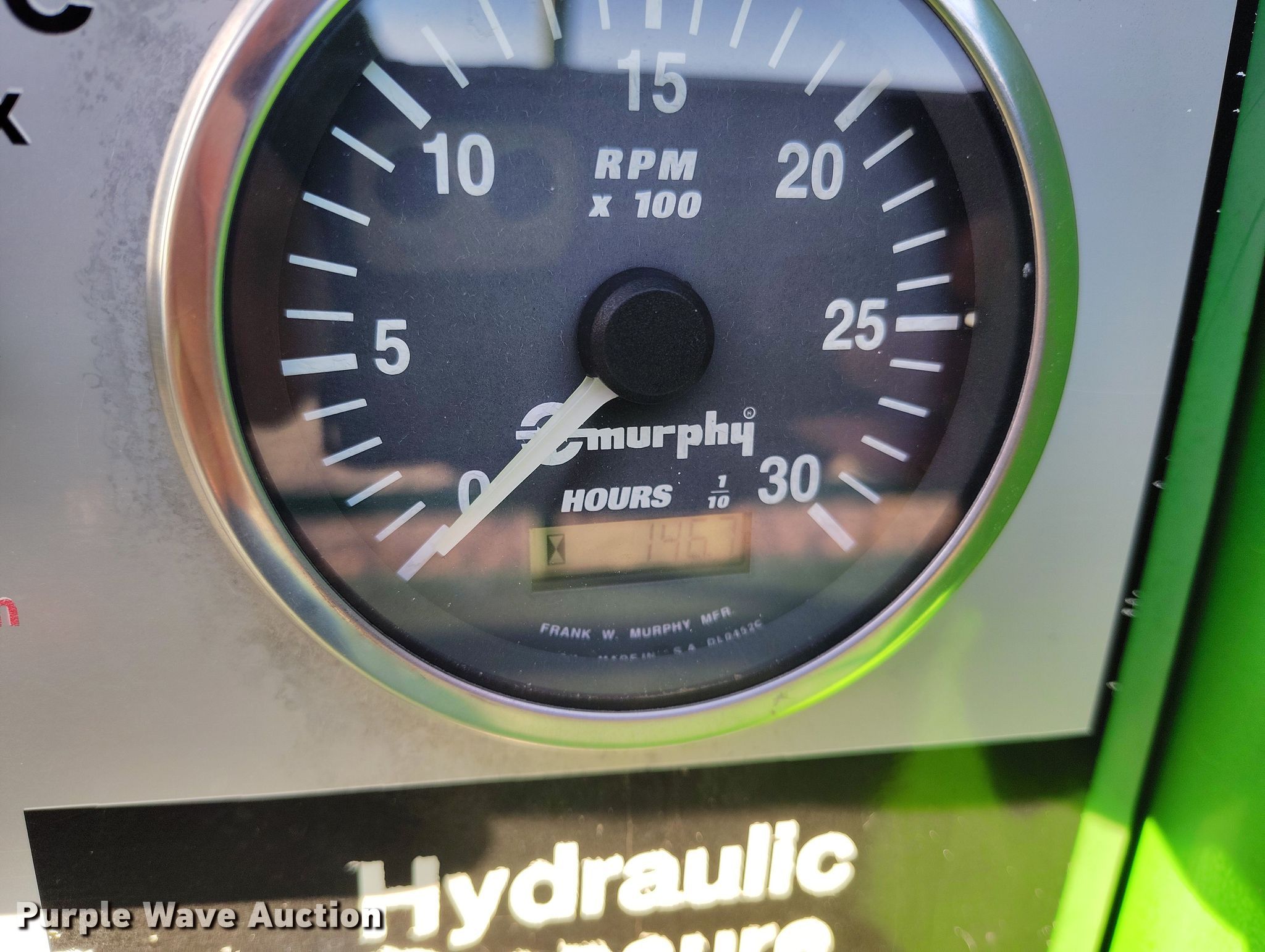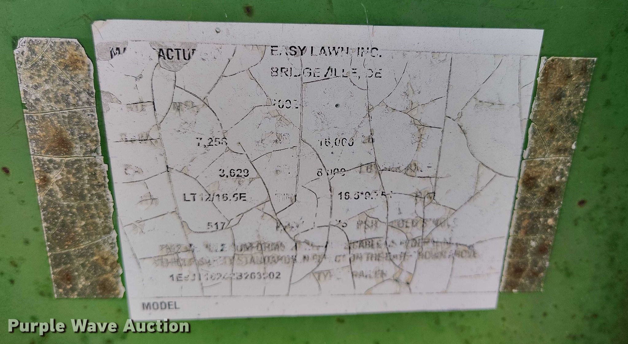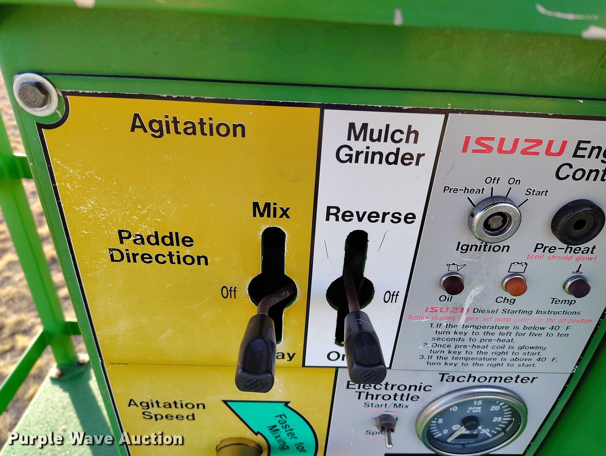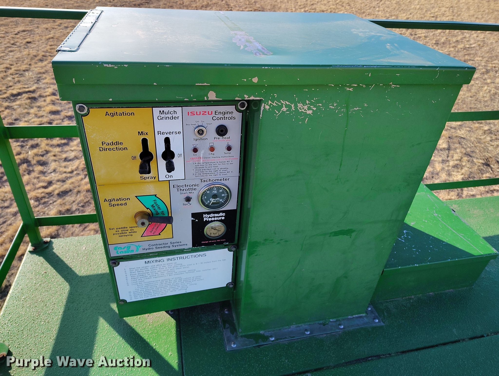 Easy Lawn C125 hydroseeder. Hours: 147 on meter, Serial: 23245. Engine Isuzu T4LE1, Displacement: 2,179 cc, Cylinders: 4, Fuel type: Diesel, HP: 53.2. Features Hydraulic reservoir, Work platform, Agitator: Forward, Reverse, Turret discharge, Wand discharge, Hose reel Diameter: 28", Hose Diameter: 1", Nozzle. Trailer 18' 8" L x 90" W, Hitch: Pintle, Suspension: Torsion, Brakes: Electric, Axles: Tandem, Tire size: 12-16.5LT, GVWR: 16,000 lbs, GAWR: 8,000 lbs. Transfer of ownership documentation will be a bill of sale. Wiggins, CO 80654