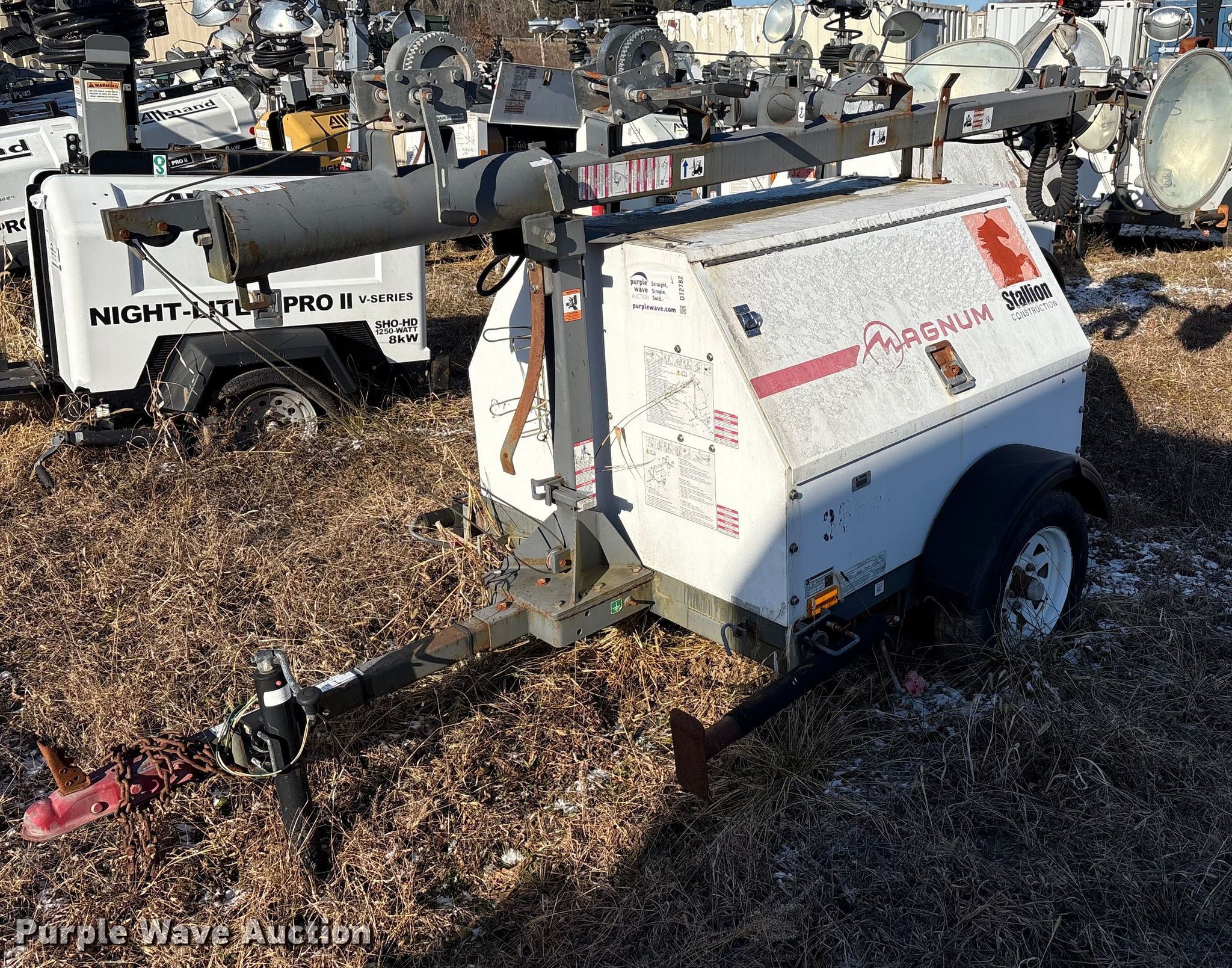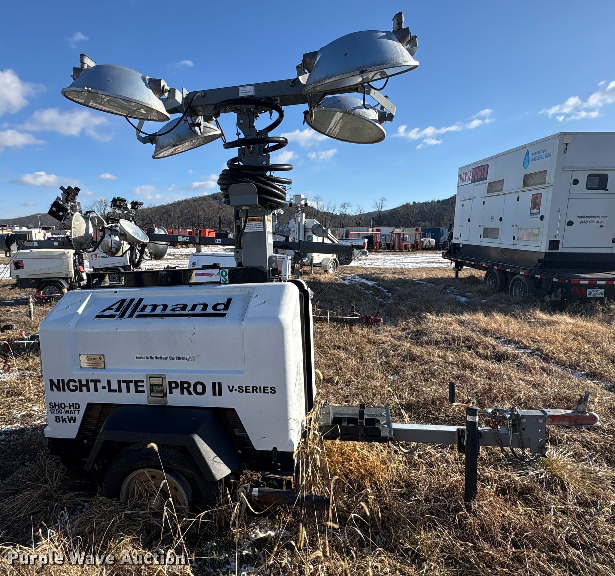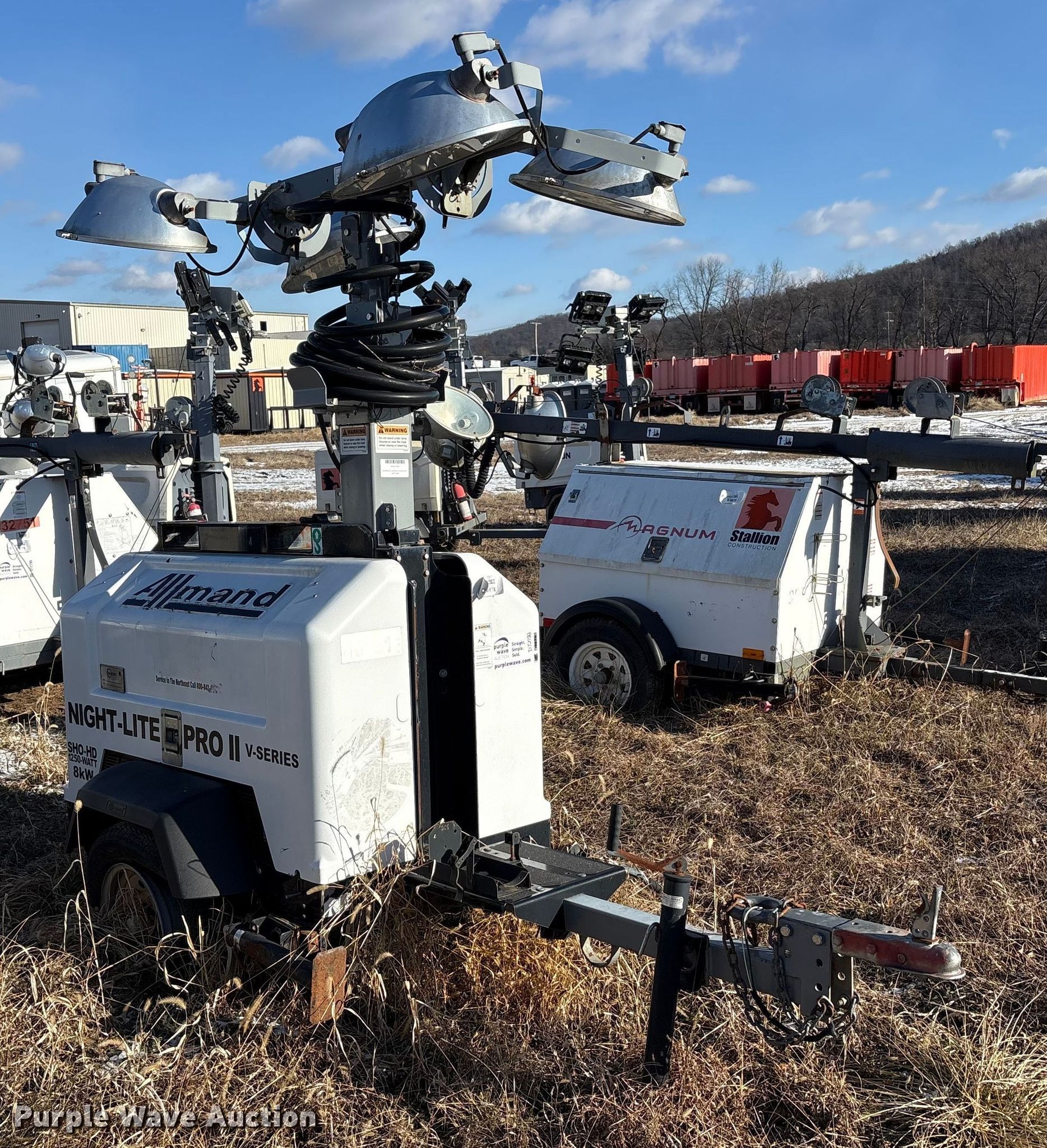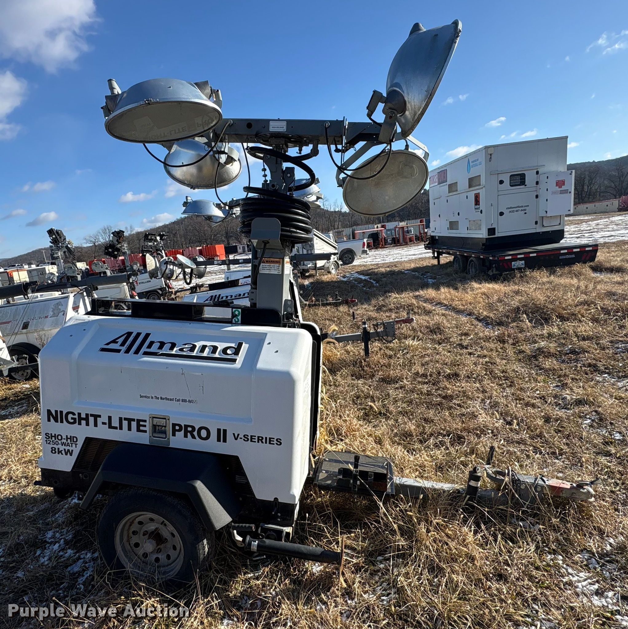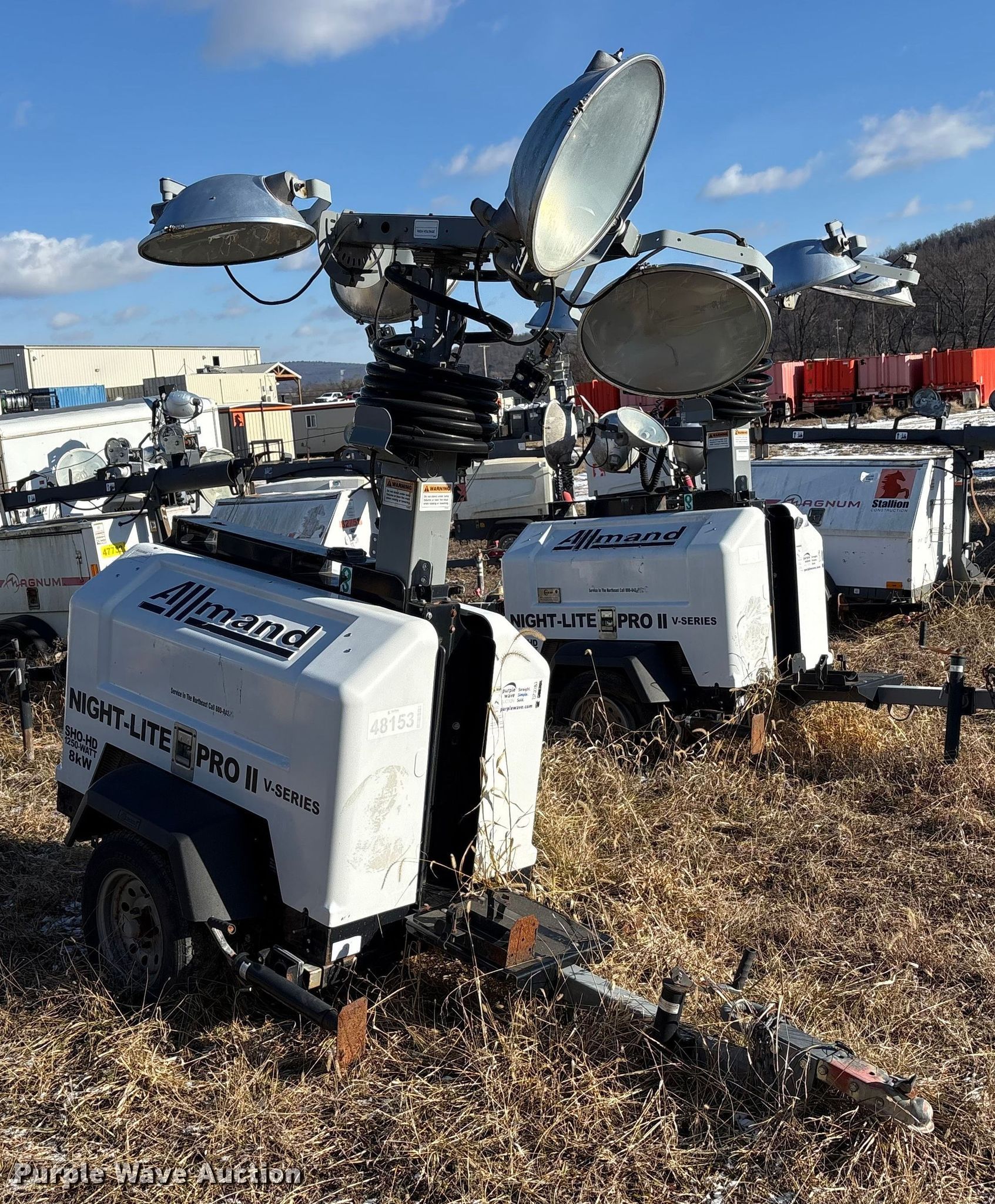 (4) light plants. Unit #: 38666, 48151, 48153, 48163. Magnum Power light plant Hours: 17,611, Serial: 5AJLS1617CB004147. Engine KW: 6 Phase: Single, Fuel type: Diesel, Cylinders: 3. Features Kubota D1005 generator Pancake, Light Plant Bulbs: 4, Hoist: Power. Trailer Axles: Single Suspension: Spring, GVWR: 1,910. Tires Size: 175/80D13. (3) Allmand Bros Night-Lite Pro II light plants Serials: 1765PR02V14, 1768PR02V14, 0547PRO2V14. Engine Kubota D1105, Cylinders: 3, Fuel type: Diesel. Features Athlon generator Phase: single, KW: 8. Trailer Axles: Single, Suspension: Spring. Tires Tire size: 175/80D13. Notes Unknown operating condition. This is worksite support equipment and will not come with a title. Transfer of ownership documentation will be a bill of sale. Stallion Infrastructure Services. Williamsport, PA 17701
